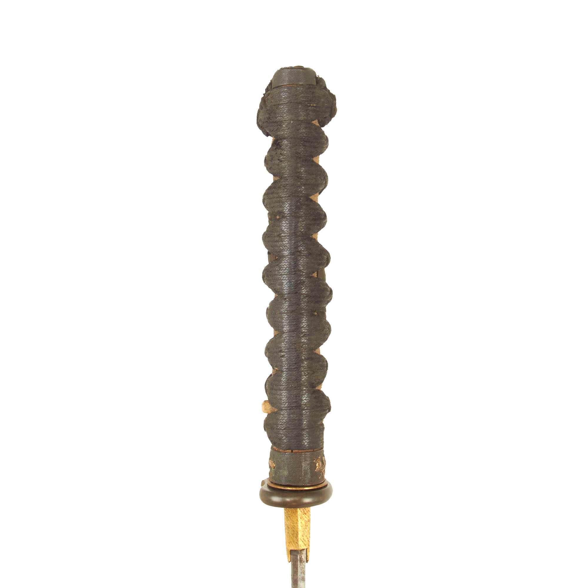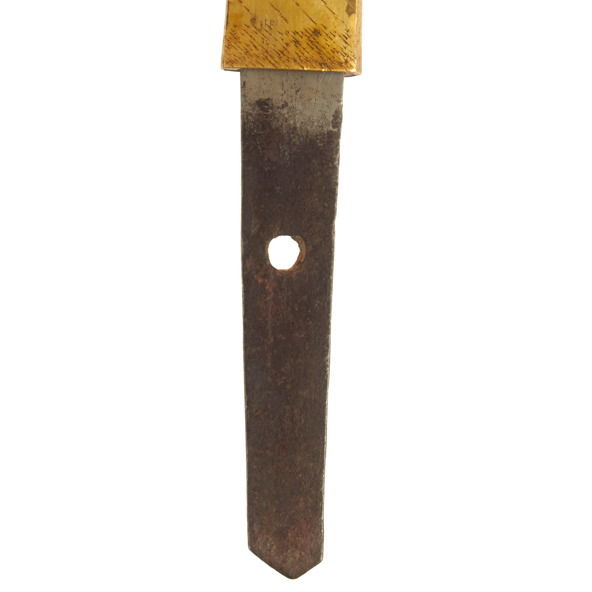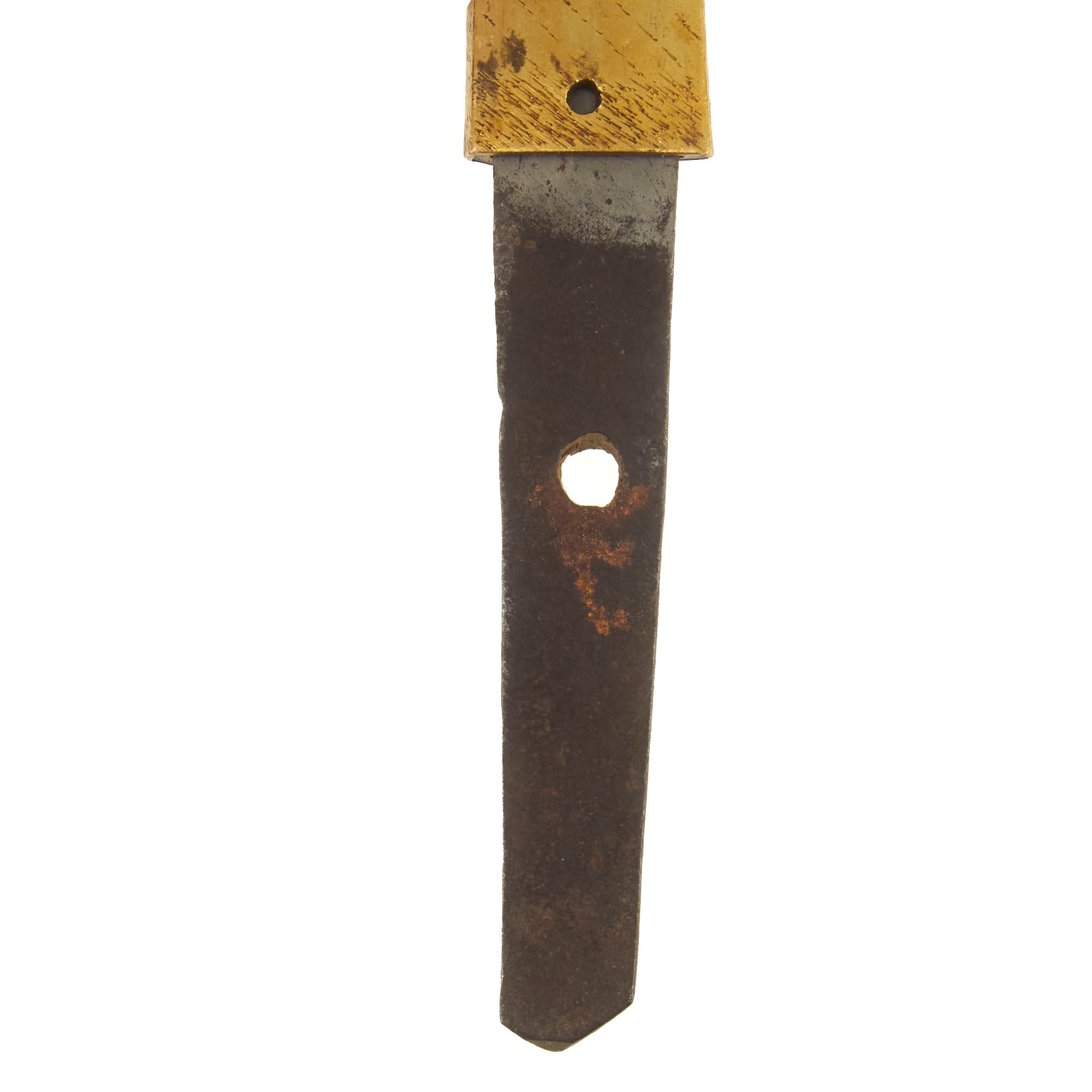 In spite of the condition of the polish, the blade still has a relatively clear clear SUGUHA (直刃 or straight) temper line (刃文 - HAMON), which is visible in the light. There are also blade wounds including WARE (lamination lines) and FUKURE (carbon pits), only possible on traditionally made blades. It has a futsu 普通 (regular) Nakago with an Iriyamagata (asymmetrical pointed) nakago-jiri (tang tip).