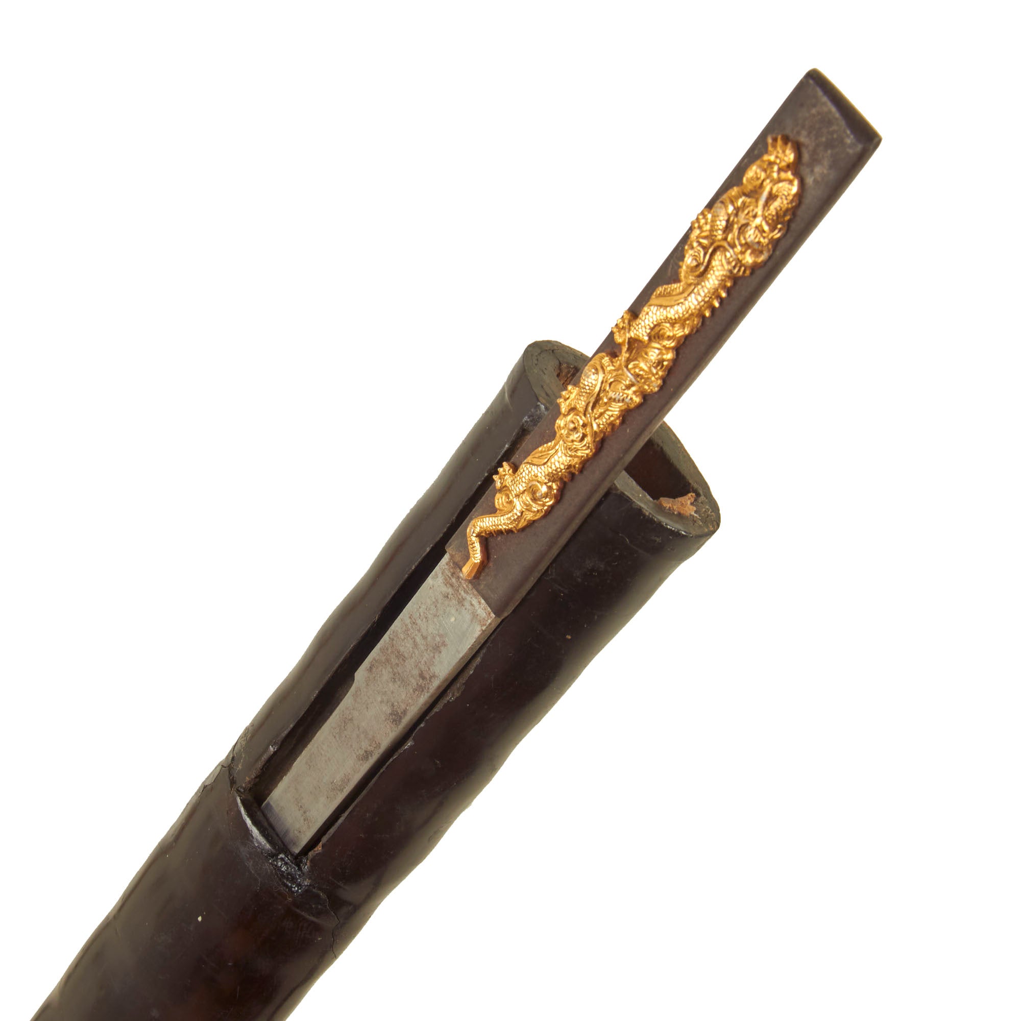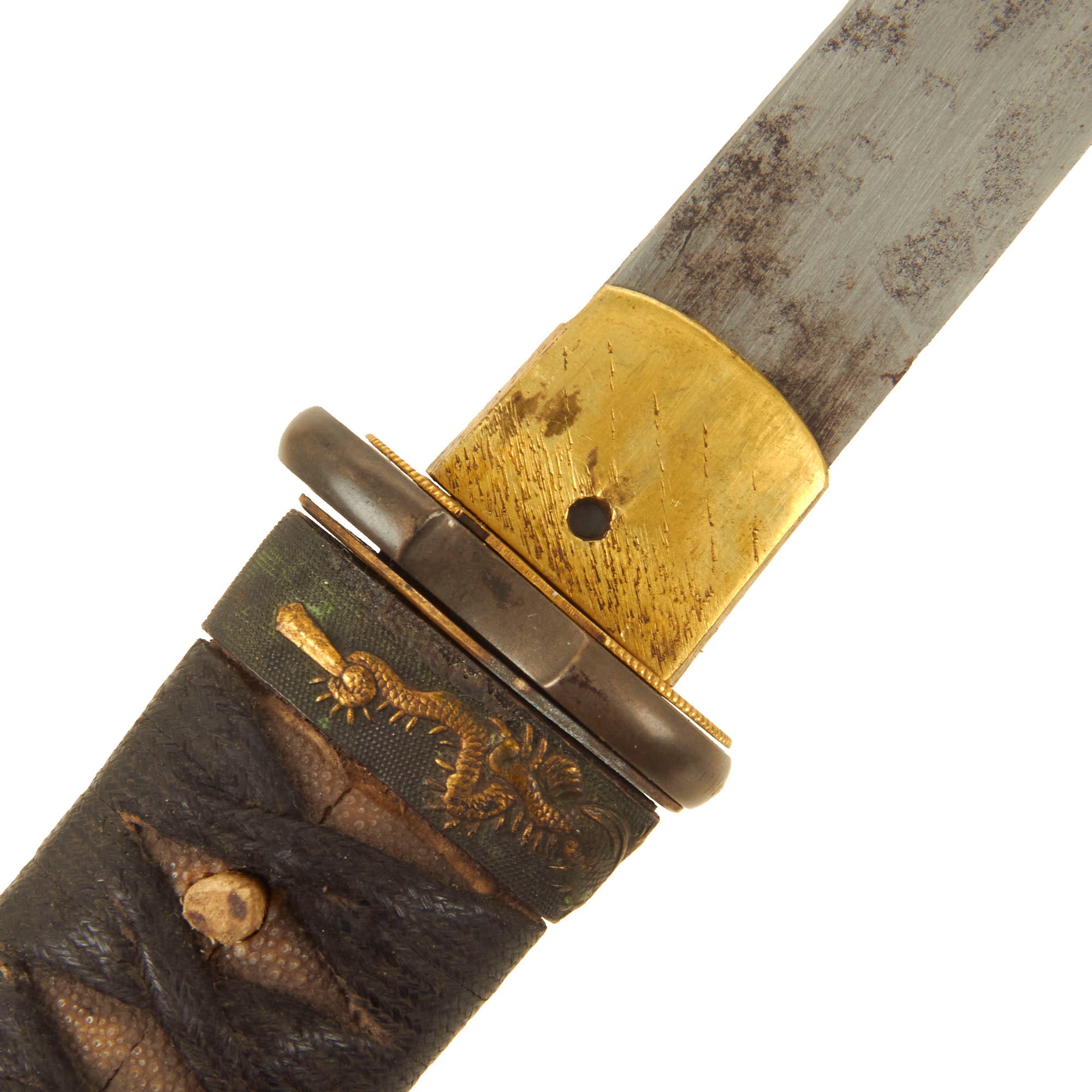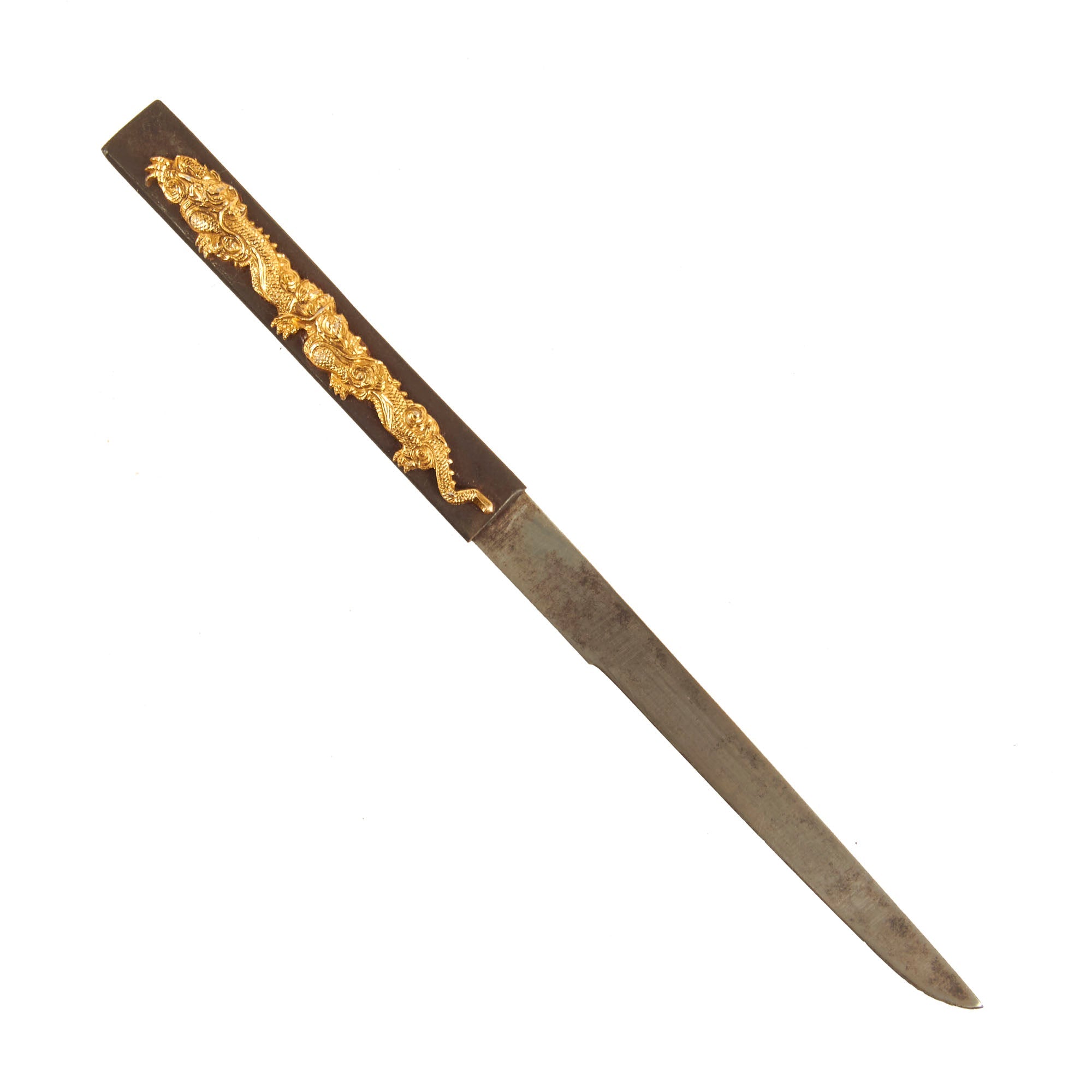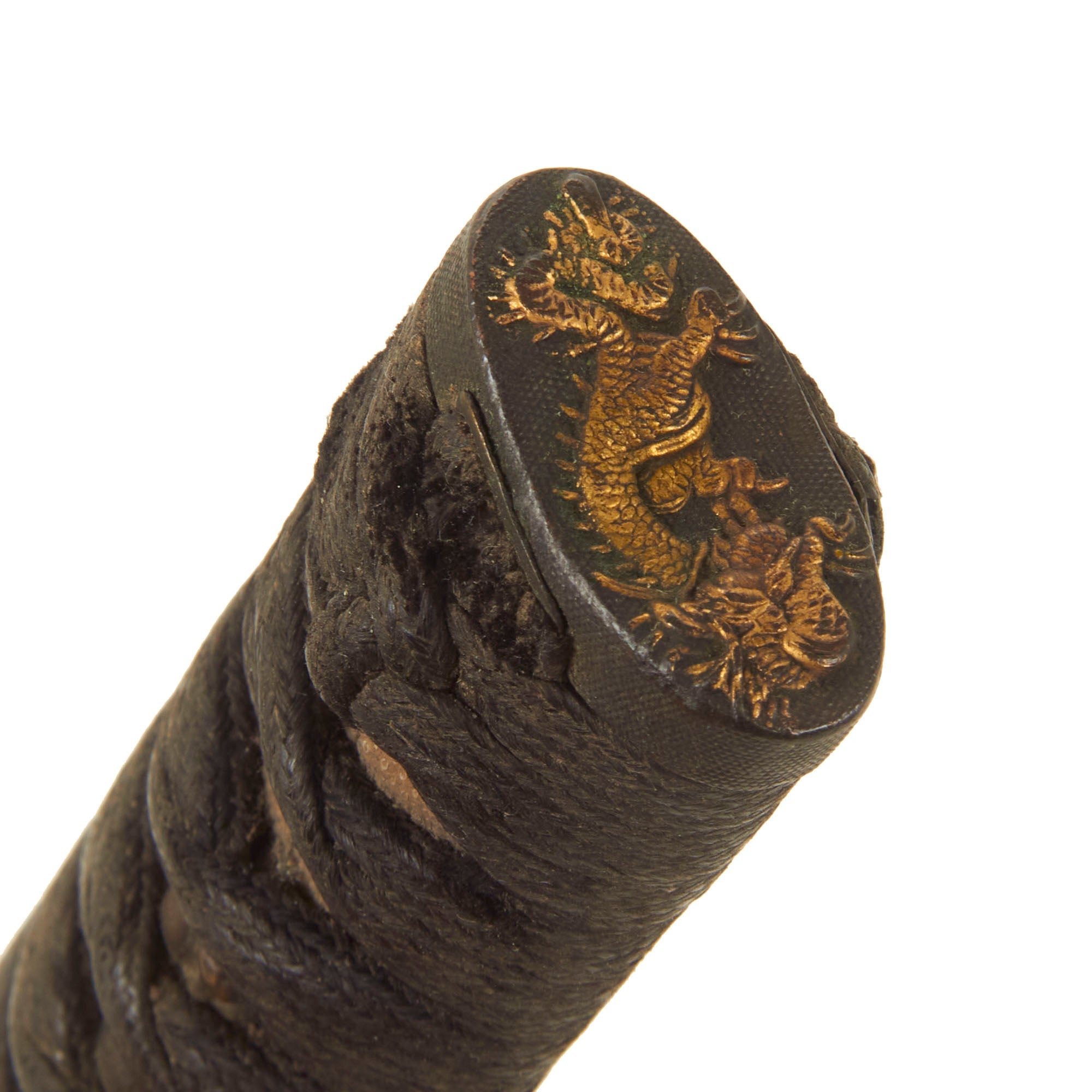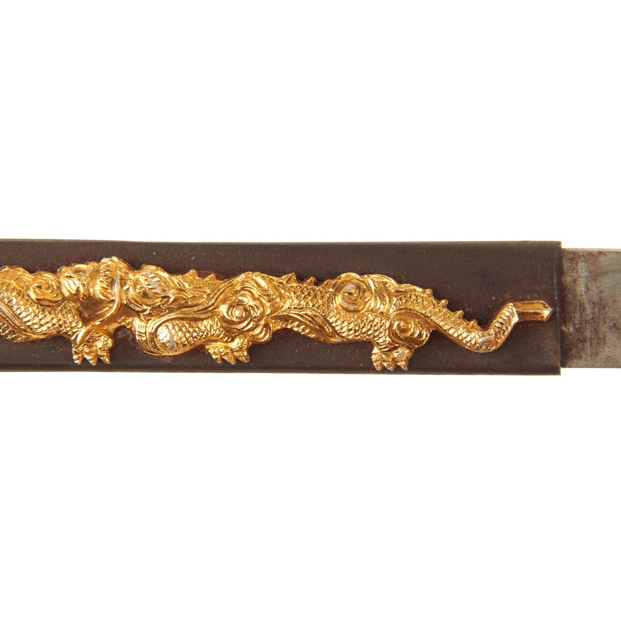 The included kogatana knife is fairly typical, and the kozuka handle has a dragon design matching the other fittings, though we believe the dragon is most likely a recent addition.