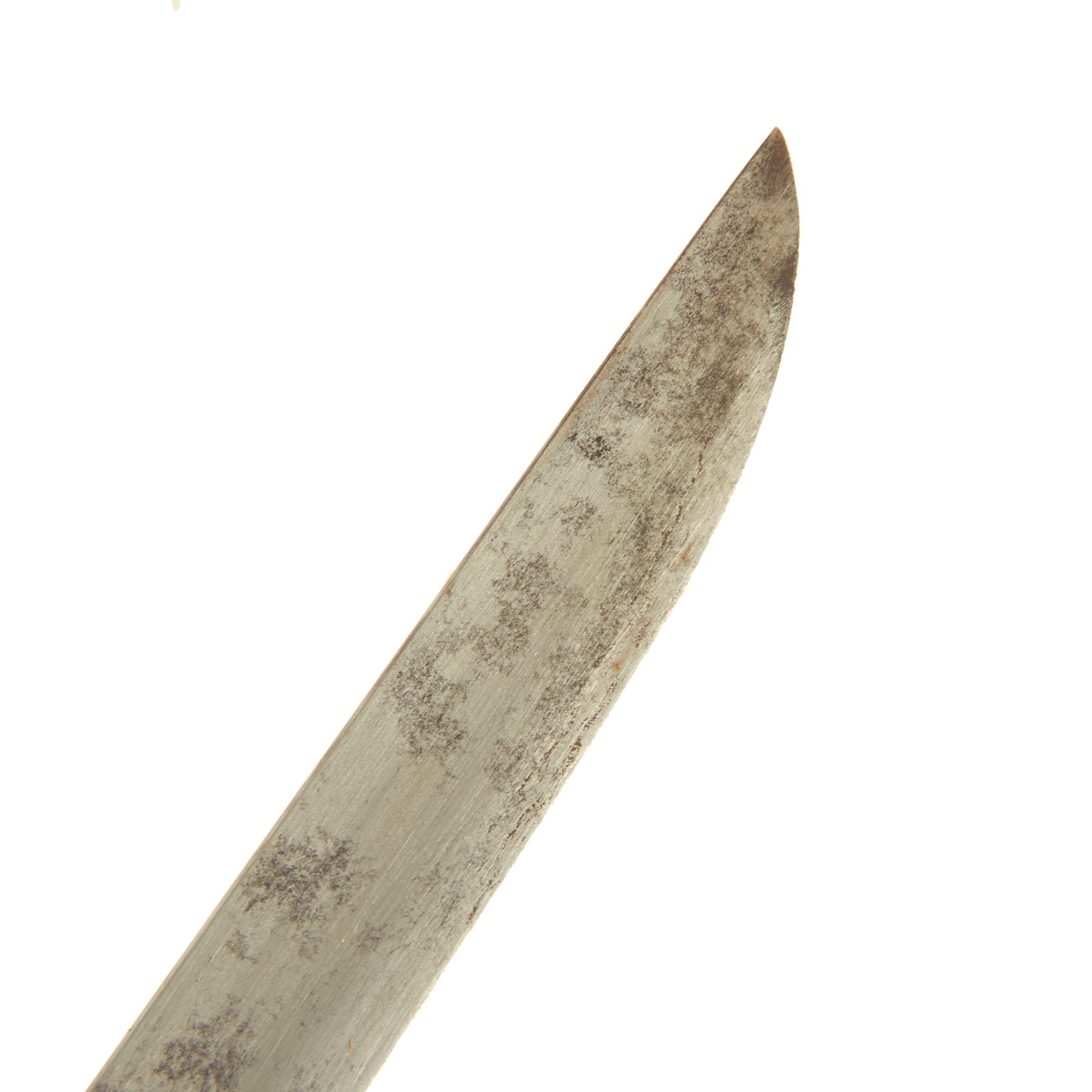 Offered in good condition, the blade of this example is in very nice, though it has definitely been some time since it was last properly polished. It has scattered oxidation and staining overall, and shows signs of past cleaning, which has made the aspects of the blade hard to see. Please note however that the edge is still quite sharp, so care is needed, and there are no nicks or other damage we can see. Blade length is approximately 9" and overall length 15 7/8".