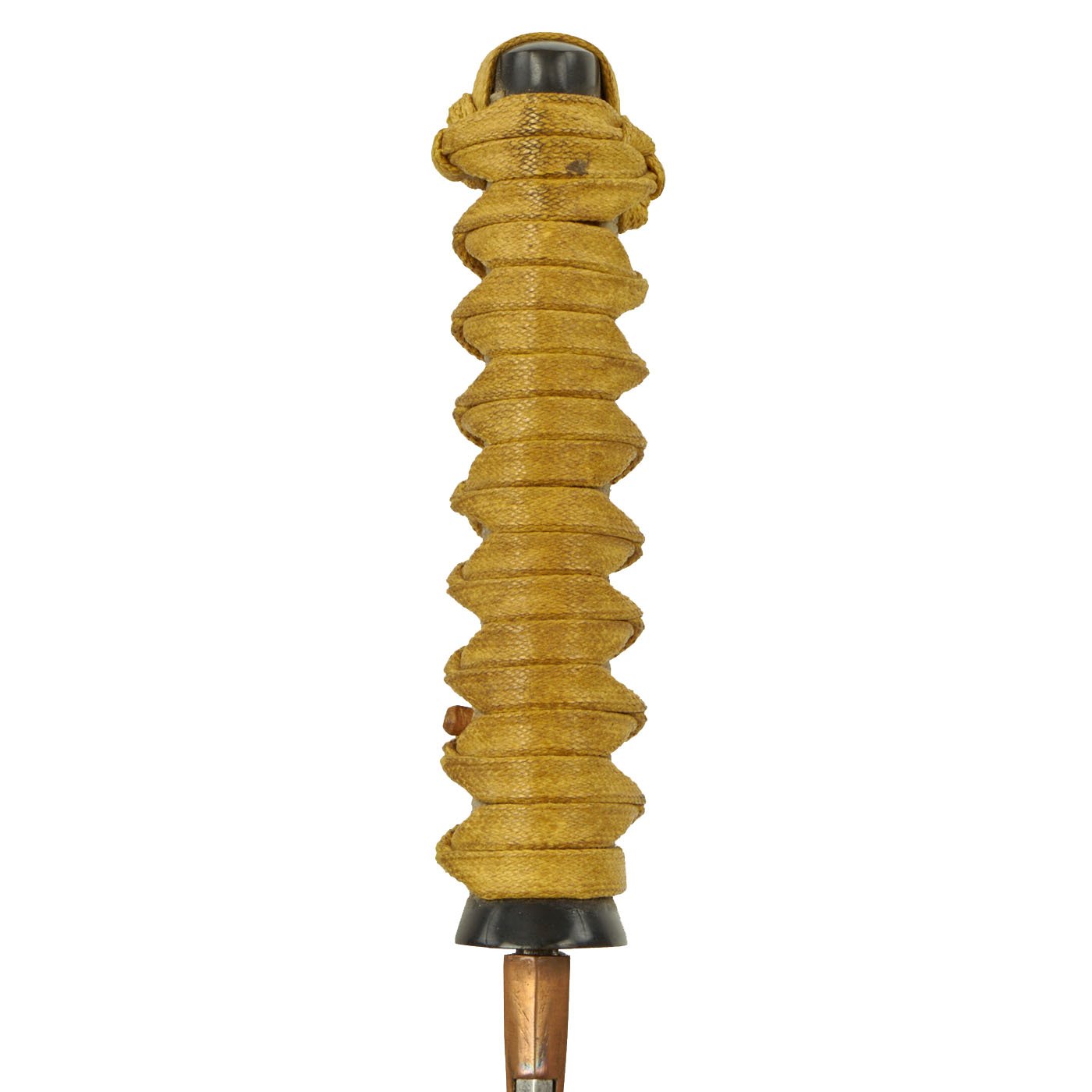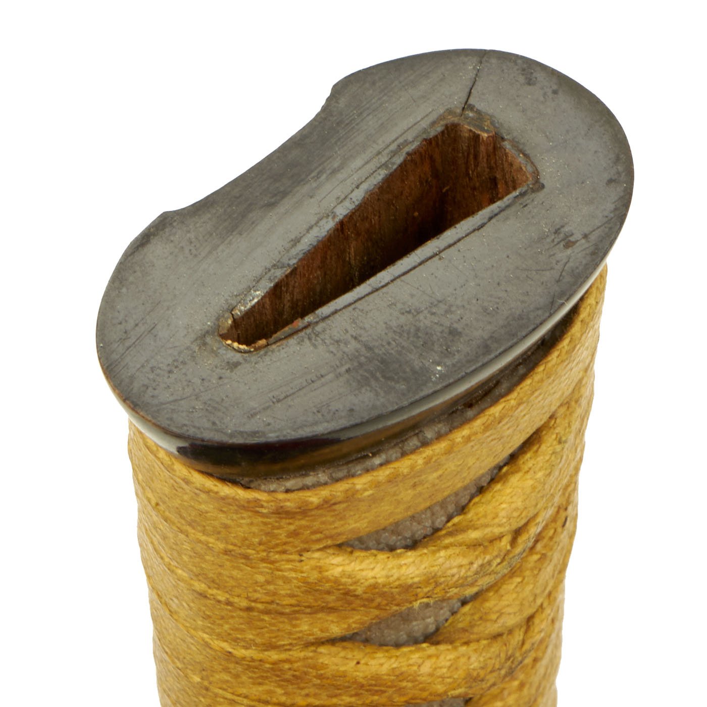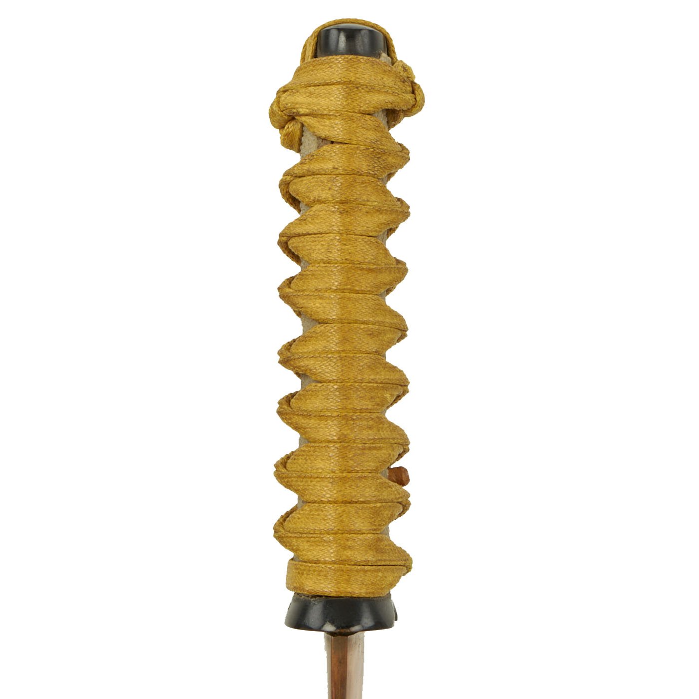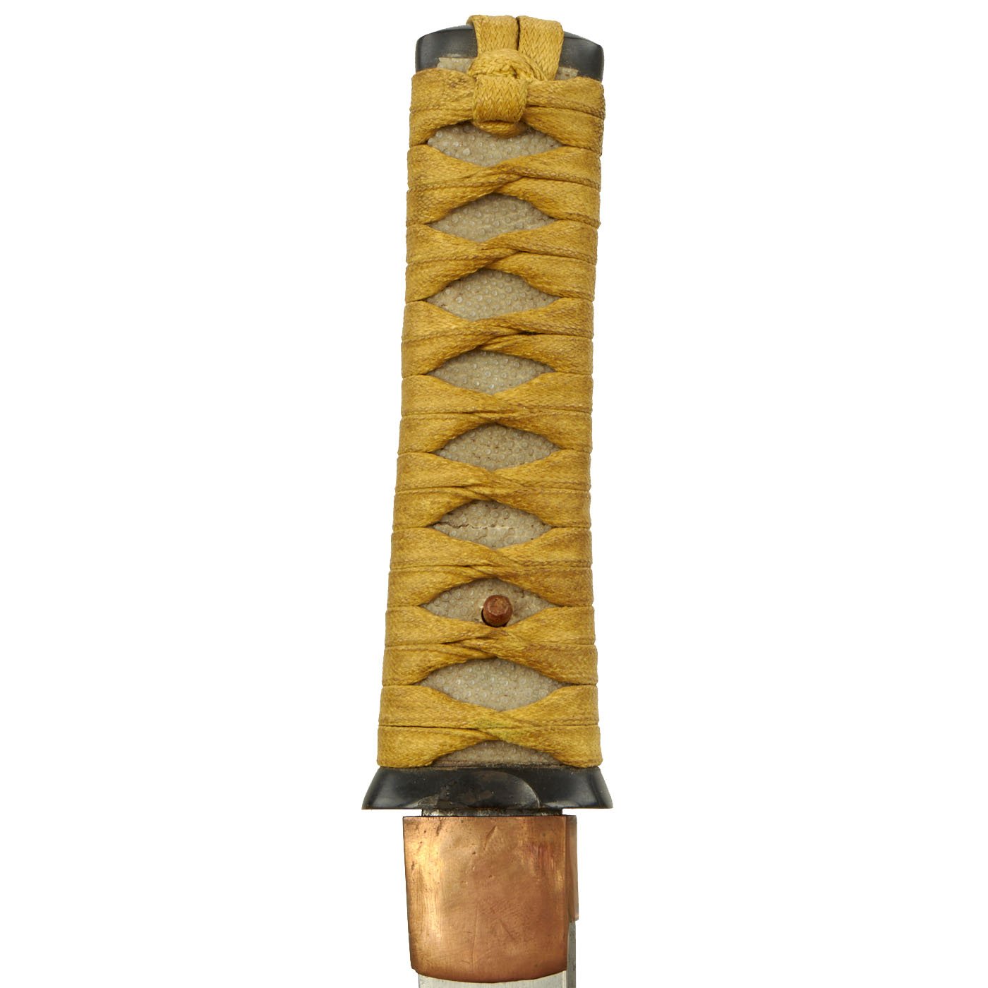 Offered in very nice condition, the blade does show significant use and cleaning since the last polishing. There are a few areas of light peppering and staining, and the edge is not really sharp, though there are no nicks or other major issues. Blade length is approximately 11" and overall length 17". Futsu 普通 (regular) Nakago with Haagari (asymmetrical rounded) nakago-jiri