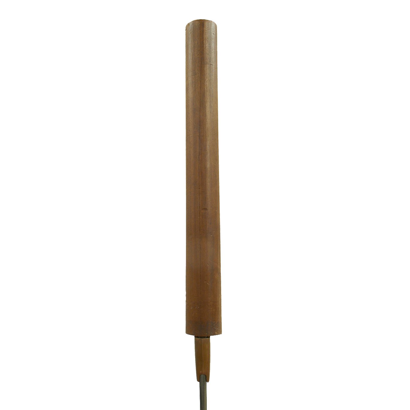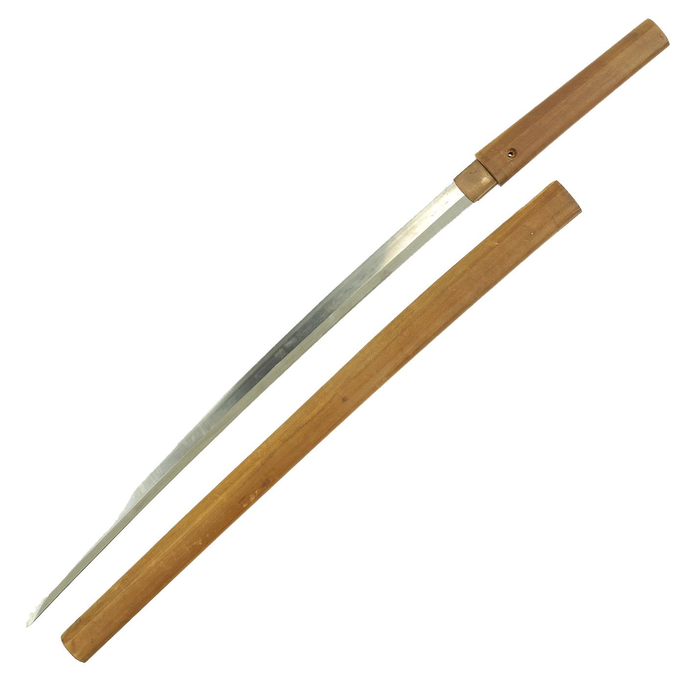 This sword is mounted in a "resting scabbard" or Shirasaya, which is intended for storing the blade when it is not in use. The hilt is in good worn condition with no splits, while the scabbard has some missing wood chunks, and is split at the seam as well, with other cracks.