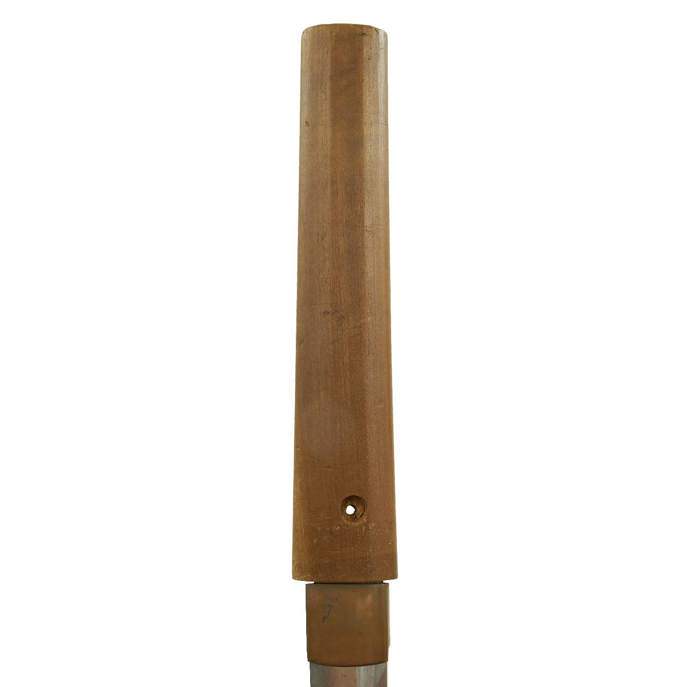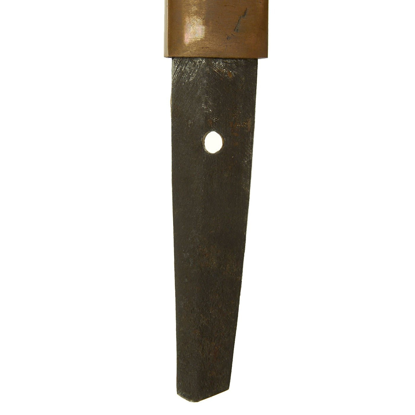 Offered in very good condition with some small areas of discoloration, it is still quite sharp and has only a few small nicks. Blade length is approximately 24 5/8" and overall length 34 3/4". The blade is hand made, with multiple lamination lines clearly visible, and a clear "wave" "(hamon) temper line. The tang is of the "normal" (futsu) style with an asymmetrical pointed end (irayamagata). This is a typical classic design for the tang (nakago), and it has wear and patina indicating that it is quite old.