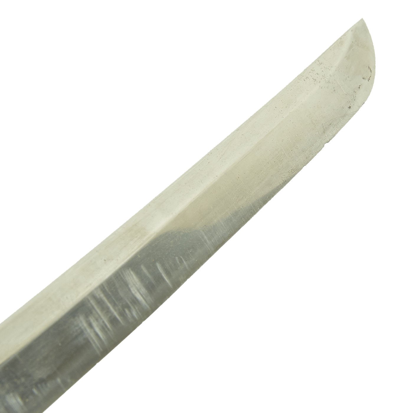 The blade does have several flaws, known as kizu or "wounds" in the blade. These are from delamination of the folded steel, caused by air-bubbles during the forging process. They are somewhat common, and proof that the blade is hand-made. The lines are known as "splits" (ware), and there are also several "blisters" (fukure). The blade does have some minor corrosion on the edge and blade body.