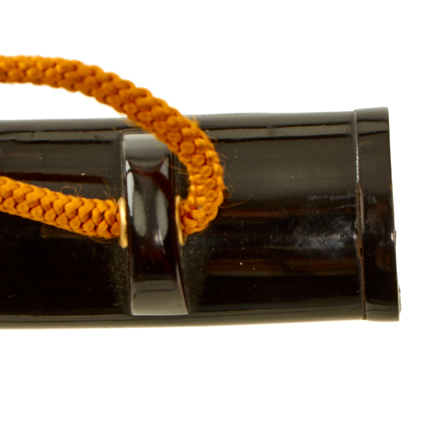 The TSUKA (handle) is a simple black lacquered example, with a nice composite KASHIRA end cap. There is a simple brass HABAKI blade collar on the blade, with no spacers or other components. It is held on by a single peg, which is a recent replacement. The SAYA (scabbard) is black lacquer and matches the handle well. It has a KURIKATA knob with a small brass SHITODOME fitting, and has a SAGEO sword cord threaded through it.