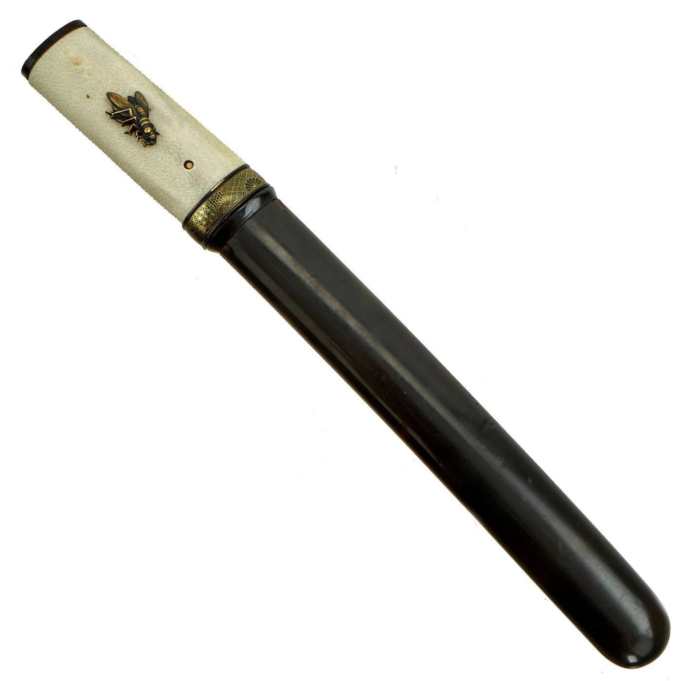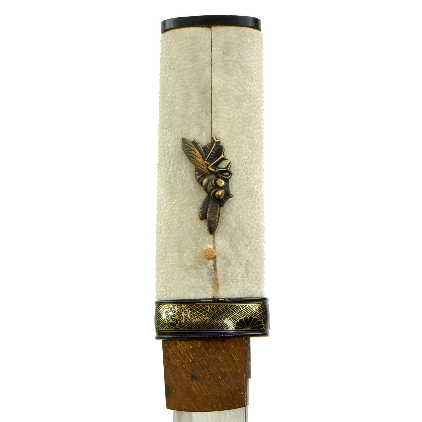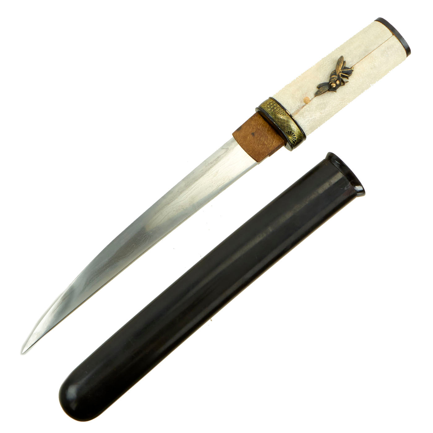 The Tsuka (handle) looks to be a more recent replacement, and has what look to be cricket or cicada menuki attached to the stingray skin grip (SaMe). The blade collar (habaki) is brass, and has a nice "rain" pattern embossed on it. The handle is a bit loose, and could probably benefit from a larger mekugi-ana for a better fit to the tang. The handle is held on by a single recent production mekugi (Peg), and the saya (scabbard) is a simple black lacquered type, correct for a kaiken.