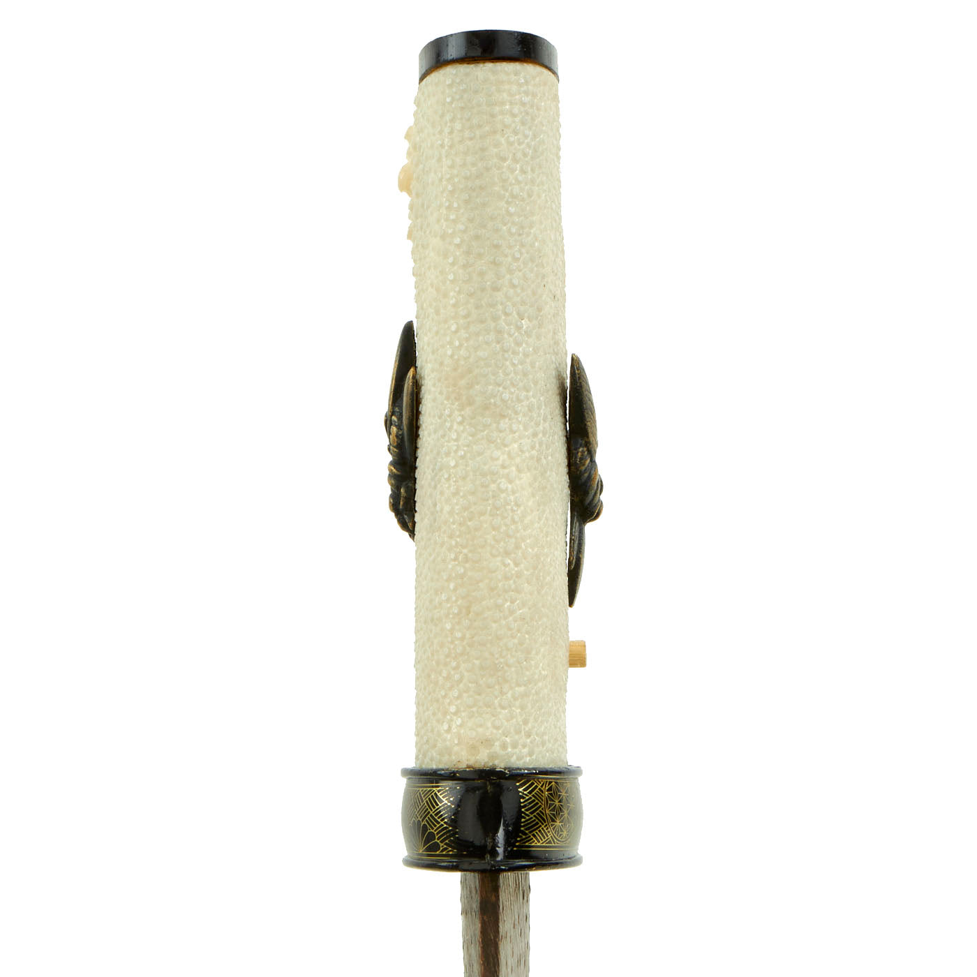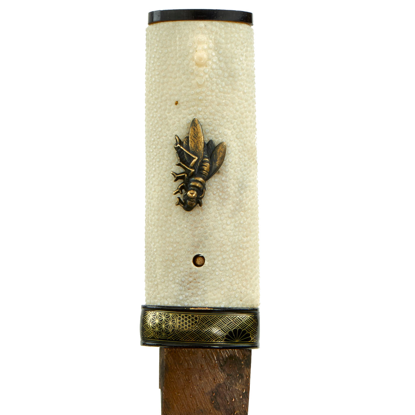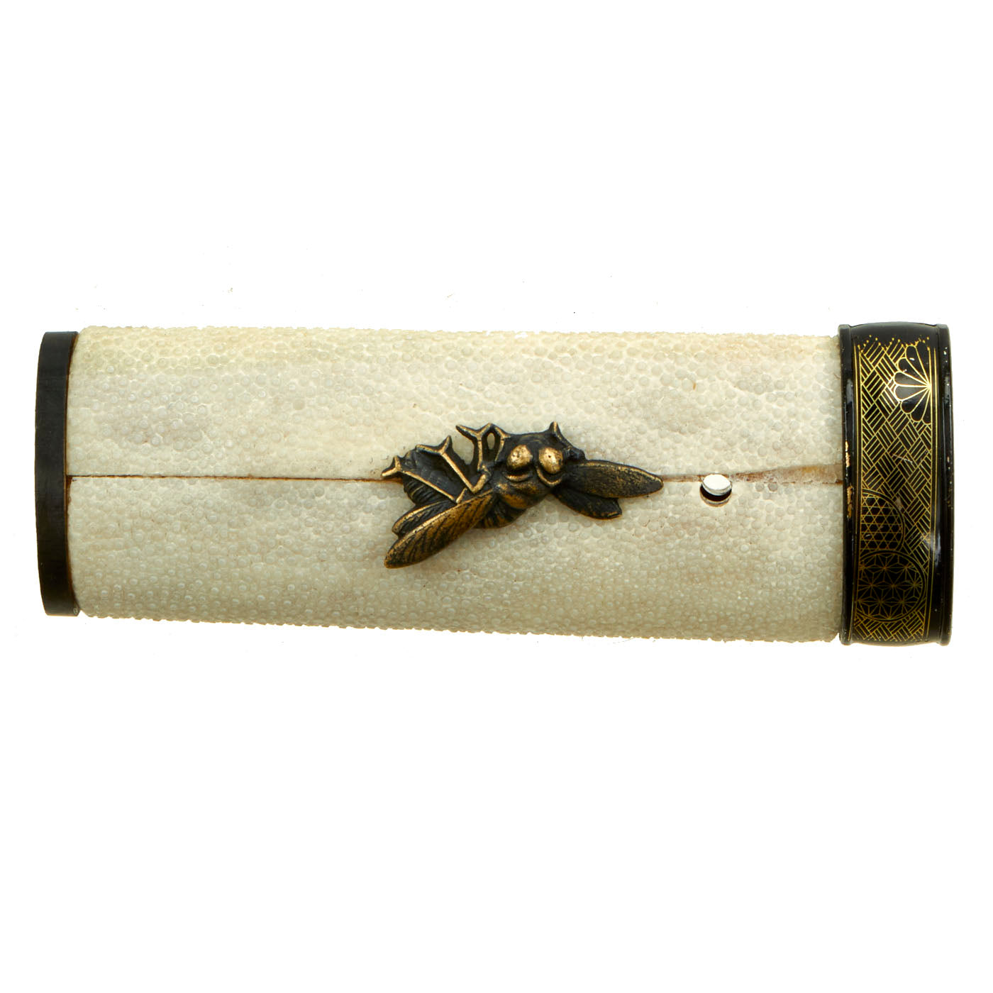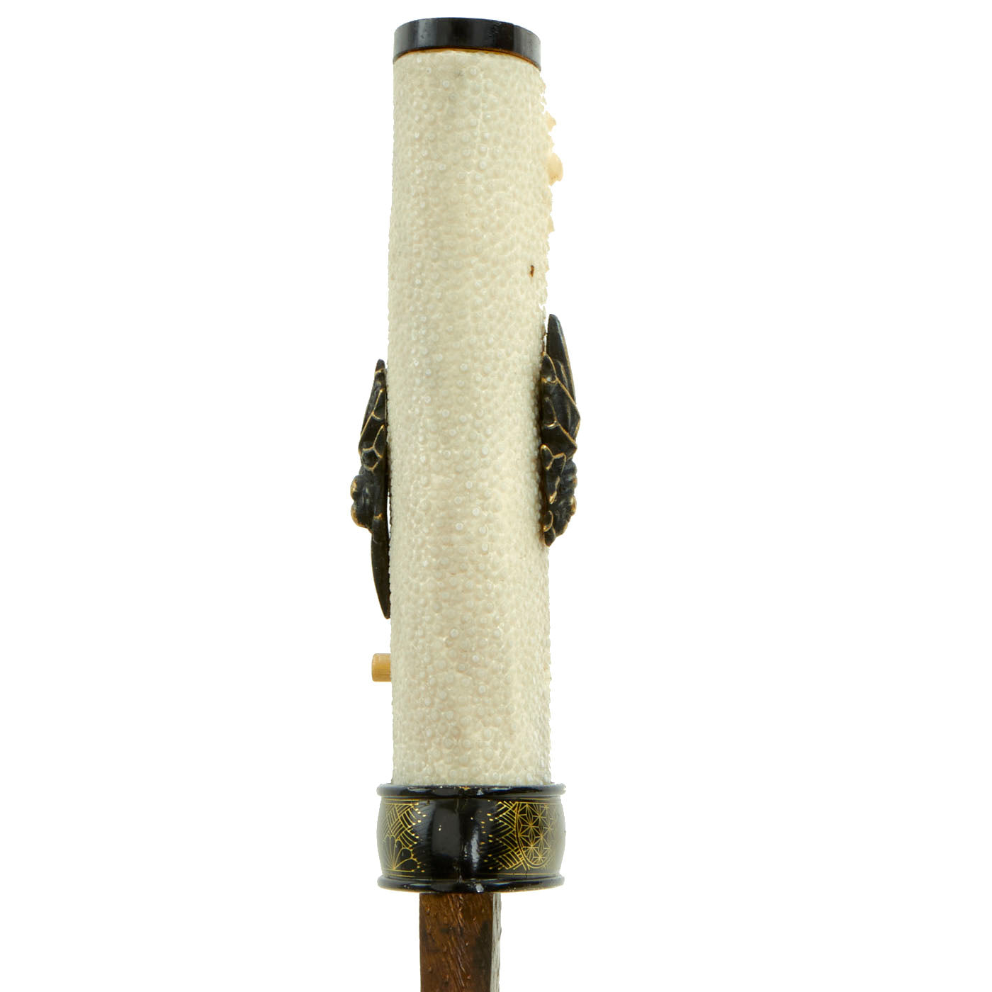 The Tsuka (handle) looks to be a more recent replacement, and has what look to be cricket or cicada menuki attached to the stingray skin grip (SaMe). The blade collar (habaki) is brass, and has a nice "rain" pattern embossed on it. The handle is a bit loose, and could probably benefit from a larger mekugi-ana for a better fit to the tang. The handle is held on by a single recent production mekugi (Peg), and the saya (scabbard) is a simple black lacquered type, correct for a kaiken.