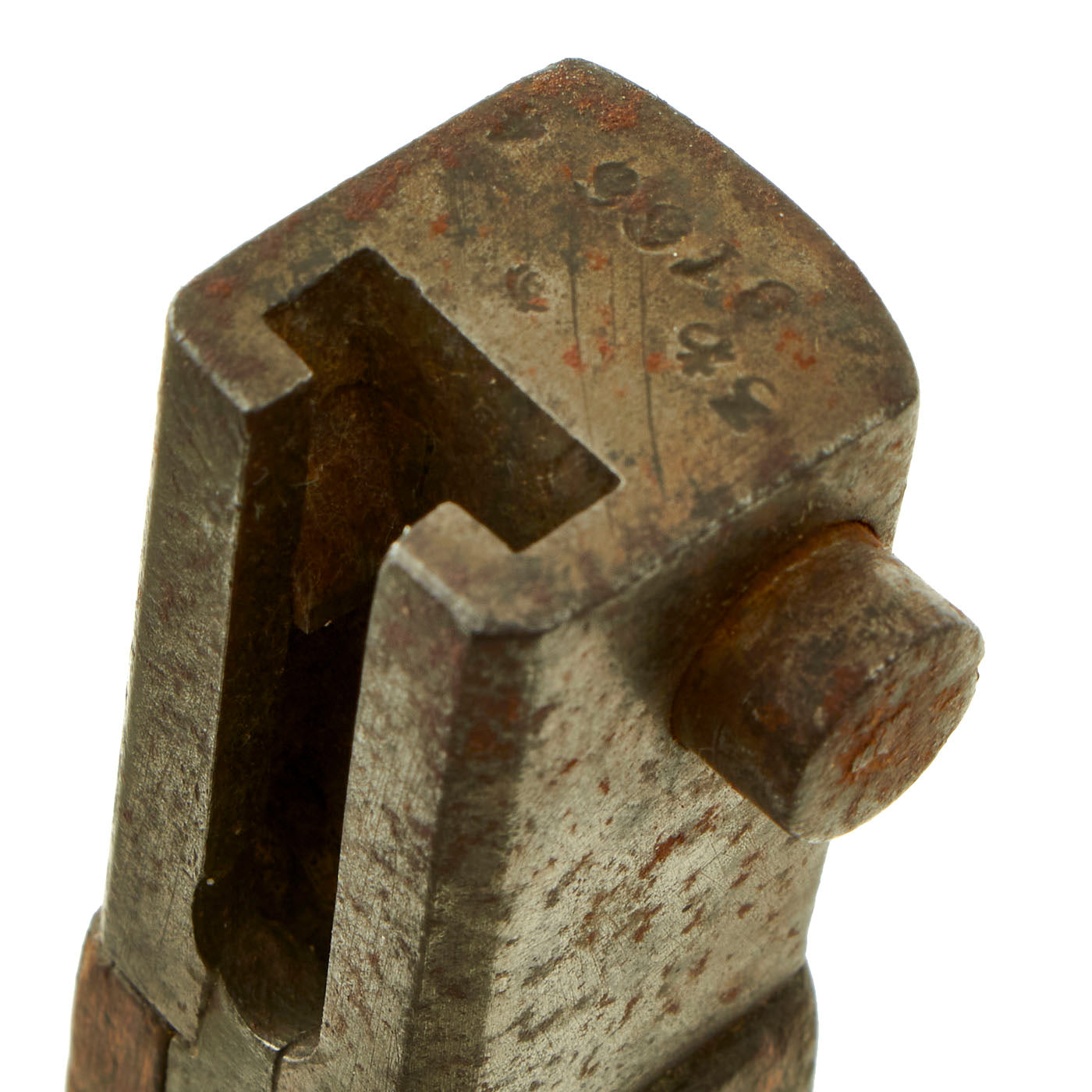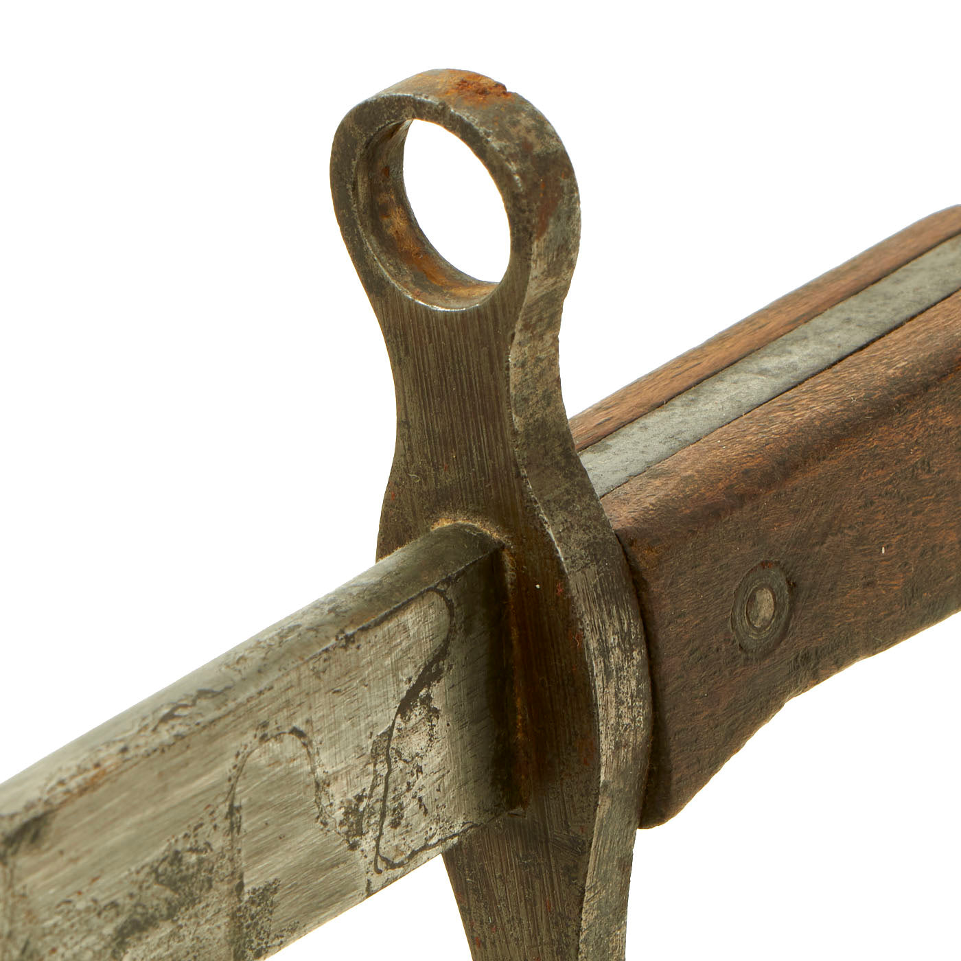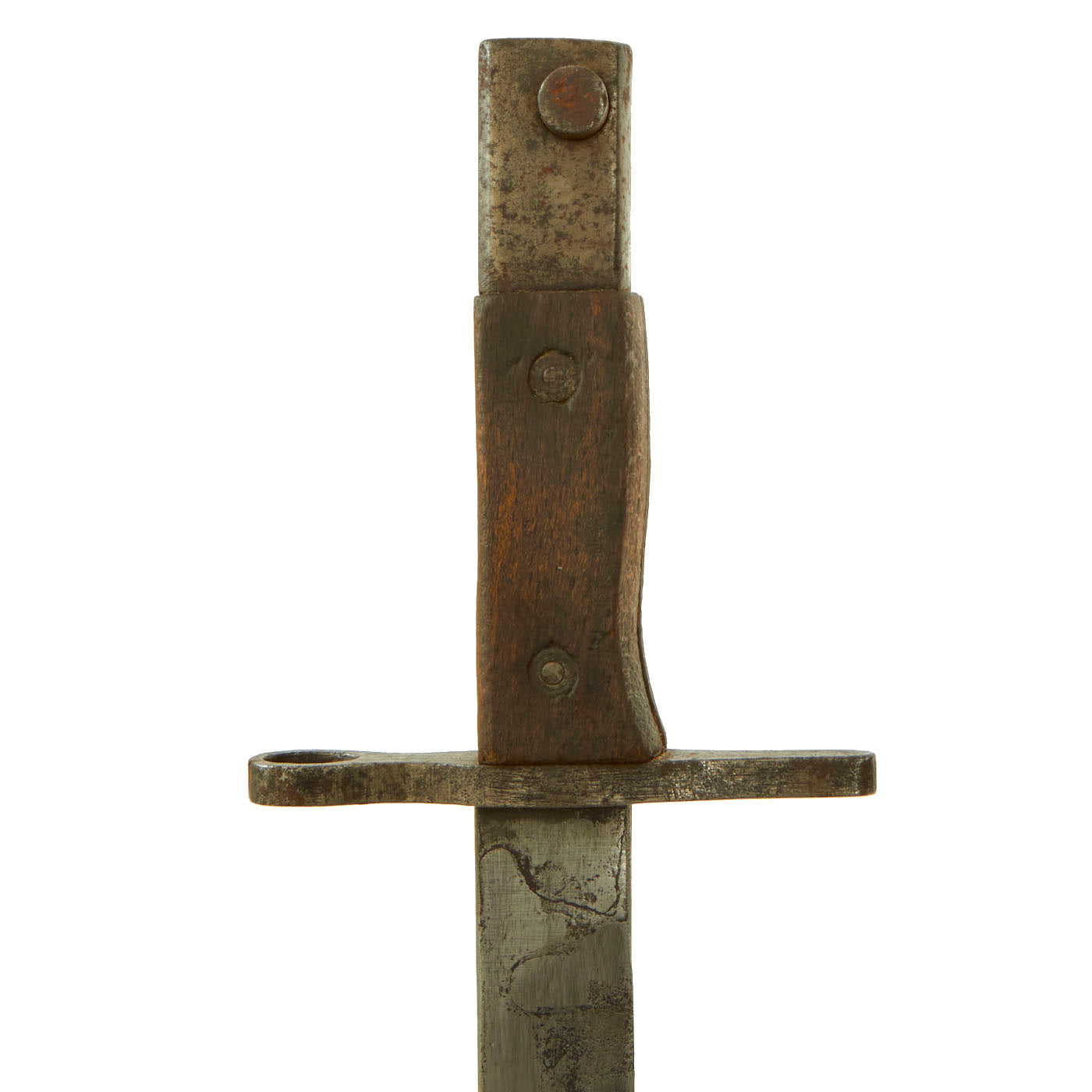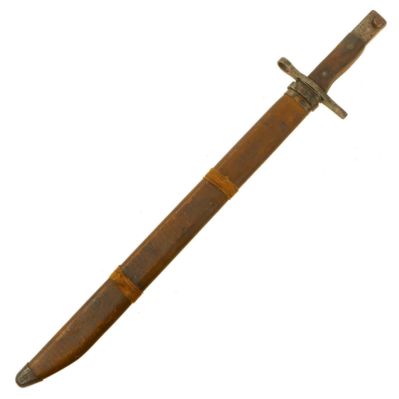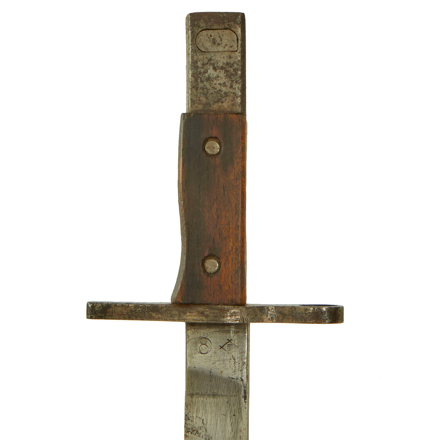 Original Item: Only One Item Available. This is a nice late WW2 "last ditch" issue Japanese Model 30 Arisaka rifle bayonet with straight cross guard and blade bearing arsenal markings indicating manufacture by Toyoda Jidoshoki Seisakusho (Toyoda Automatic Loom Works) under Nagoya Arsenal supervision. This bayonet is of the Later War design, with a straight quillon, with the final style flat-sided rectangular pommel. The rivet-retained wooden grip is contoured and wraps around the tang. The blade is flat without fullers and not blued, and the crossguard is straight but still contoured on the side, which makes this the second-to-last pattern made at Toyoda Automatic Loom Works. Base of the bayonet is marked with serial number 31664.