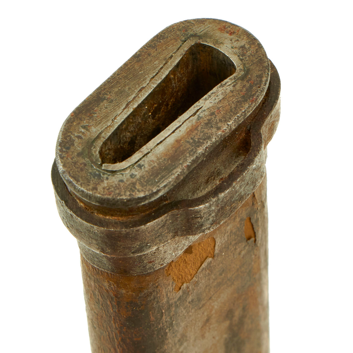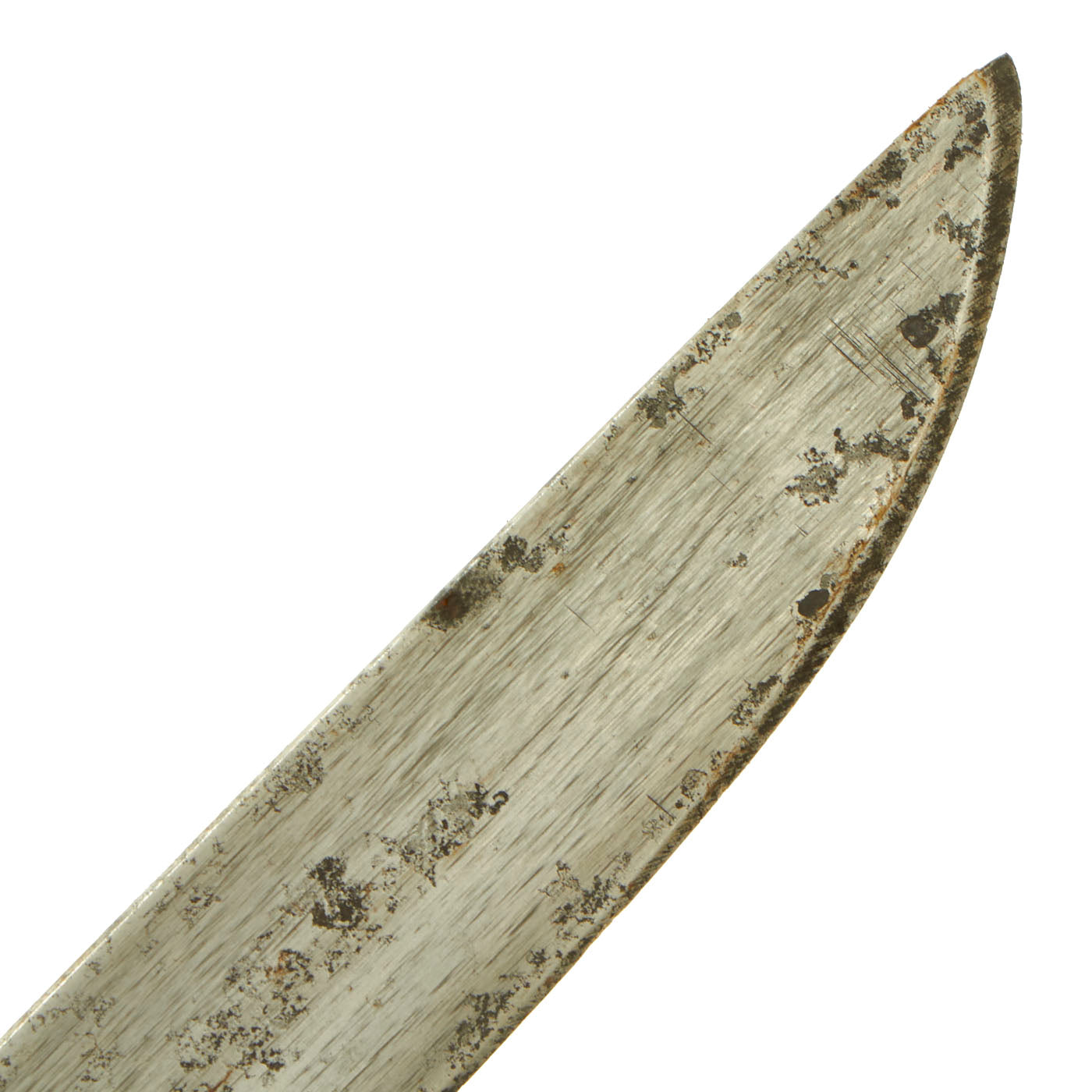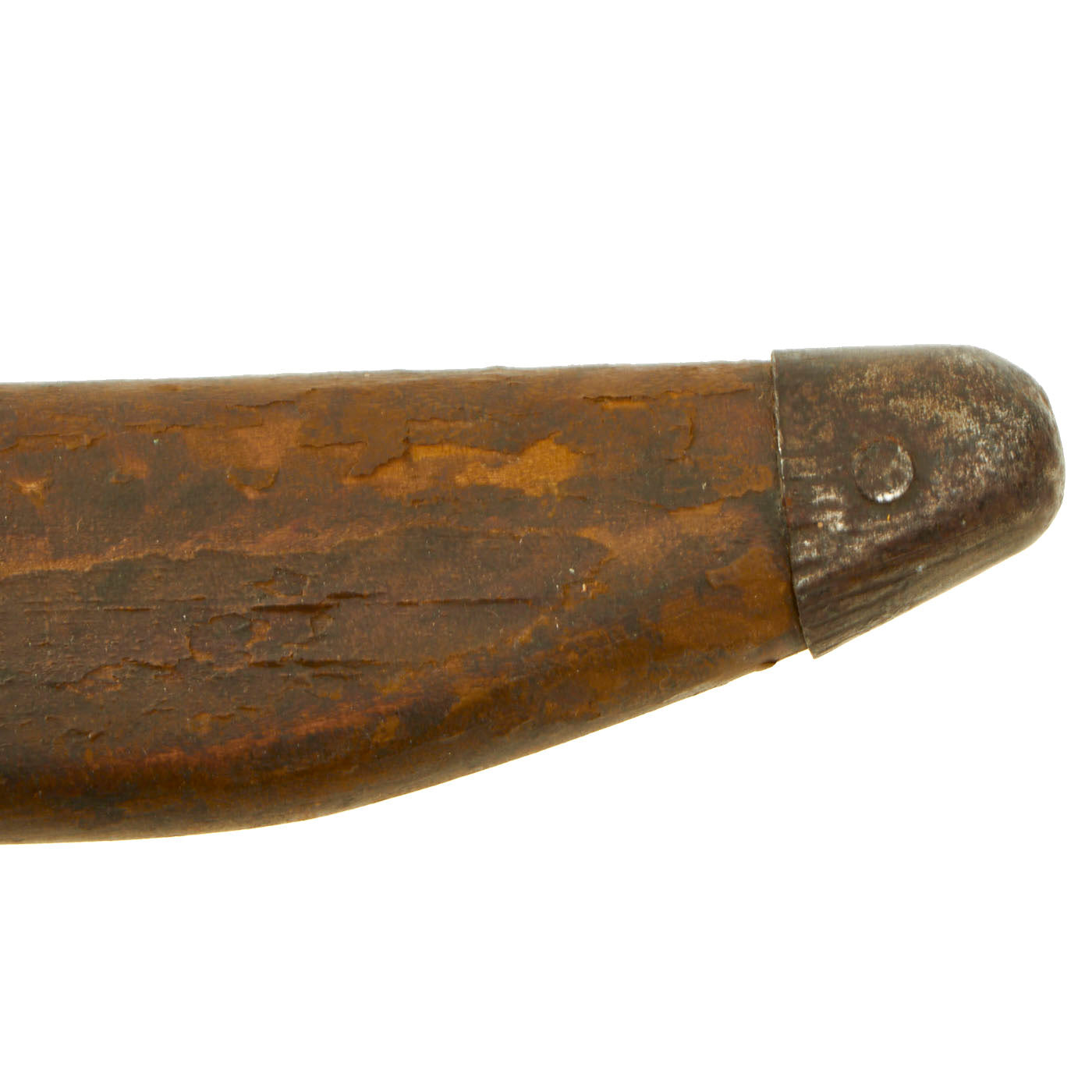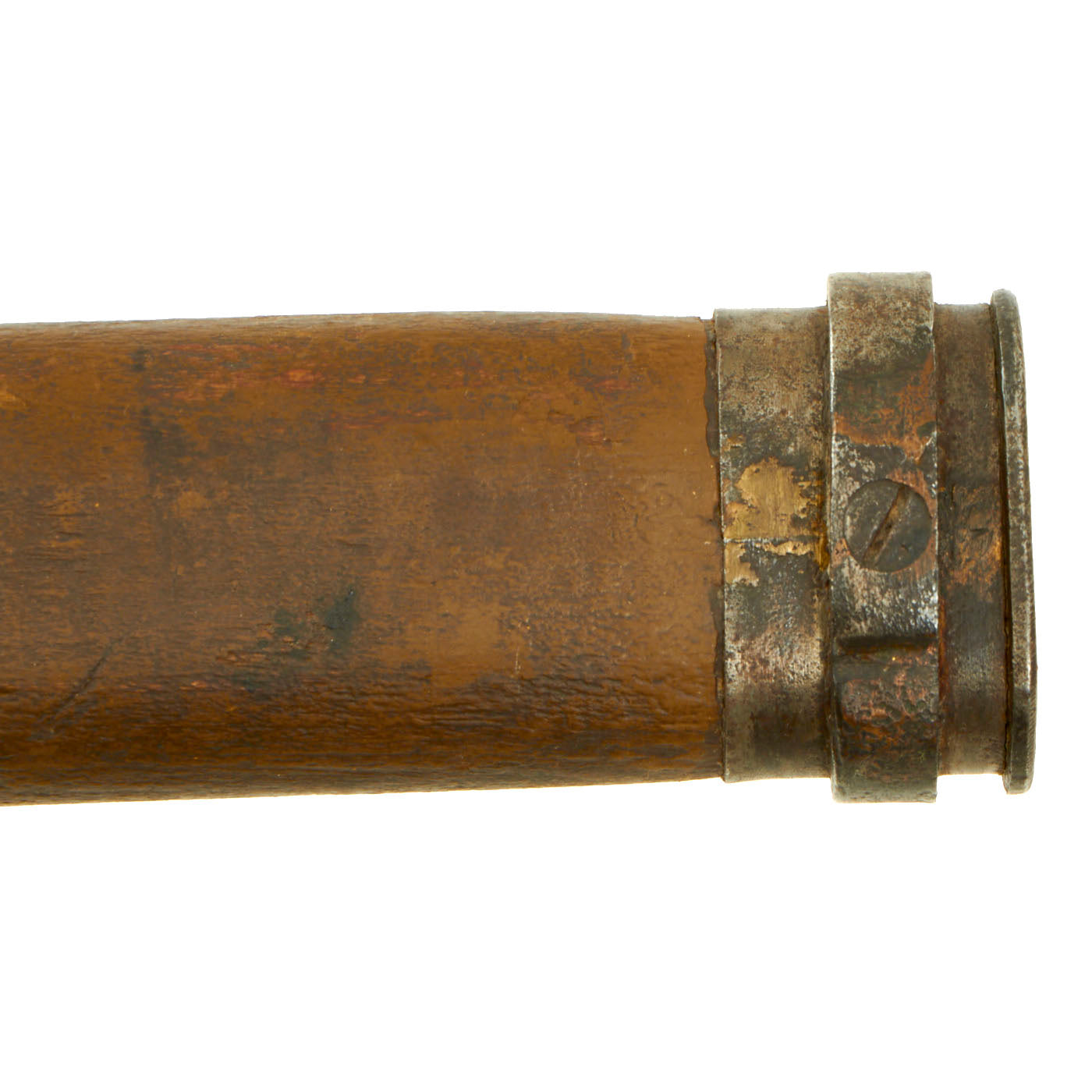 The bayonet comes complete with a metal fitted wooden "last ditch" scabbard, made from two pieces of wood bound with string wrappings. Condition of bayonet is very good, though the blade is only partially sharpened, typical of rushed late war production. There are no nicks in the blade, and it appears to have not really been used but there is pitting scattered throughout. Last ditch bayonets in this condition are extremely rare, as most were discarded, and the wooden scabbards are much less resilient than the steel ones.