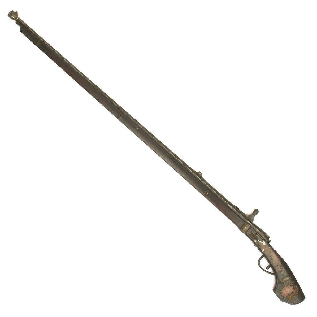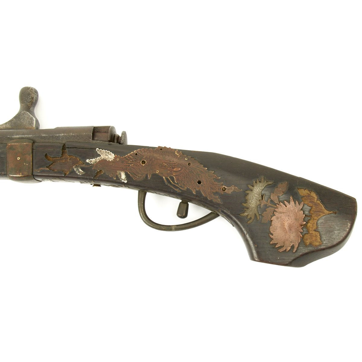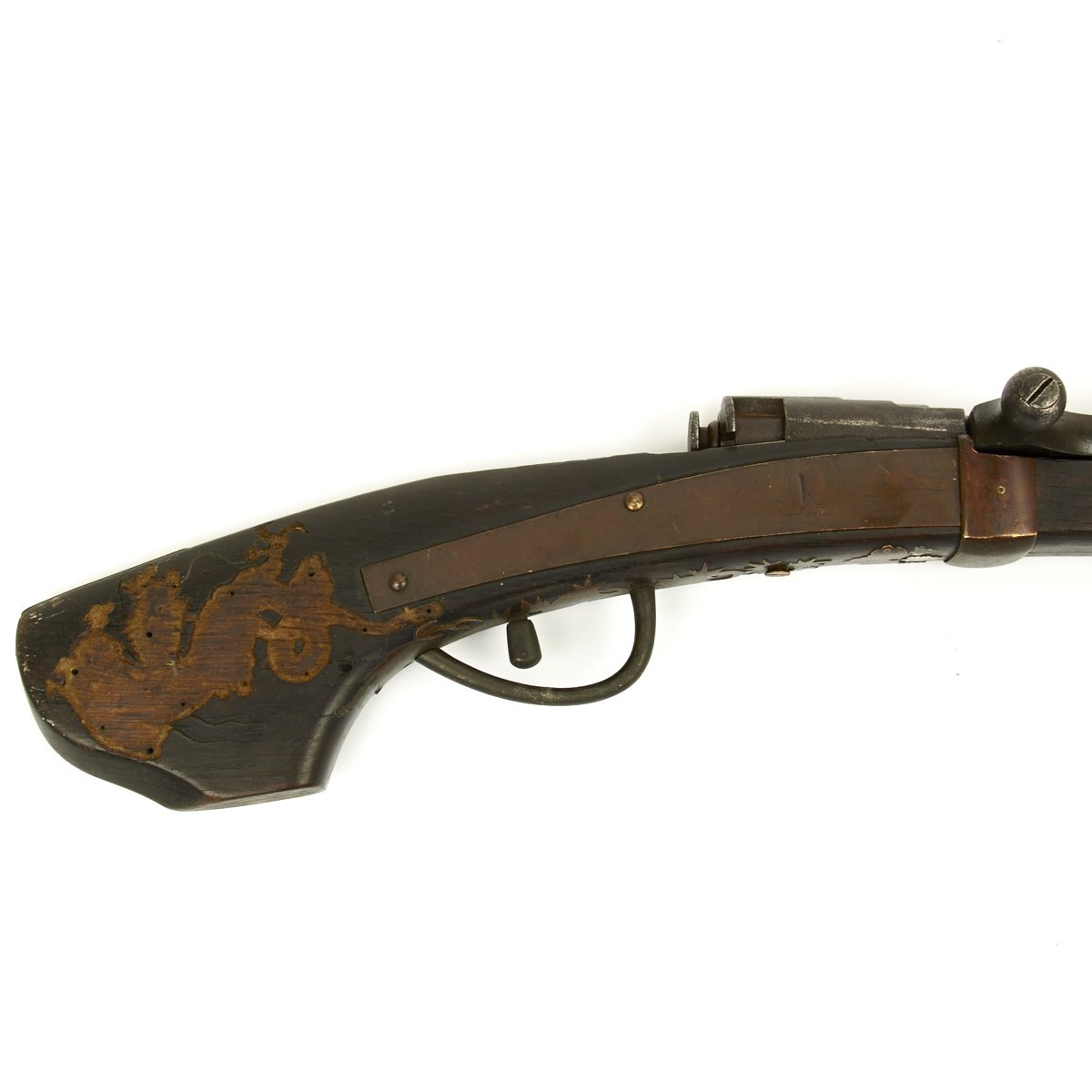 Original Item: Only One Available. This is an extremely interesting weapon. It started life probably in the late 1700s or early 1800s being constructed as a matchlock firearm using black powder and a very primitive ignition system. These were often referred to as Tanegashima (種子島), after the island where a Chinese junk with Portuguese adventurers on board was driven to anchor by a storm in 1543. The local lord purchased two matchlocks from the Portuguese, and then had his swordsmith copy the weapon. Some parts of the process were problematic, so a Portuguese blacksmith was brought over to assist, and the guns were completed, with much success.