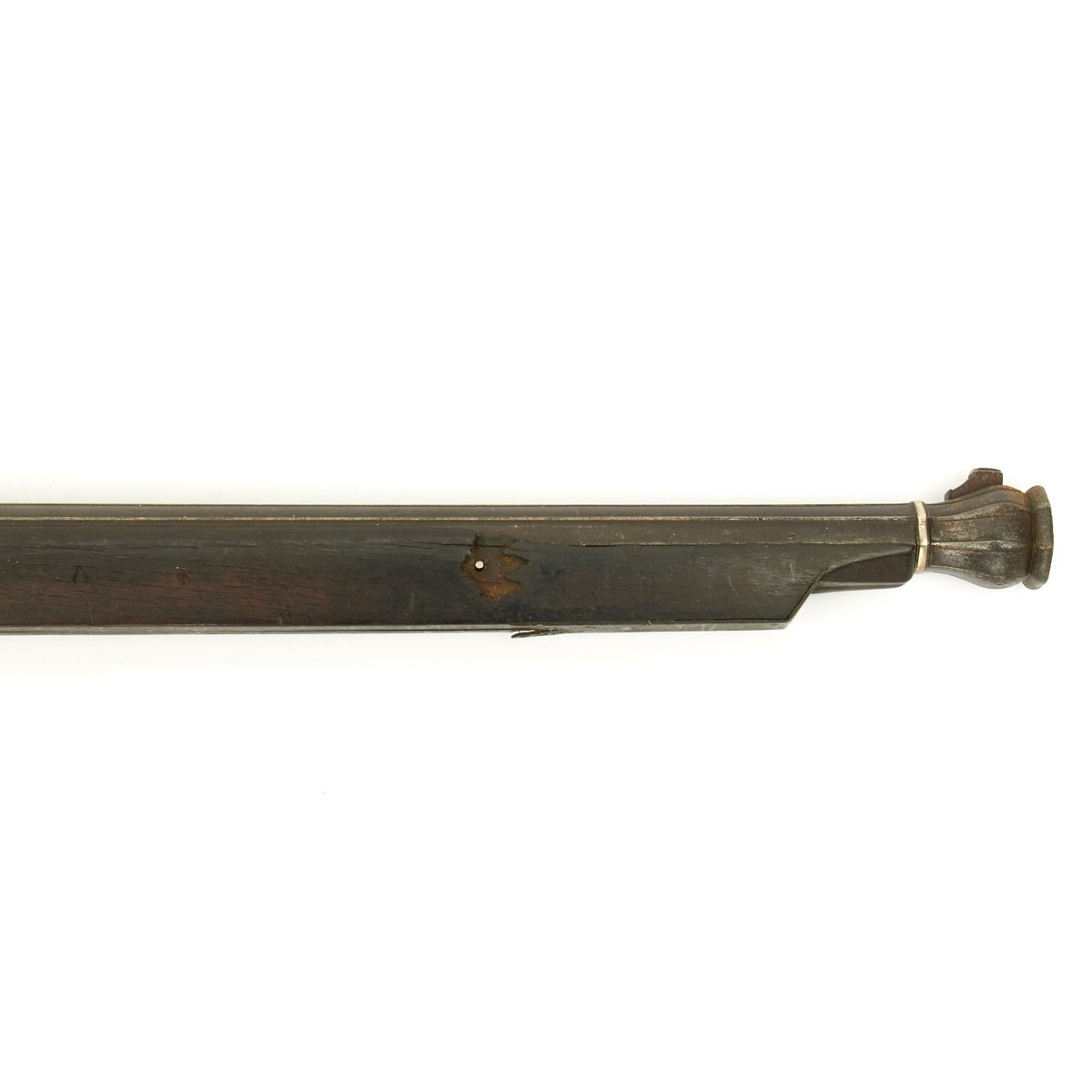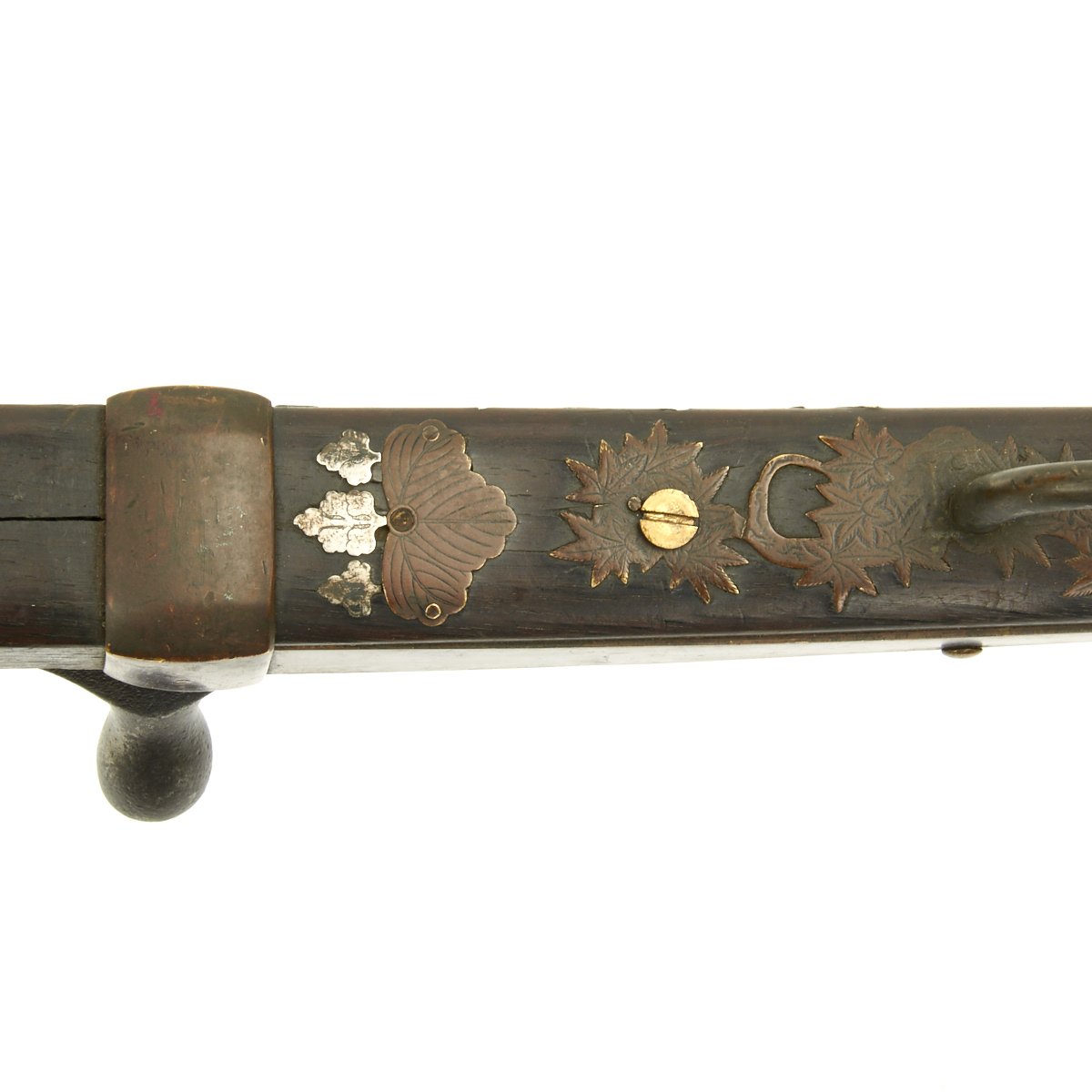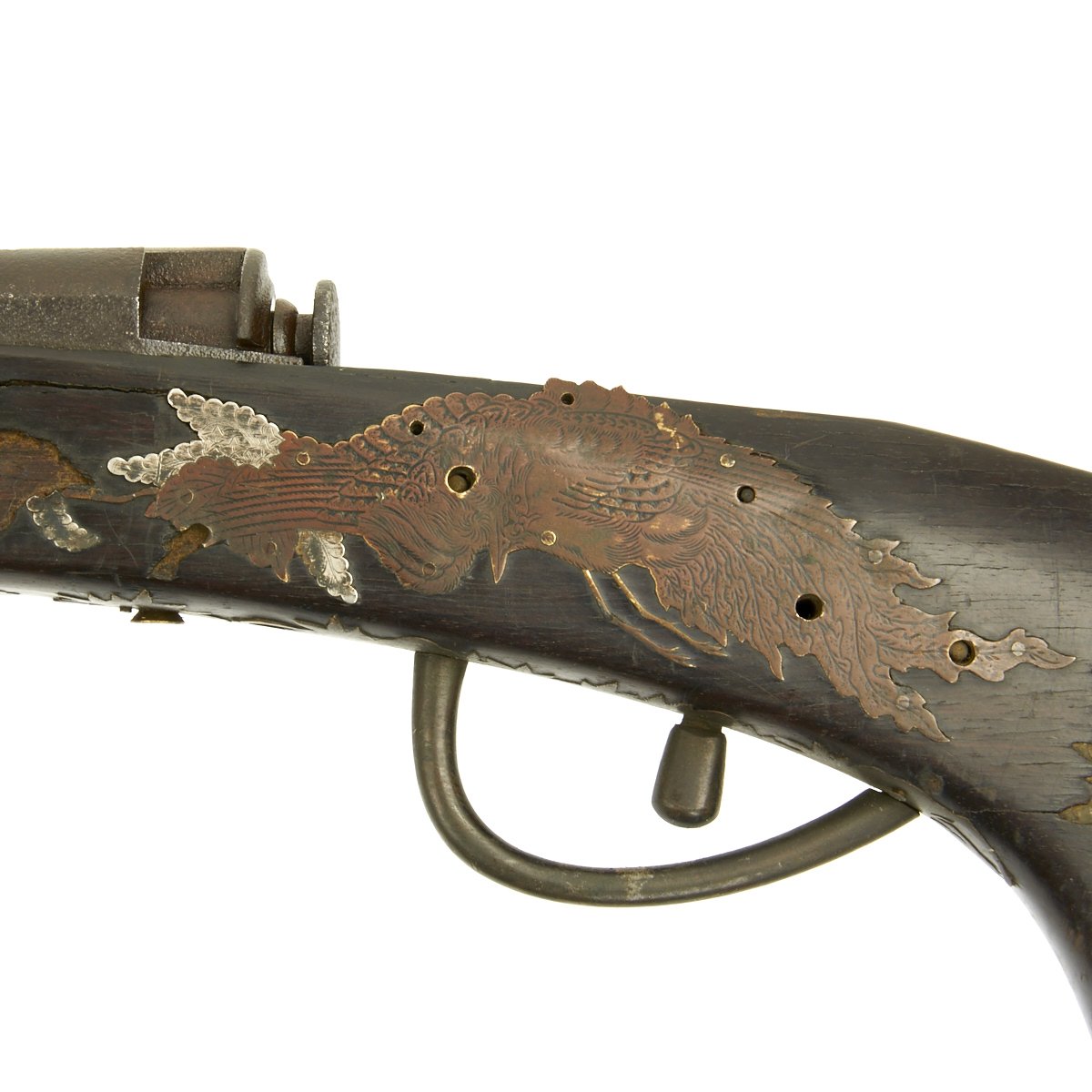 Original Item: Only One Available. This is an extremely interesting weapon. It started life probably in the late 1700s or early 1800s being constructed as a matchlock firearm using black powder and a very primitive ignition system. These were often referred to as Tanegashima (種子島), after the island where a Chinese junk with Portuguese adventurers on board was driven to anchor by a storm in 1543. The local lord purchased two matchlocks from the Portuguese, and then had his swordsmith copy the weapon. Some parts of the process were problematic, so a Portuguese blacksmith was brought over to assist, and the guns were completed, with much success.