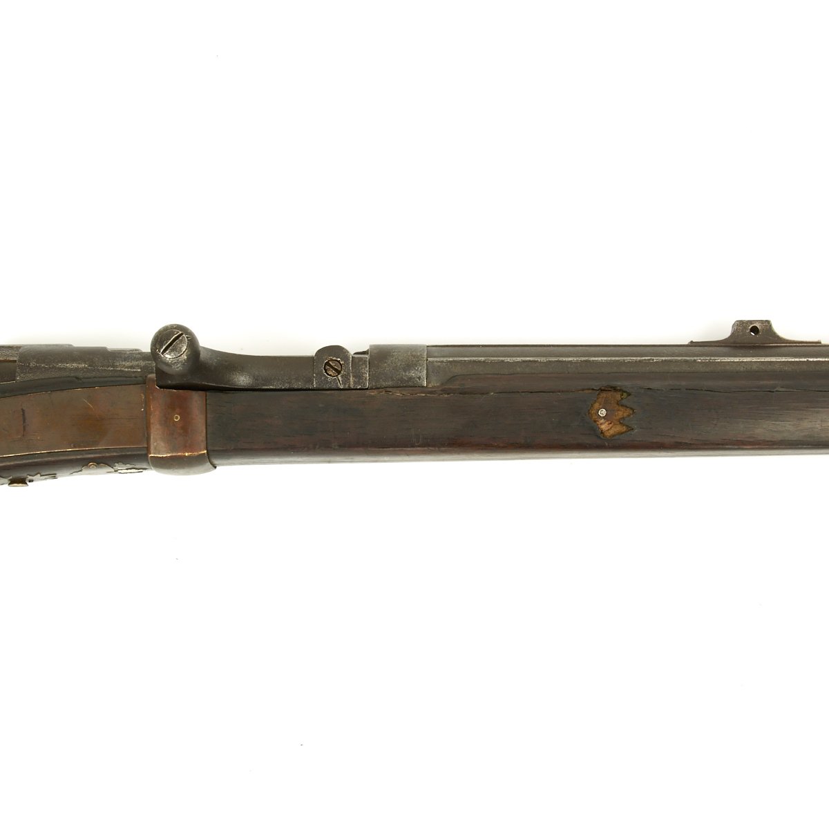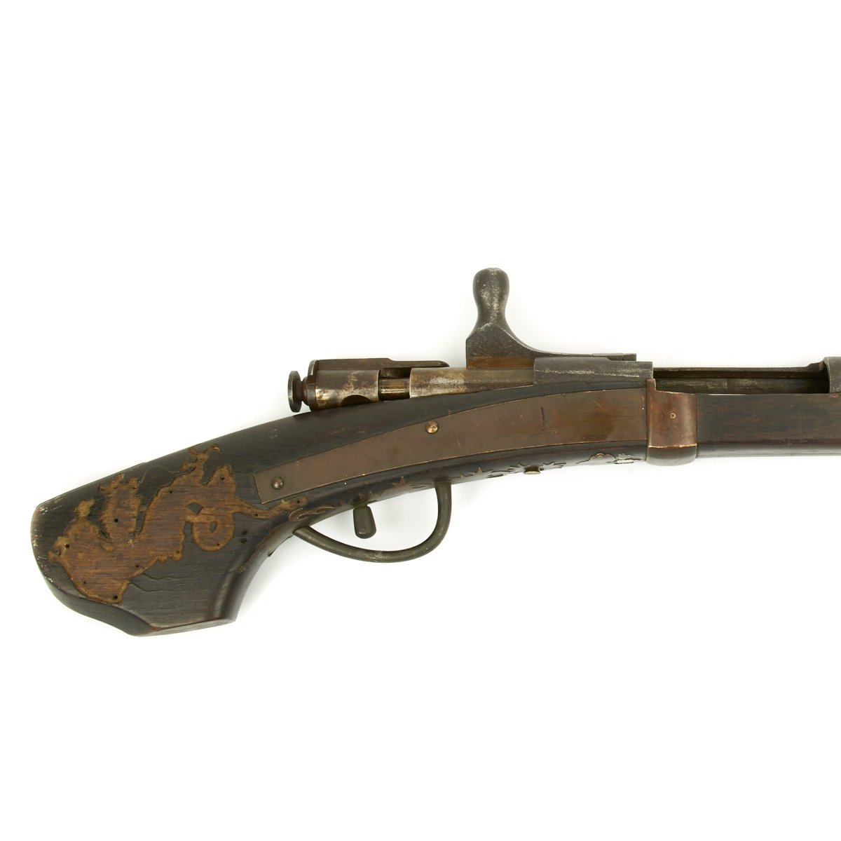 The gun is in sound condition and measures 52 inches in length, with a 38 inch barrel, however the bolt action system does not today "click" and someone has carefully removed most all of the decorative inlays that usually adorned these early matchlock guns. Maybe for the brass or silver value or someone's kid just for something to do. Putting it back would be quite a performance nevertheless this is a most unusual conversion from ancient to modern worthy of any Collection. Ready to display!