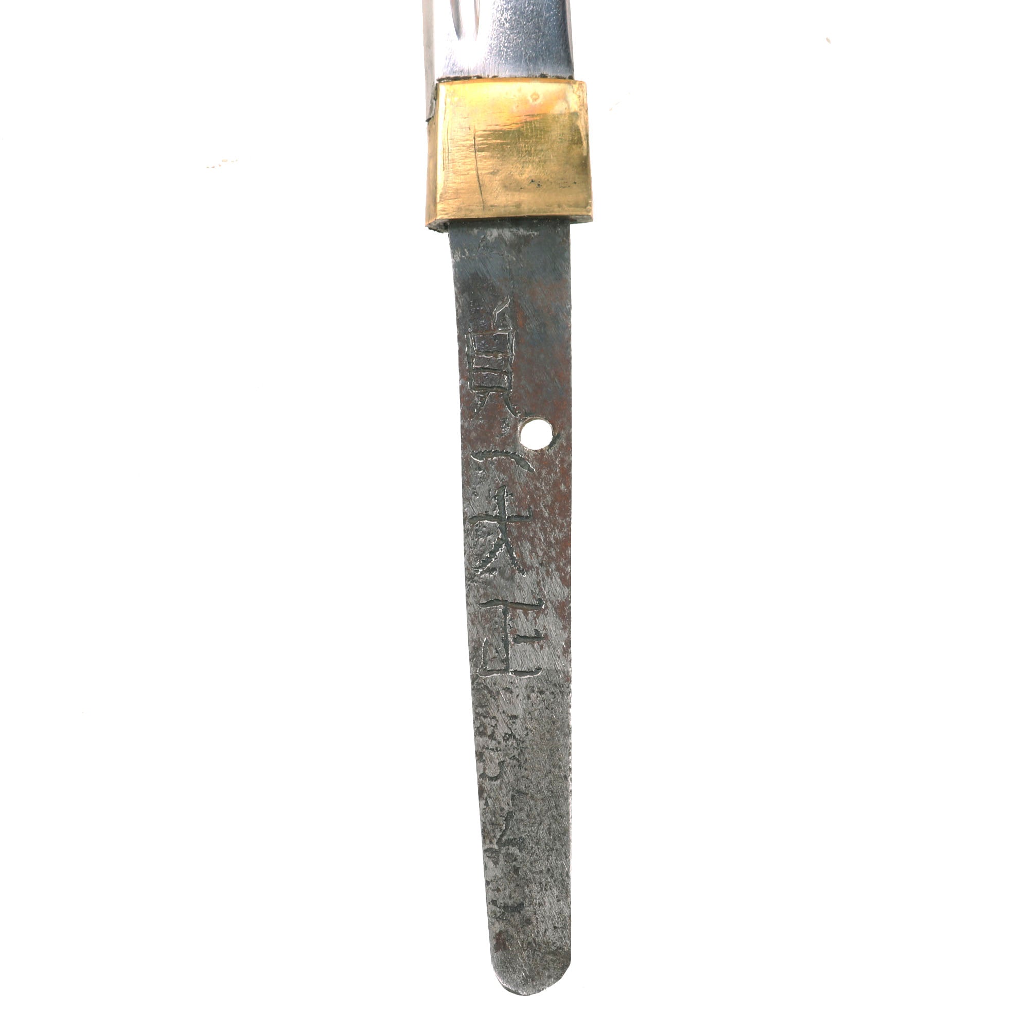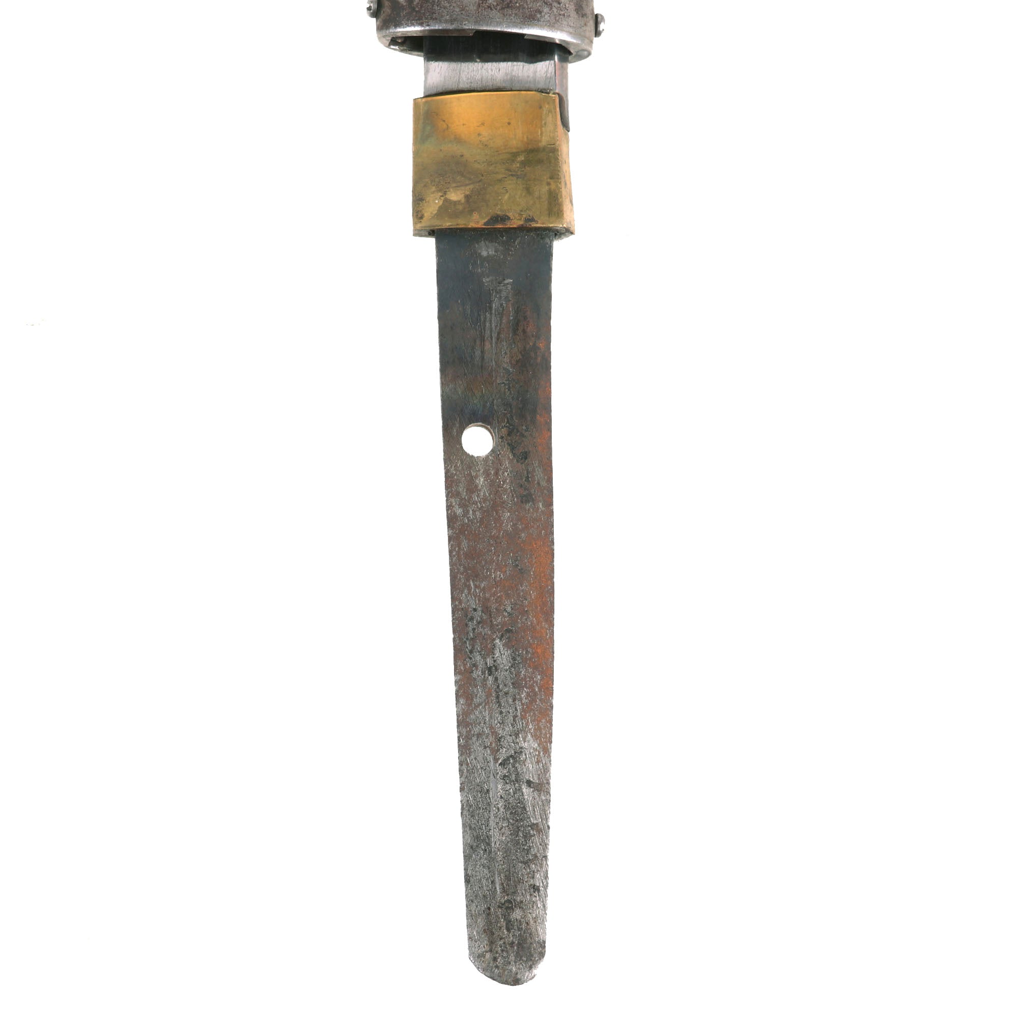 The grip is fully wrapped in lovely polished leather, which is in very good condition, and still retains the original brass wire binding. The guard does not fold down, as some do, and has a functional scabbard lock. There is very little play in the fittings, making this a great example. There is an two part brass mekugi (peg) that screws together, which is definitely original.