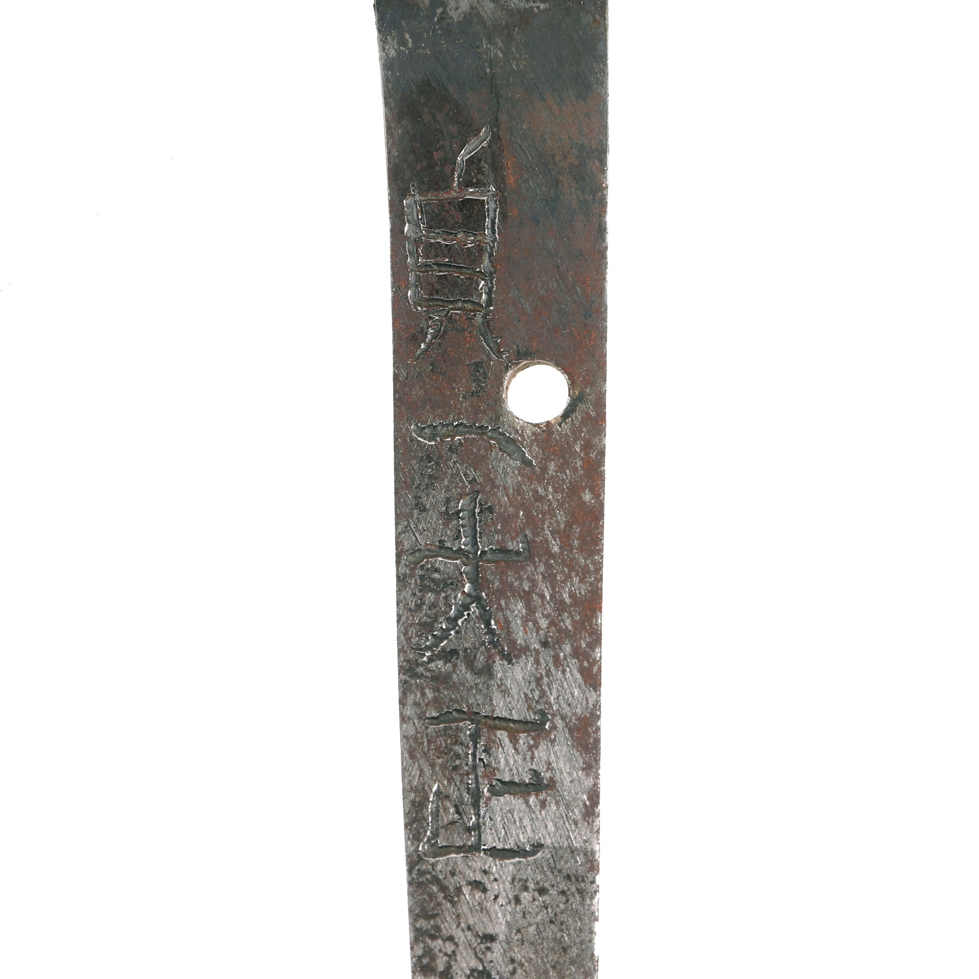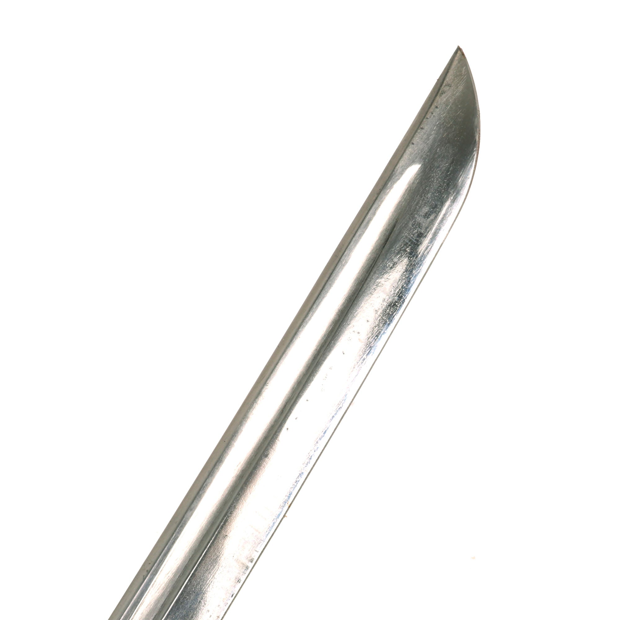The katana has an arsenal forged blade with a Futsu 普通 (regular) Nakago (tang) with an kuri-jiri (symmetricaly rounded) nakago-jiri (tang tip). It has the typical shinogi-zukuri shape used on katanas, along with a bo'hi fuller. It is not nickel plated, and is very similar to the blade used on P-1944 Shin-Gunto and Type 95 NCO swords, though a bit smaller in size.