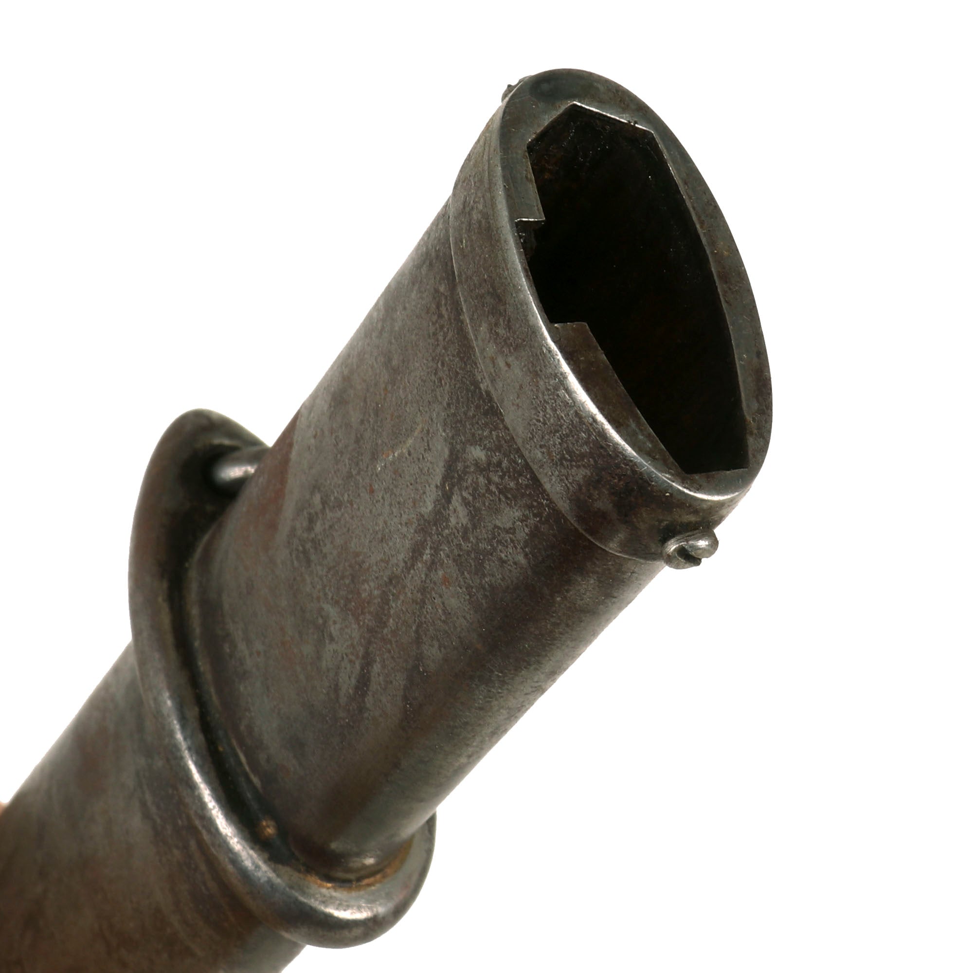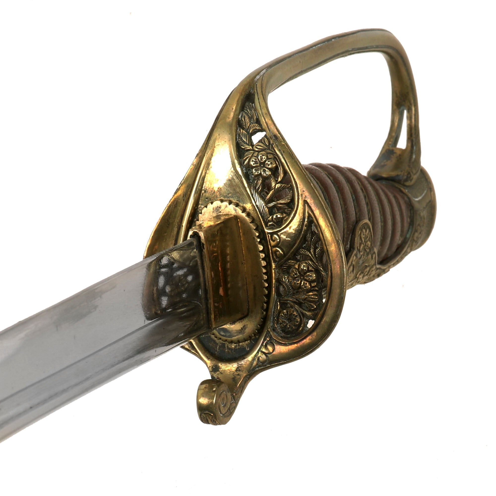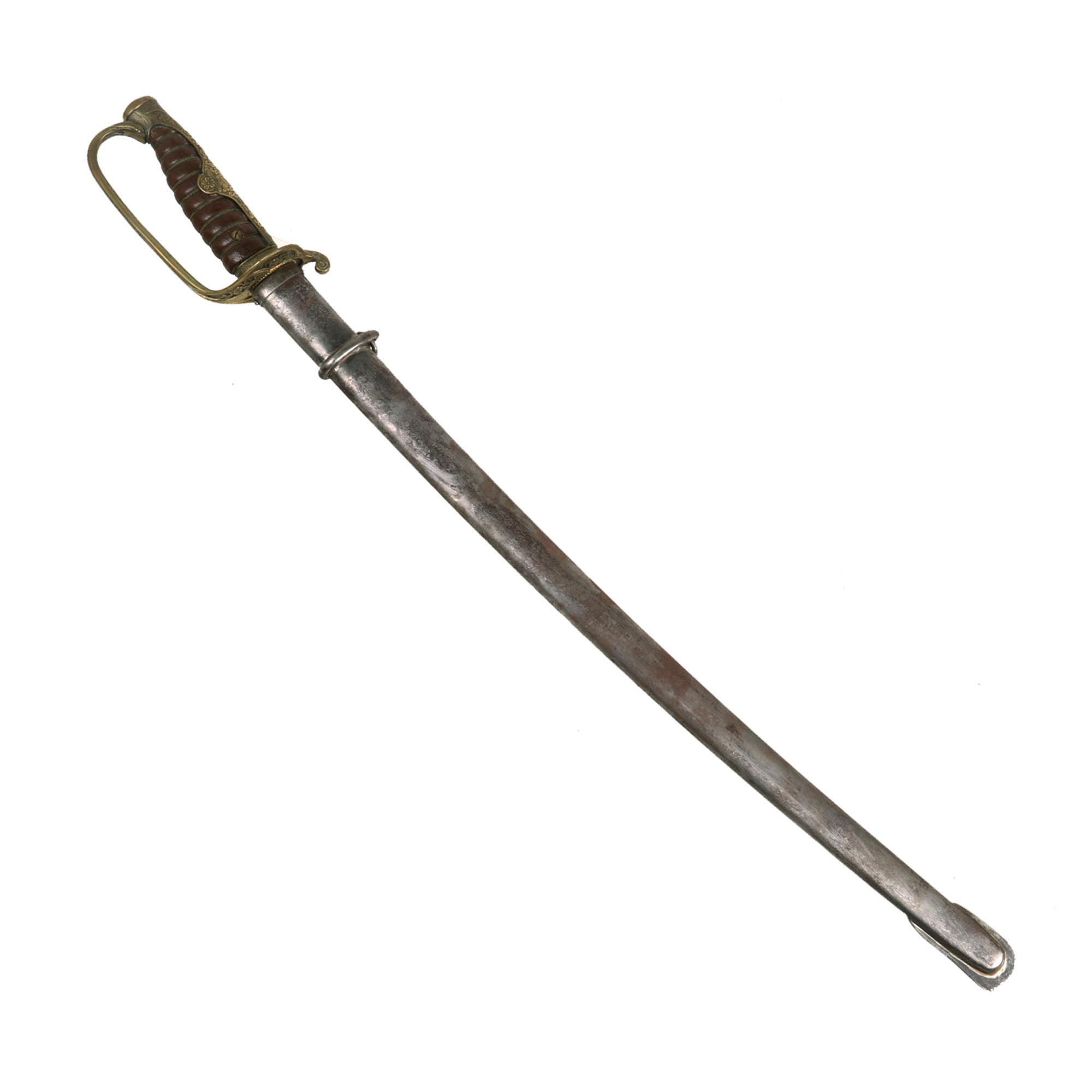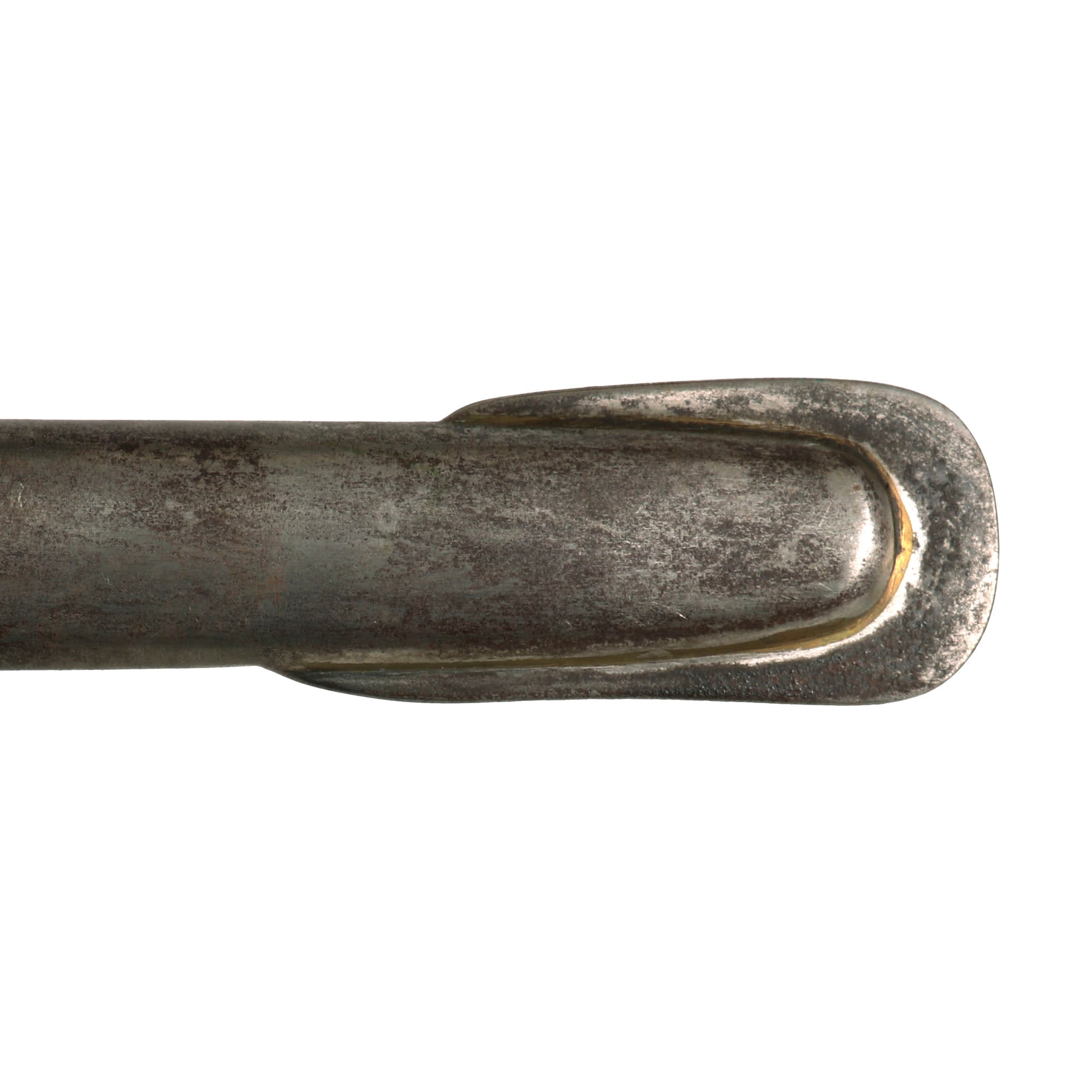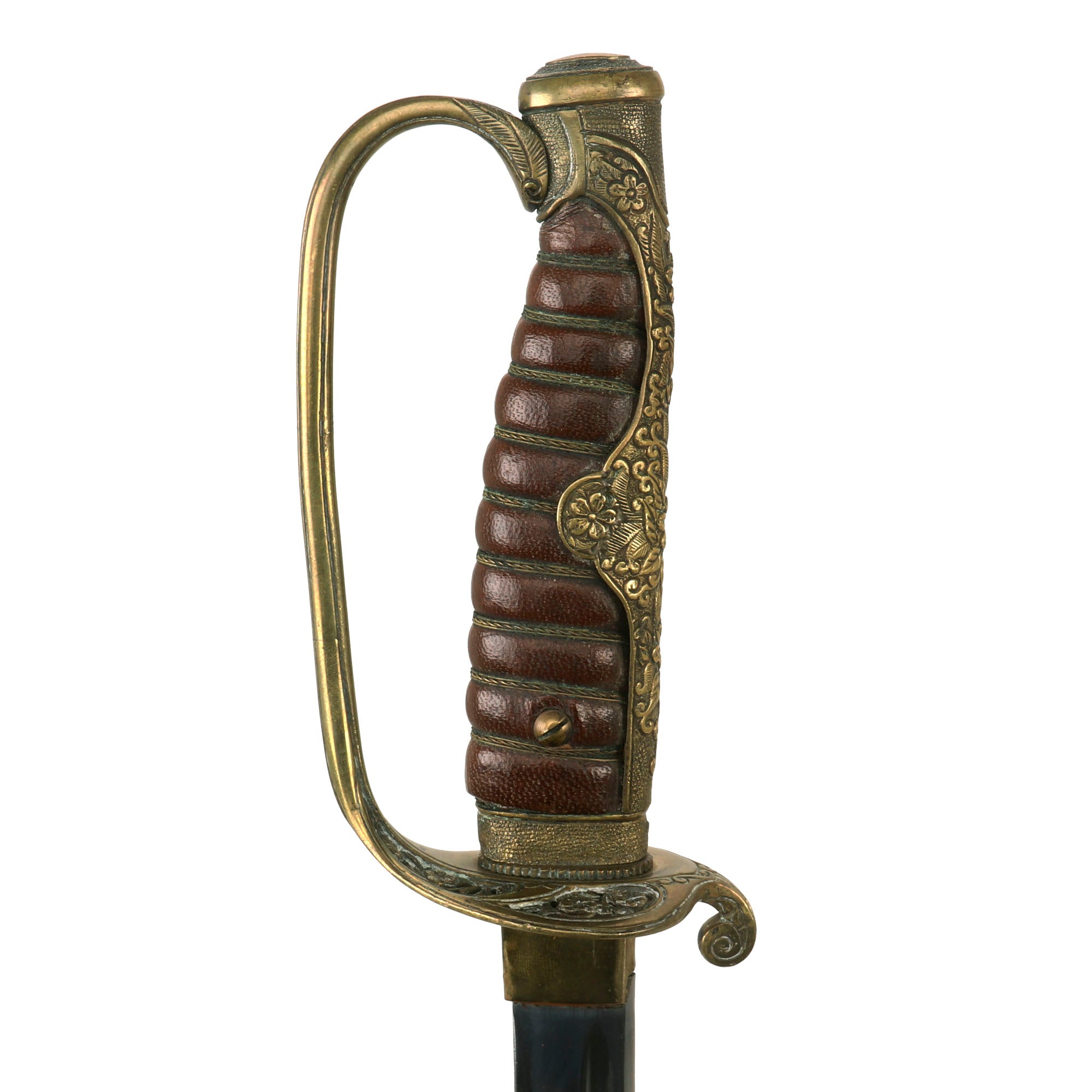 This is a nice example of a Pre-WWII era Army Company Officer Kyu-Gunto, complete with the original steel scabbard. This sword was most likely produced during the WWI or Interwar era, before the fittings were switched to aluminum, and construction simplified. It was made for an arsenal forged Katana style blade, which requires the older 1886 pattern fittings, which were designed around traditionally made blades. This differs from later versions with the much smaller bent handle. These were real swords, sturdily built for actual use. We very rarely see Kyu-gunto swords from the WWII era with forged blades, making this a real treat. We pulled the handle on this example, and the blade tang is stamped 貞一 大正 - Sada Ichi Taisho, or something similar. This would most likely indicate that it was made during the reign of the Taisho Emperor, which lasted 30 July 1912 – 25 December 1926, so it comes from the WWI - Pre WWII era.