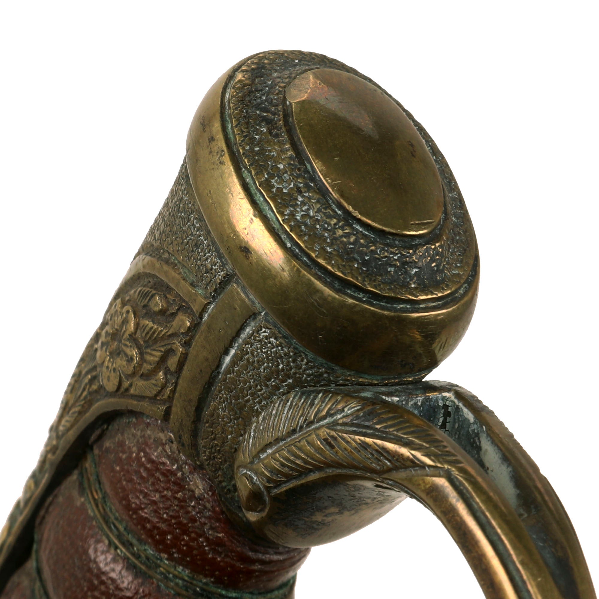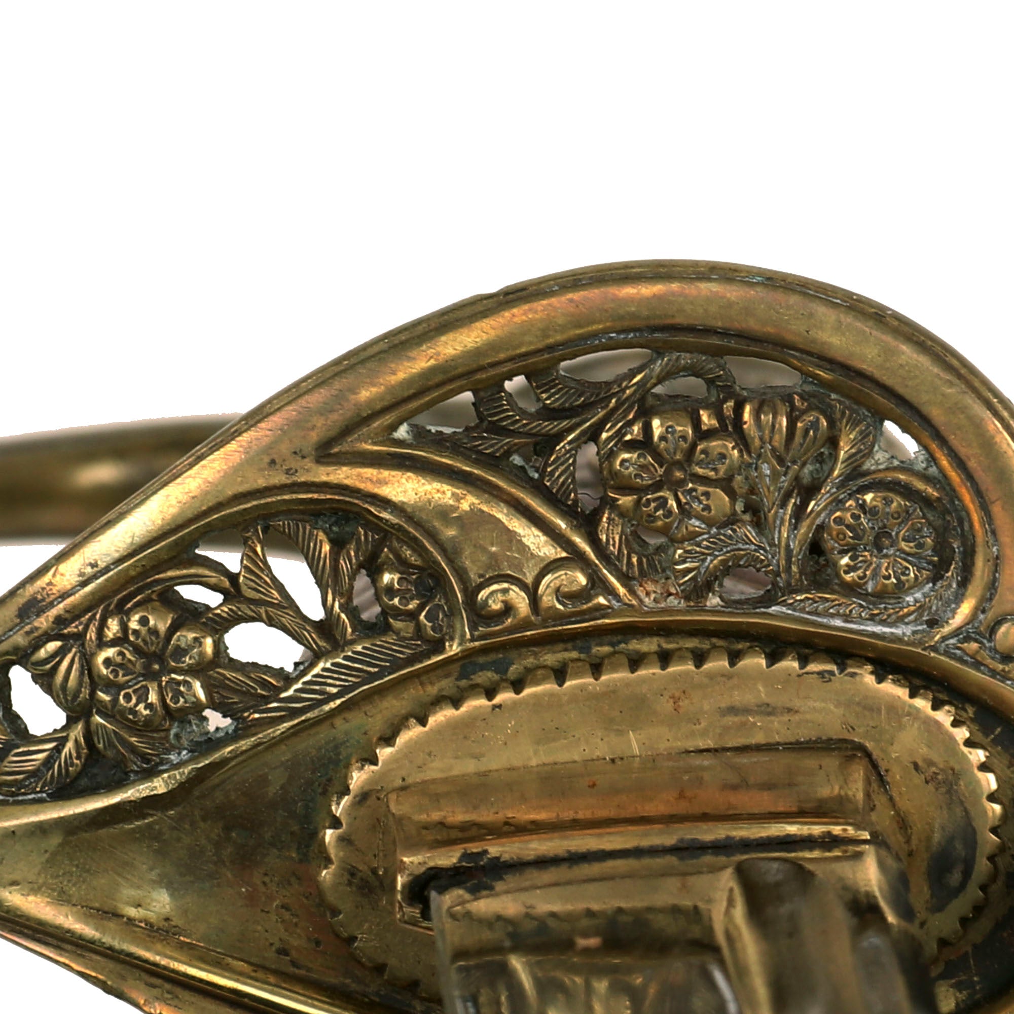 The hilt is an ornate multi-piece brass example, with excellent embossed designs and pebbling on the back strap and collar. The metal originally fully gilt, and it still retains this very well, with only minor wear in areas. It has multiple Cherry Blossom emblems jutting out from the back strap, usually indicating Imperial Japanese Army use. They all have only 5 petals though, so it could be police use, but it lacks the standard police emblem. It has a very elongated European style guard, to allow for the longer grip on the 1886 pattern hilt.