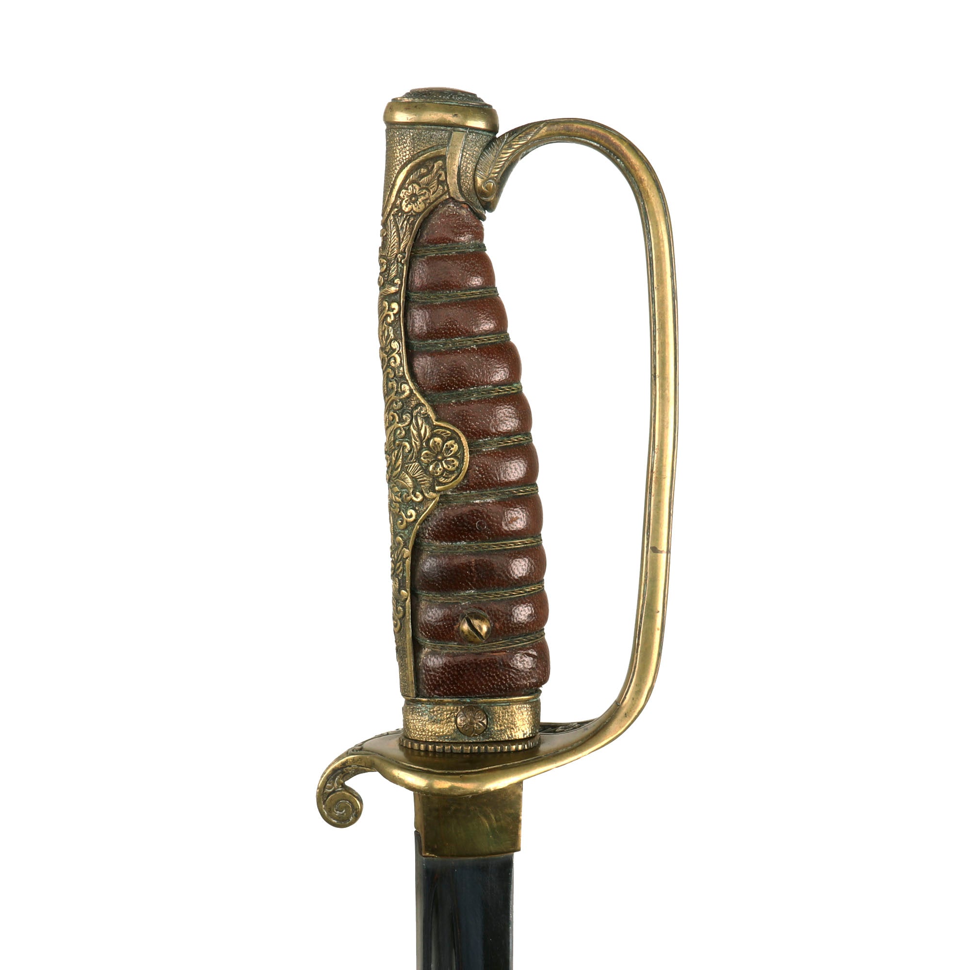 Kyu-gunto swords, also called Russo-Japanese swords, were used by Army, Cavalry and Naval officers during the Russo-Japanese War and WWII. This style of mounting was used from 1883 until 1945. Like shin-gunto, a great variety of quality in both blades, traditional and machine made, and mounts is seen in kyu-gunto swords. Many variations are found in the scabbards of kyu-gunto swords including chromed metal, lacquered wood or leather covered wood with brass fixtures. Any style scabbard may have a leather field cover. Those swords with elongated hilts and mekugi (peg for holding blade into hilt) are more likely to have hand forged blades, while the swords lacking mekugi generally are machine made and may have chromed blades. The backstraps of naval kyu-gunto swords have no side pieces while army kyu-gunto and colonial swords have side pieces with various emblems on the backstrap.