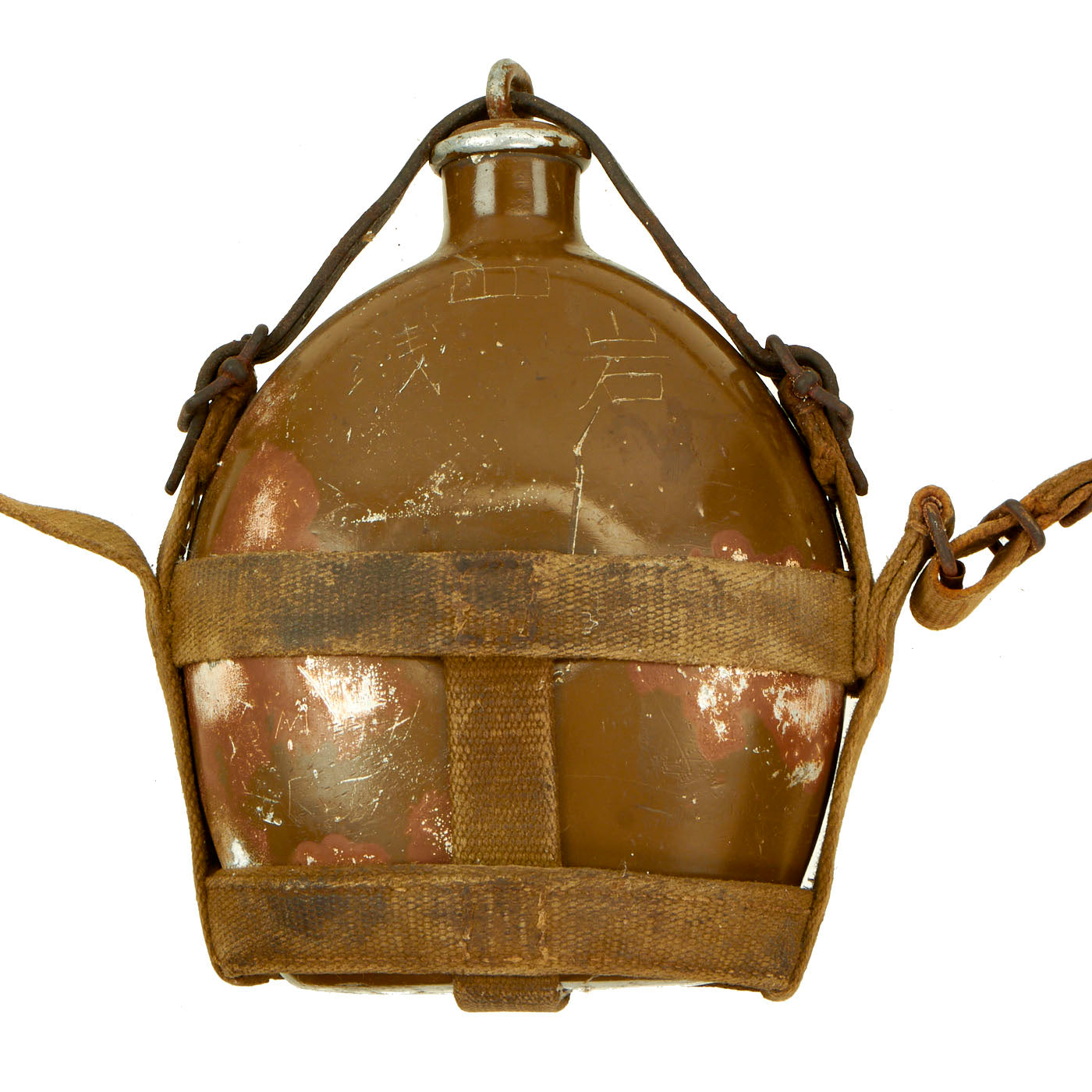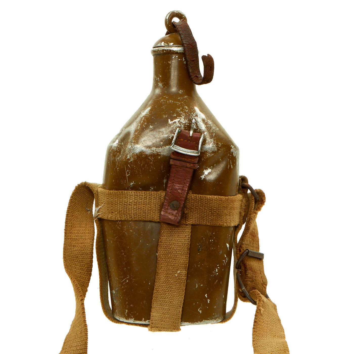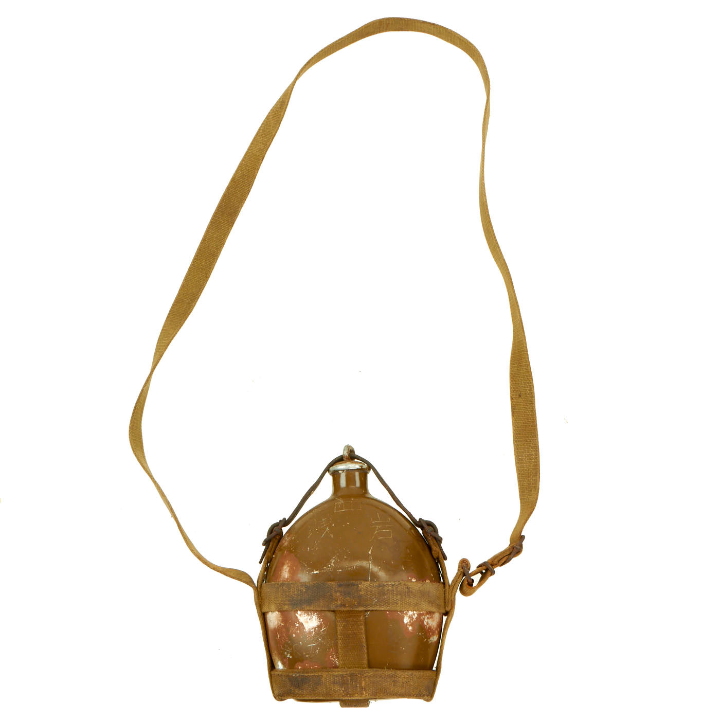 - WWII Canteen: This was the standard issued canteen to Japanese troops during WWII. It has a lovely webbing carry harness with stains consistent with service use and wear. It is complete with the cork stopper and an intact leather securing strap. There are various markings and stamps on the aluminum body, some of which appear to have been done by hand. There is no excessive denting present and the paint has the expected areas of chipping and color loss.