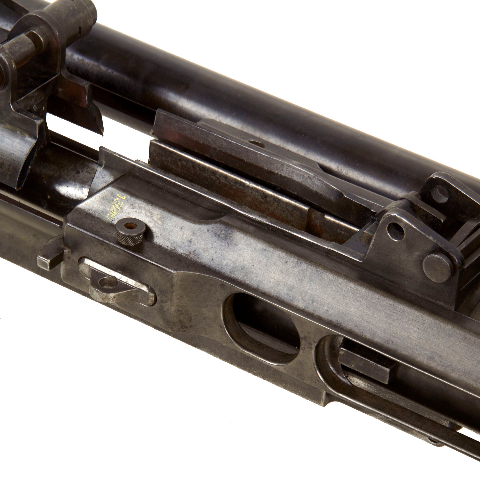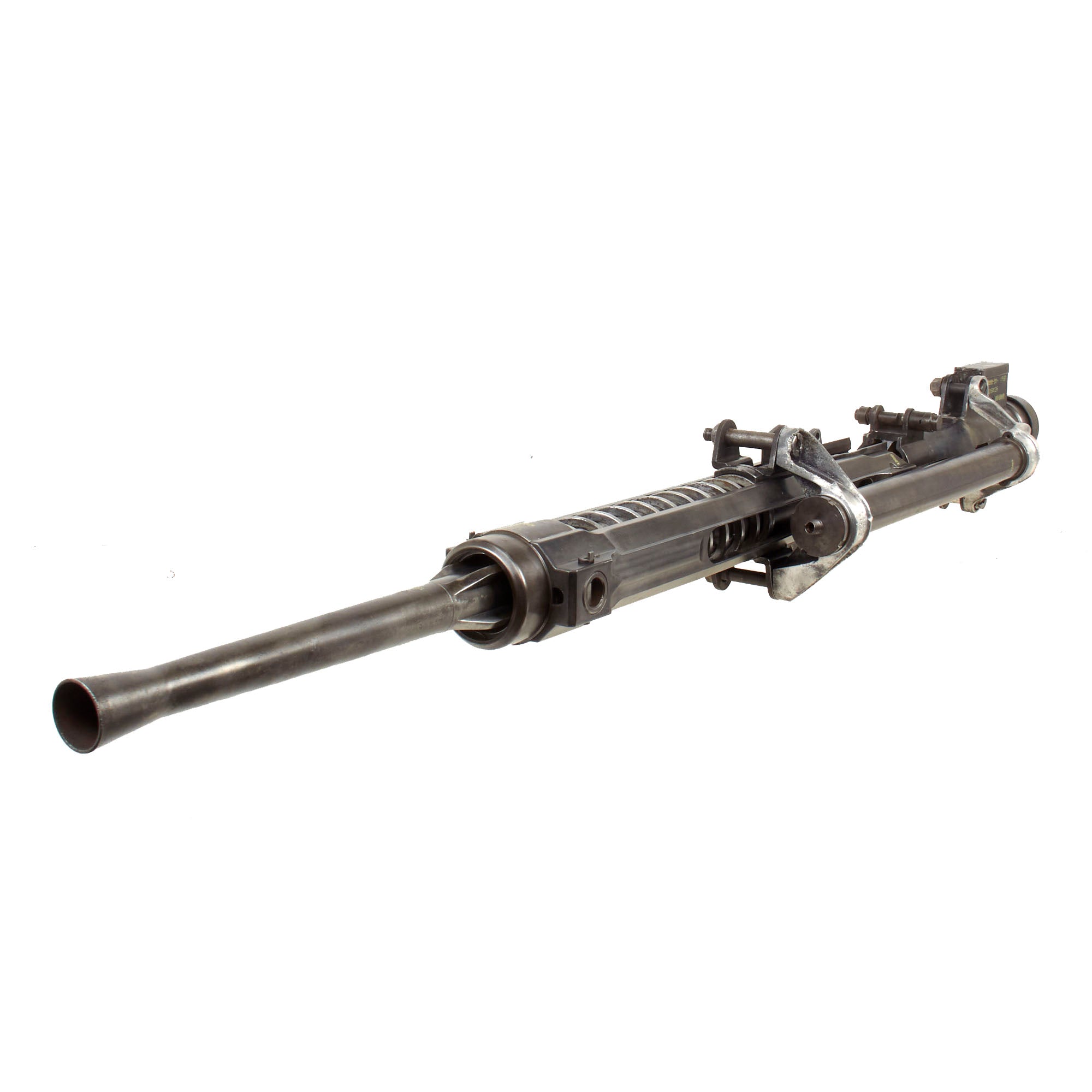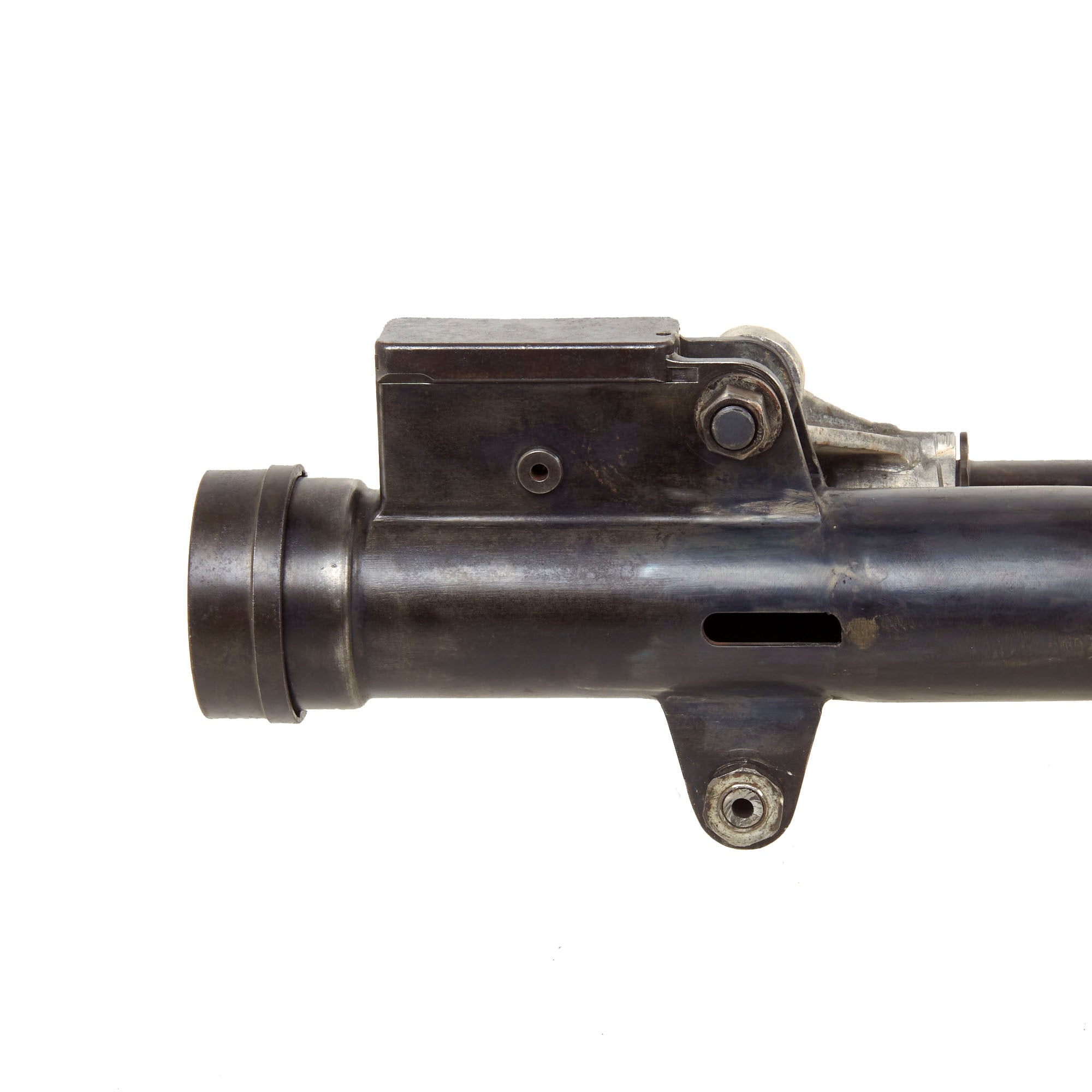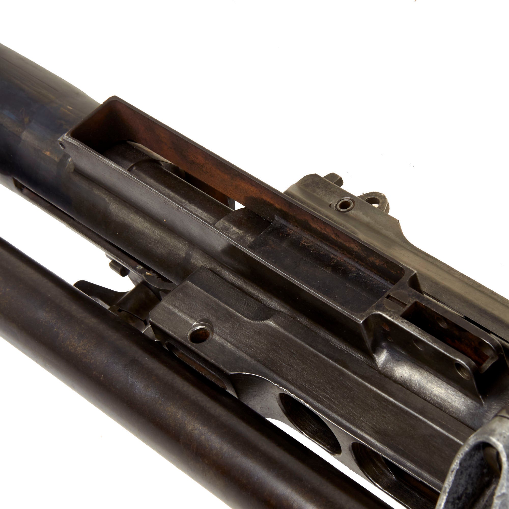It is constructed from all original parts on an original BATF compliant non-firing display receiver, making this a 100% legal display gun. An 8 inch section of solid steel cylindrical bar stock has been inserted between two severed sections of the receiver, and the right side of the receiver was cut, removing another 3" section. So in total, 11" of the original receiver has been totally removed and discarded over two locations. The barrel is still live, albeit rusted. The bolt is inside of the gun and is welded in place. This is an incredible example, and as far as we know, this is the first example to ever come to market.