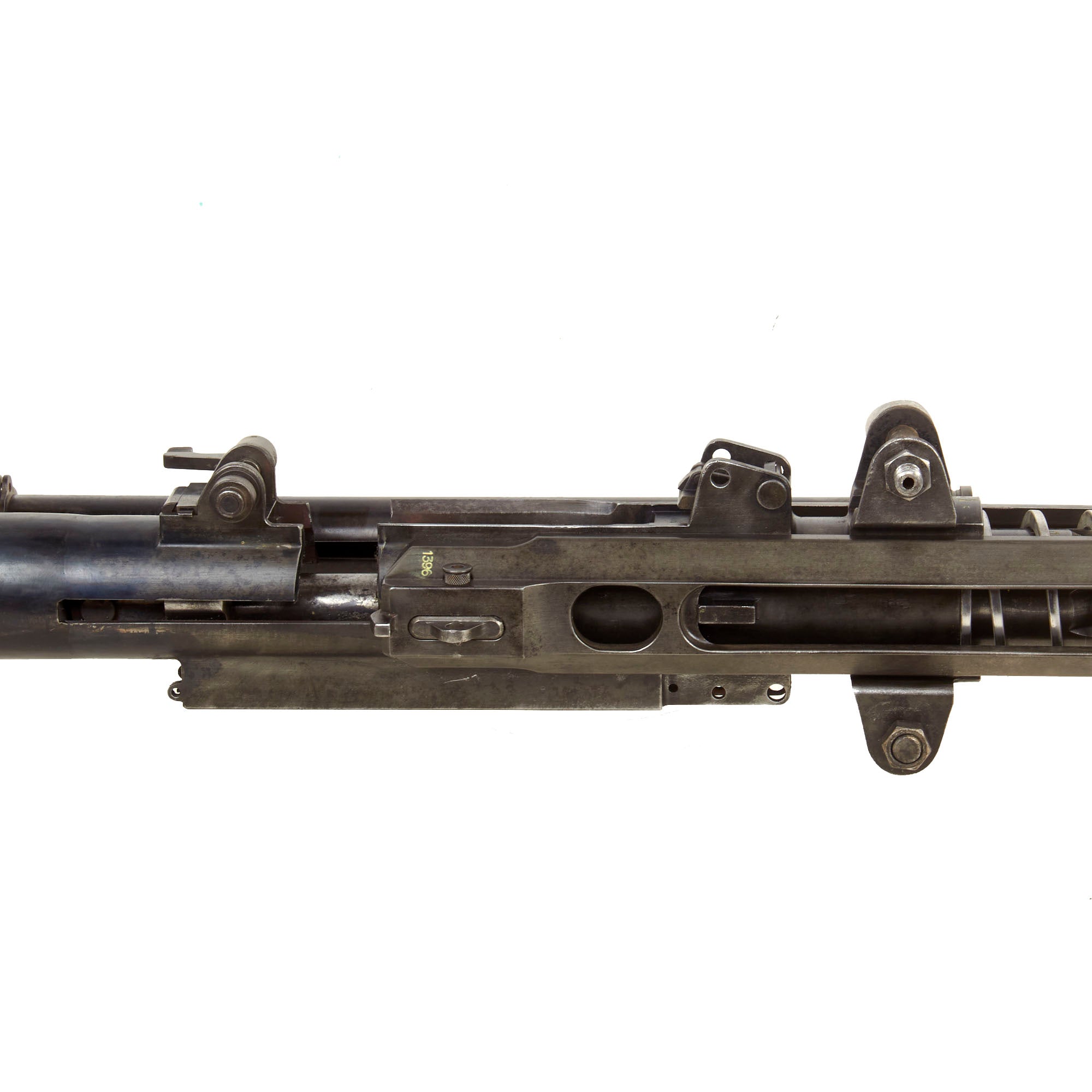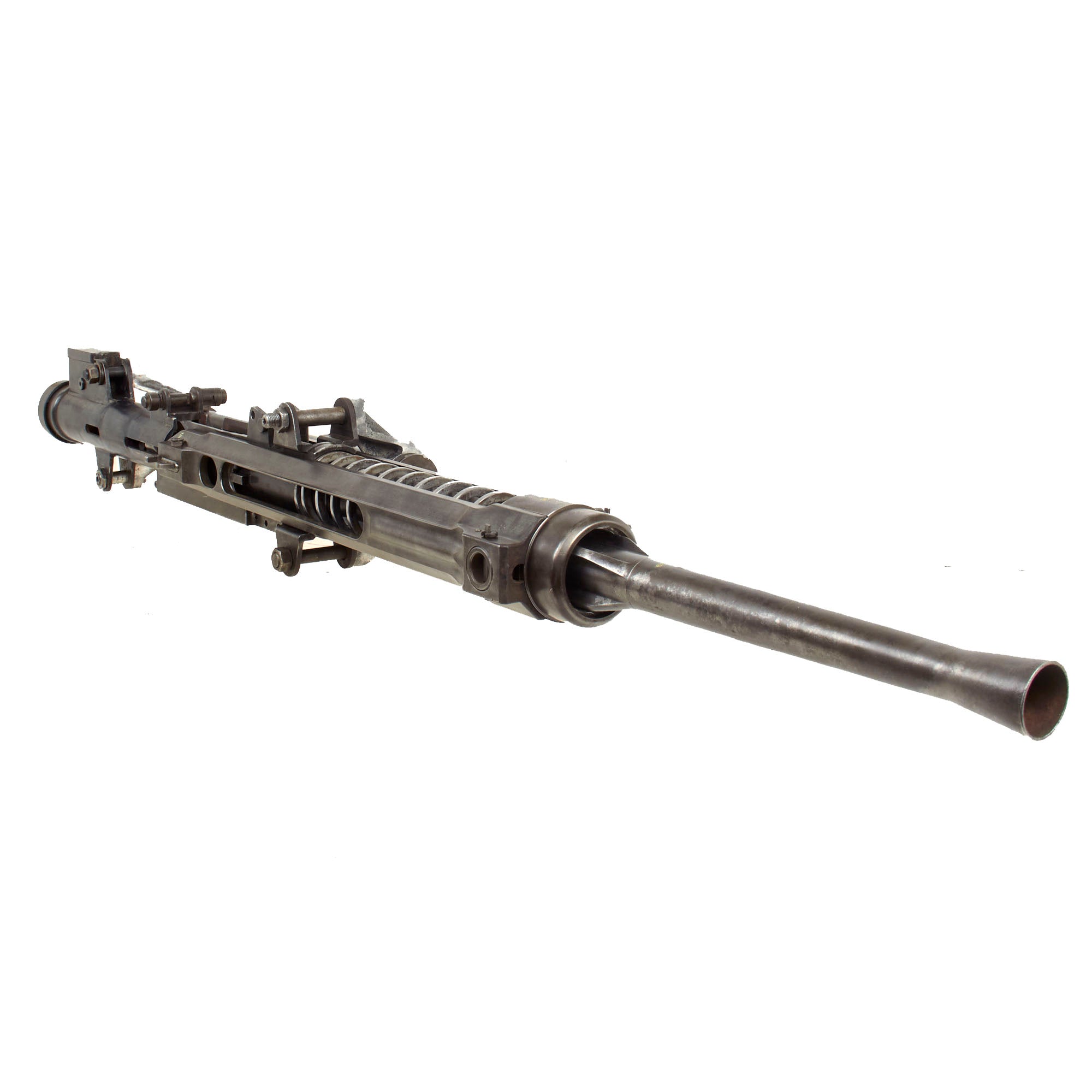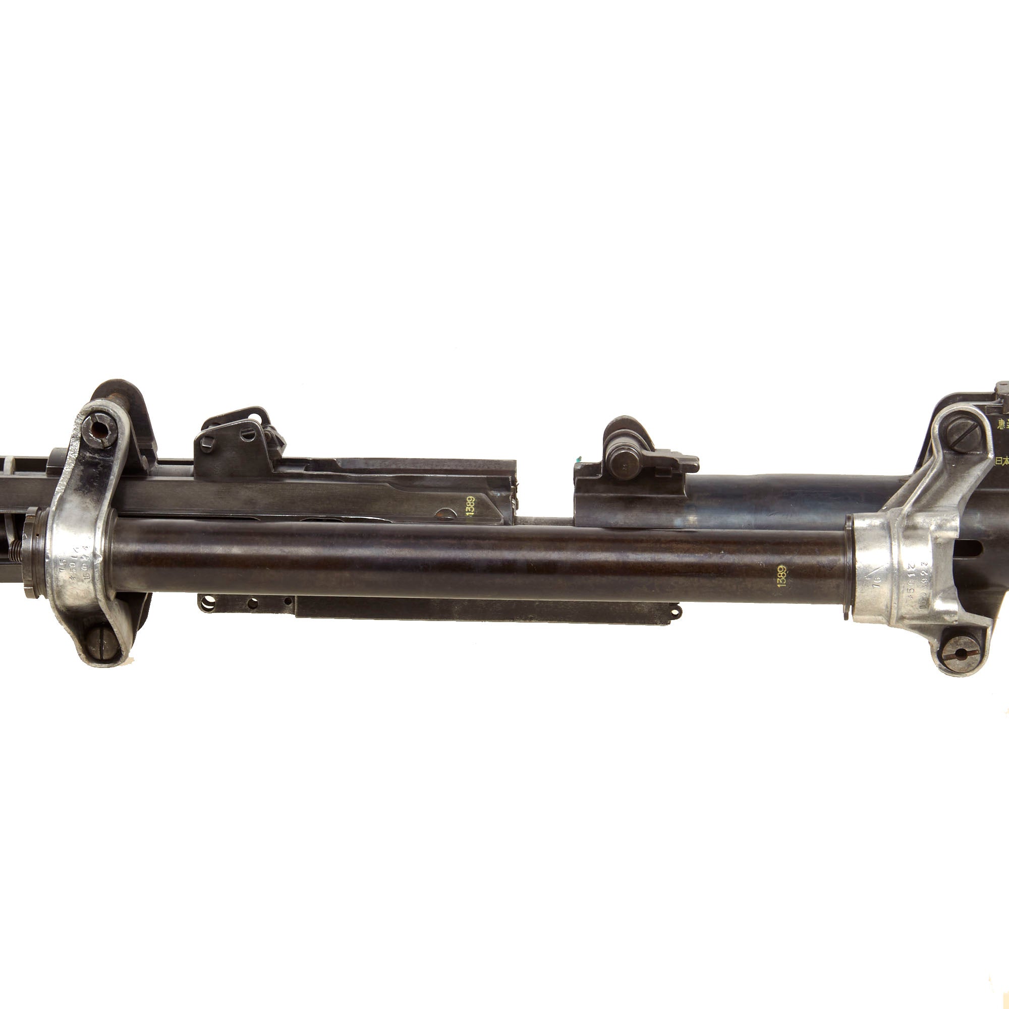 It is constructed from all original parts on an original BATF compliant non-firing display receiver, making this a 100% legal display gun. An 8 inch section of solid steel cylindrical bar stock has been inserted between two severed sections of the receiver, and the right side of the receiver was cut, removing another 3" section. So in total, 11" of the original receiver has been totally removed and discarded over two locations. The barrel is still live, albeit rusted. The bolt is inside of the gun and is welded in place. This is an incredible example, and as far as we know, this is the first example to ever come to market.