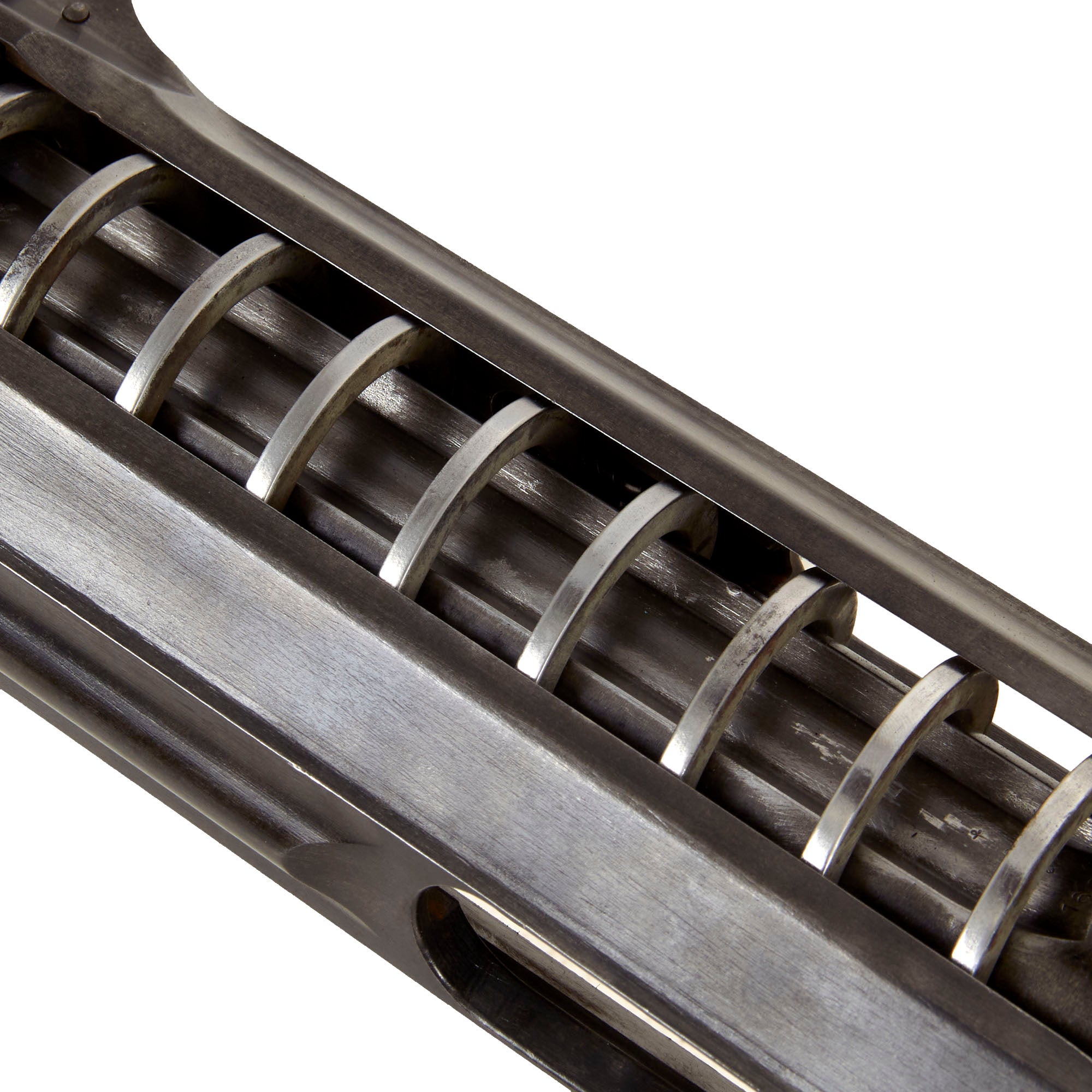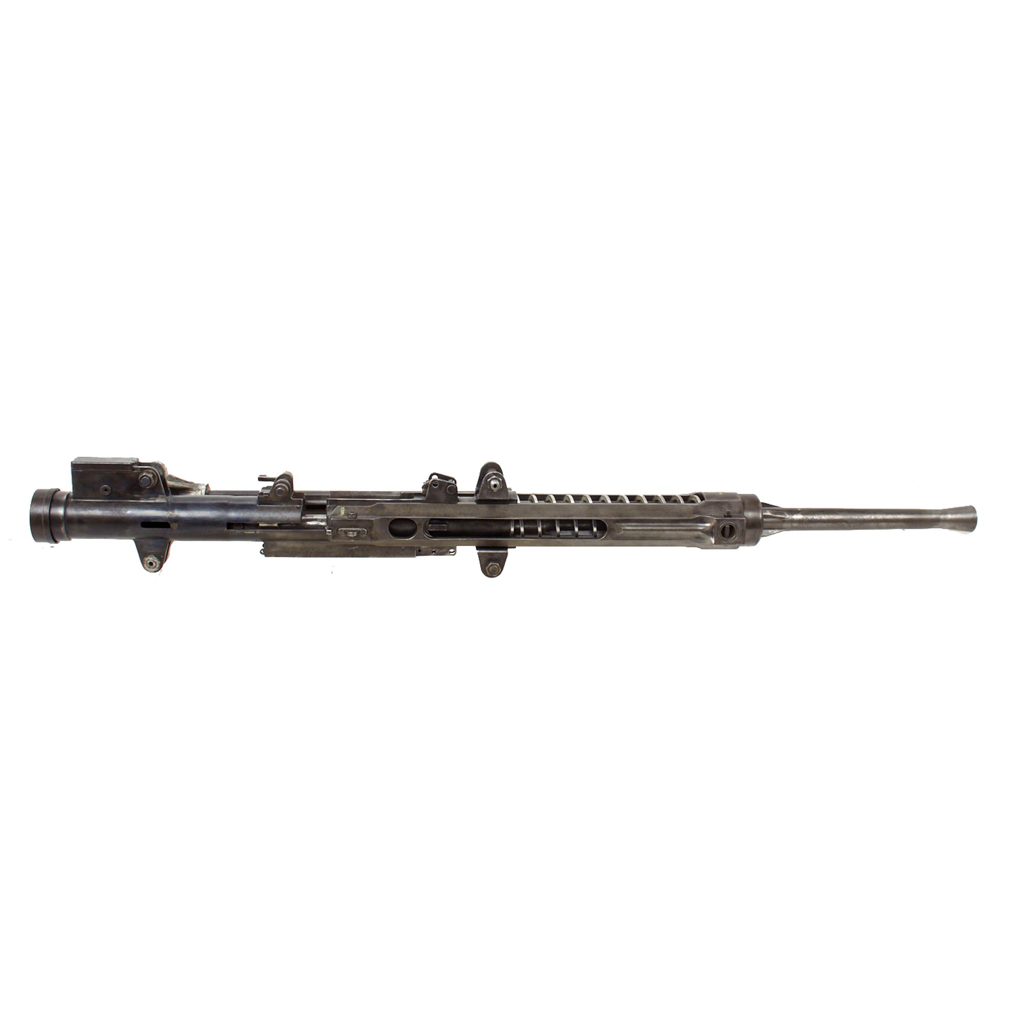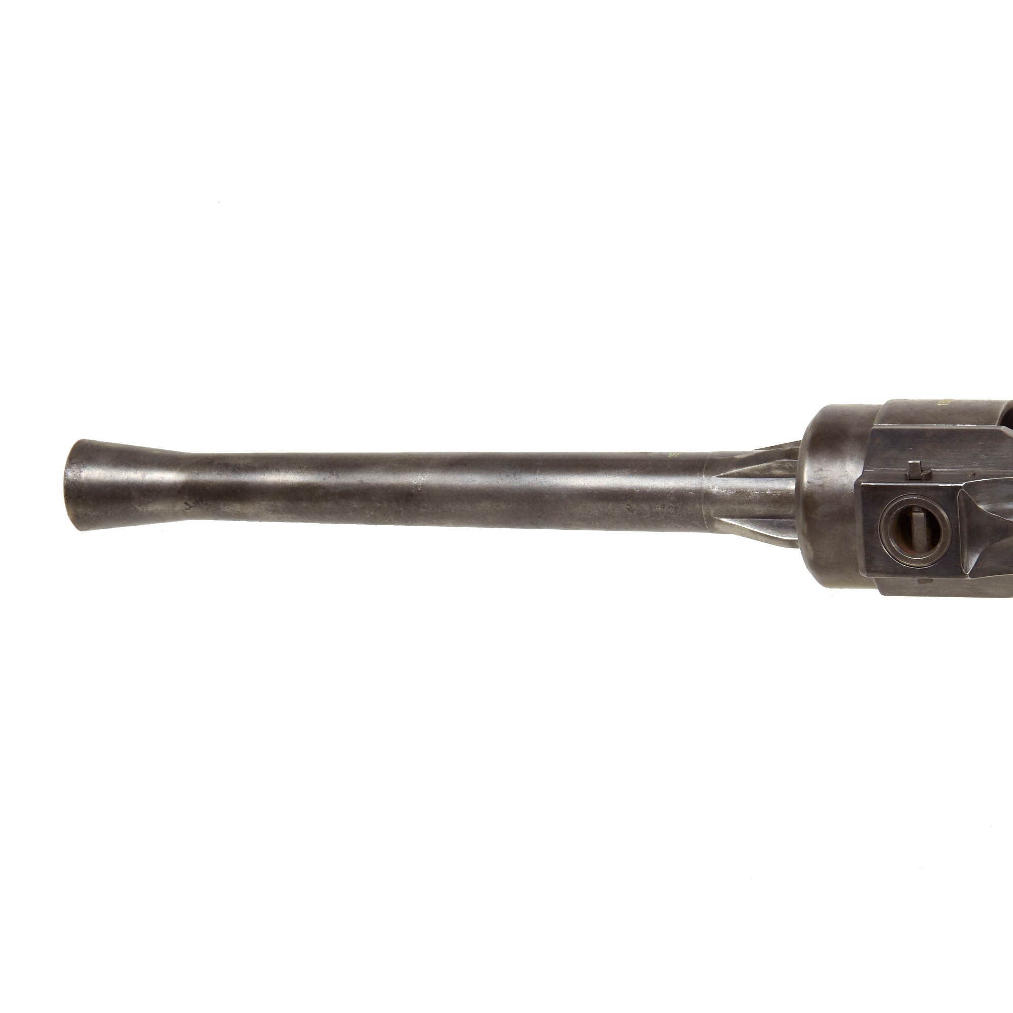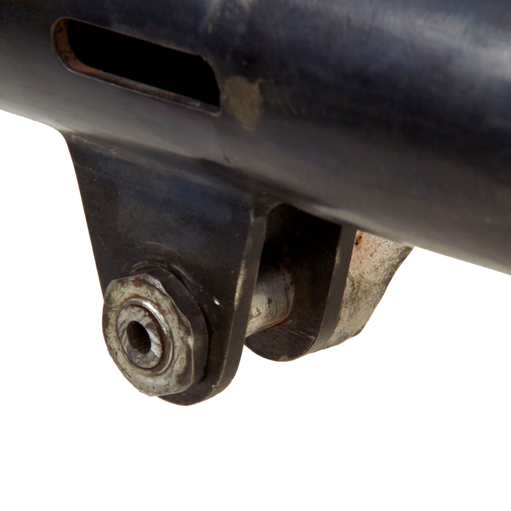 It is constructed from all original parts on an original BATF compliant non-firing display receiver, making this a 100% legal display gun. An 8 inch section of solid steel cylindrical bar stock has been inserted between two severed sections of the receiver, and the right side of the receiver was cut, removing another 3" section. So in total, 11" of the original receiver has been totally removed and discarded over two locations. The barrel is still live, albeit rusted. The bolt is inside of the gun and is welded in place. This is an incredible example, and as far as we know, this is the first example to ever come to market.