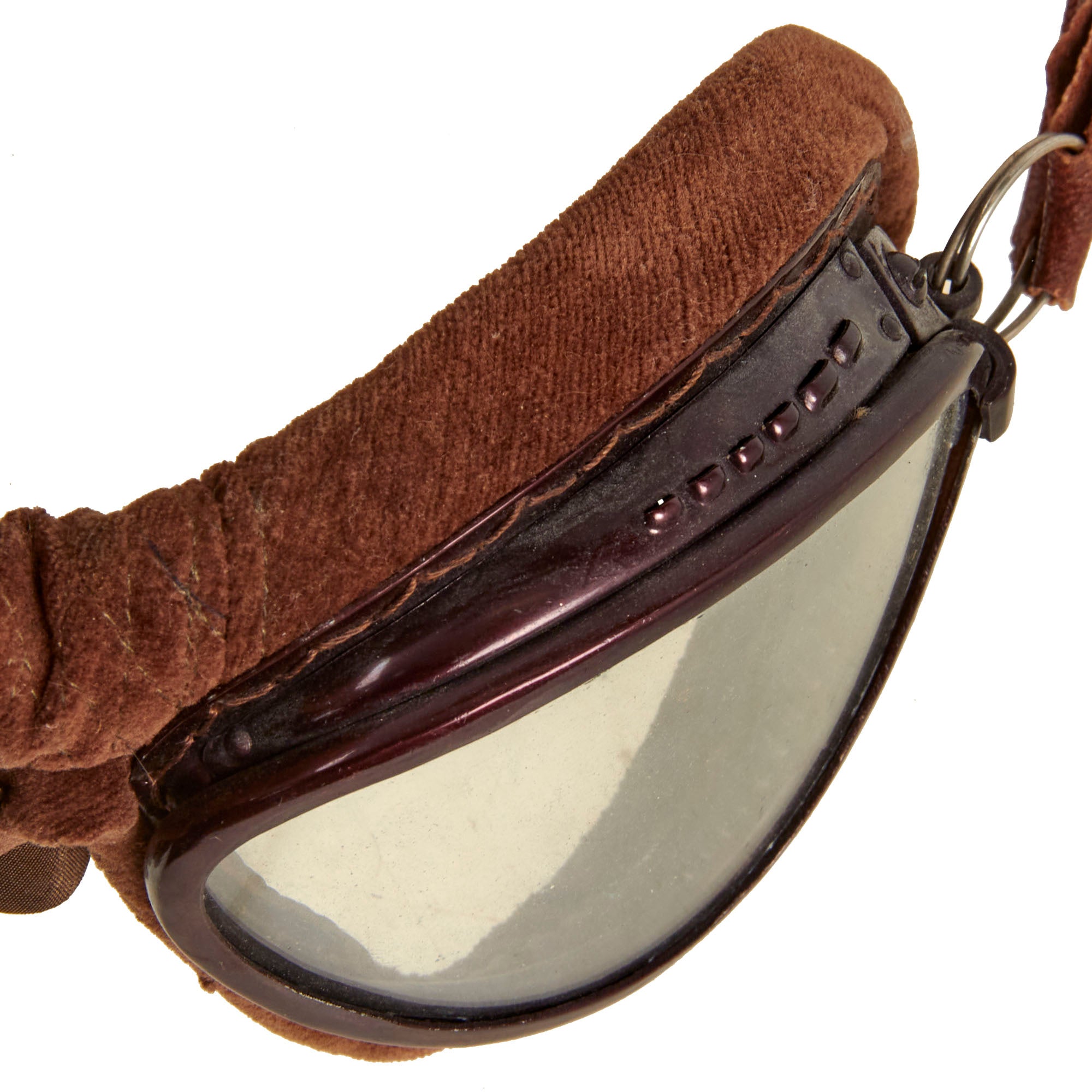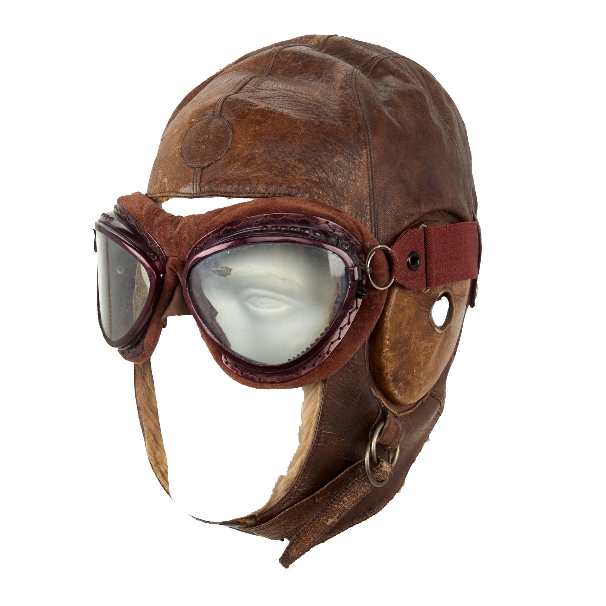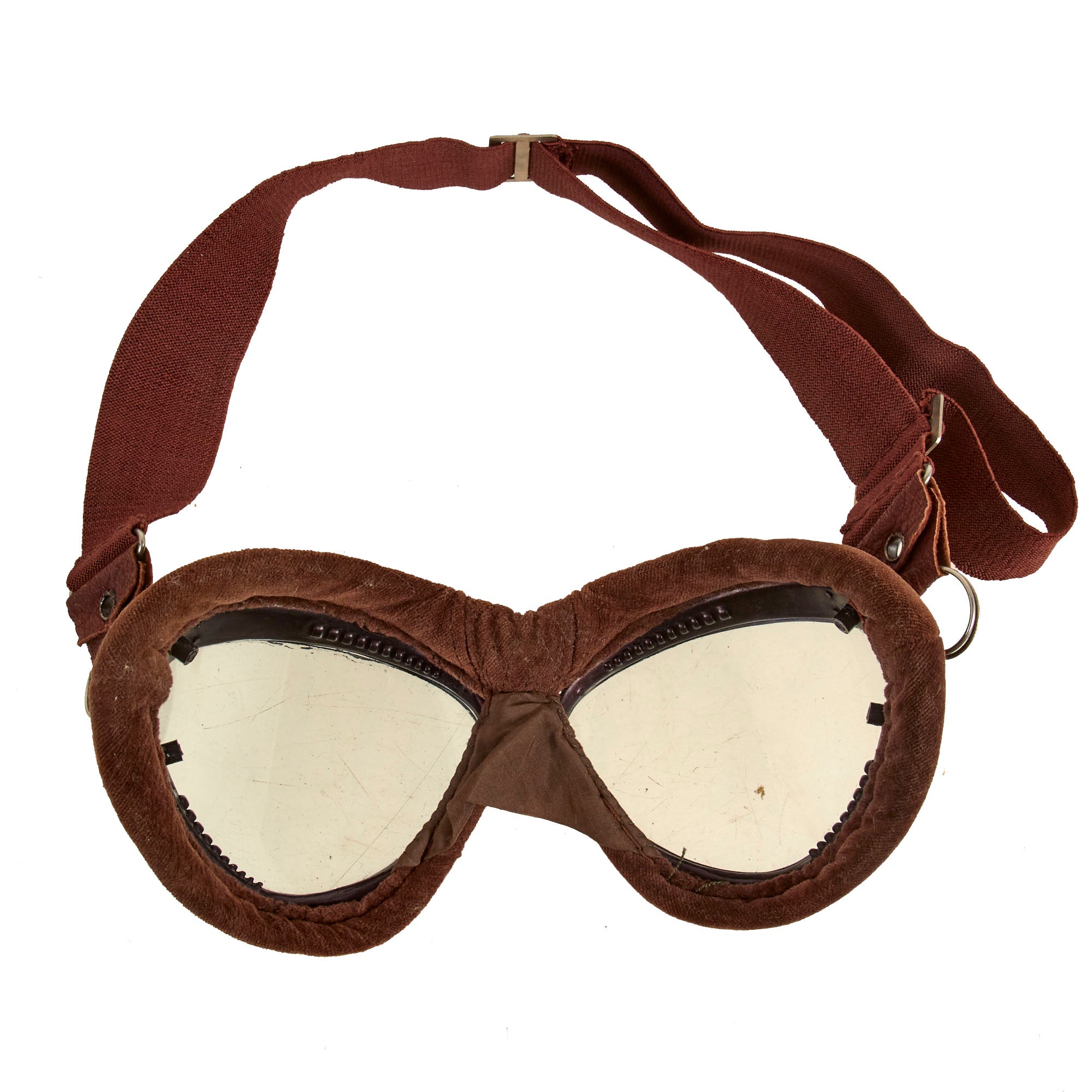 Included with the helmet are classic cat eye goggles as worn by Japanese Army Pilots during WWII. Maroon aluminum frames with brown velvet face pads. Elastic headband strap is original and complete. Clear glass lenses are excellent. Offered in overall in excellent condition.