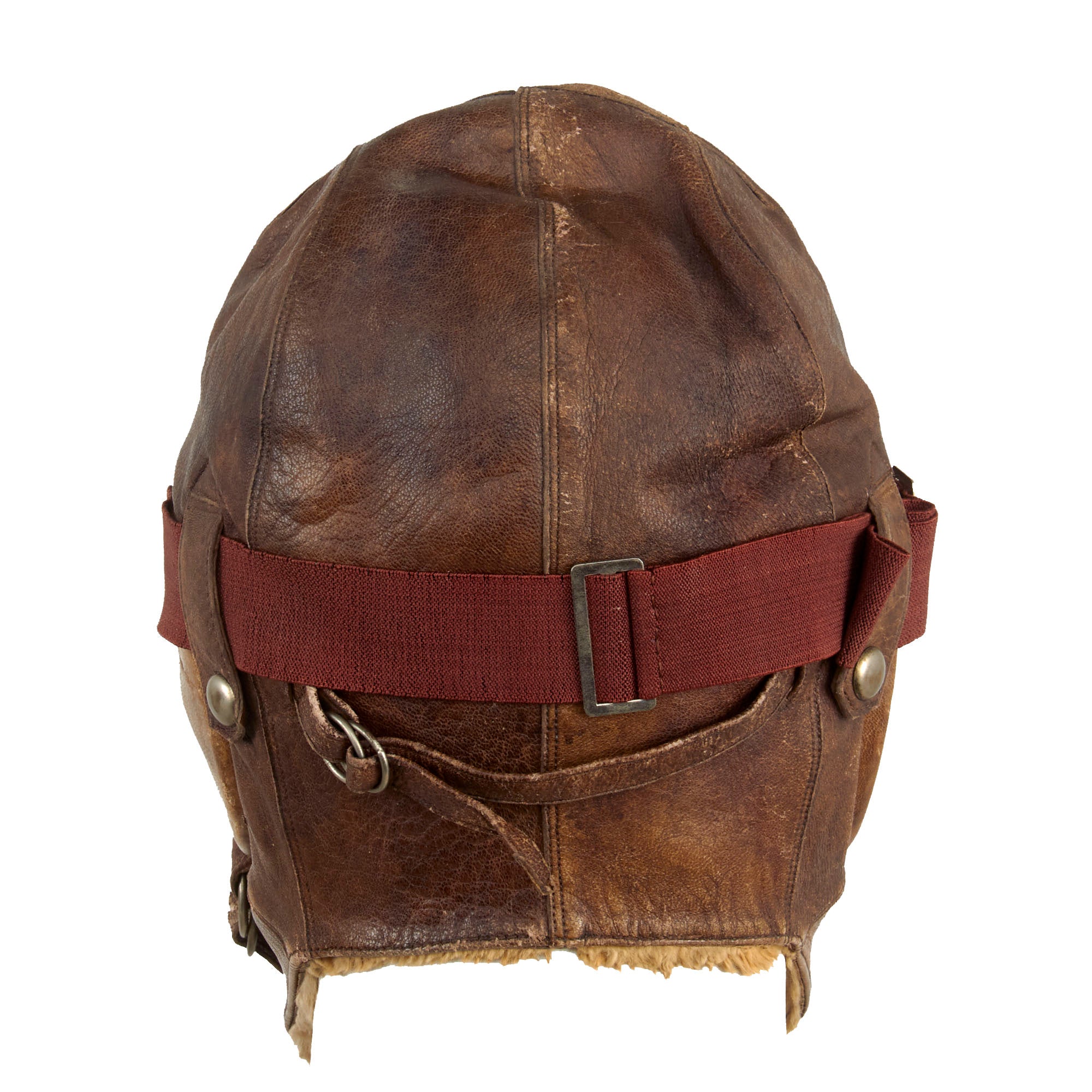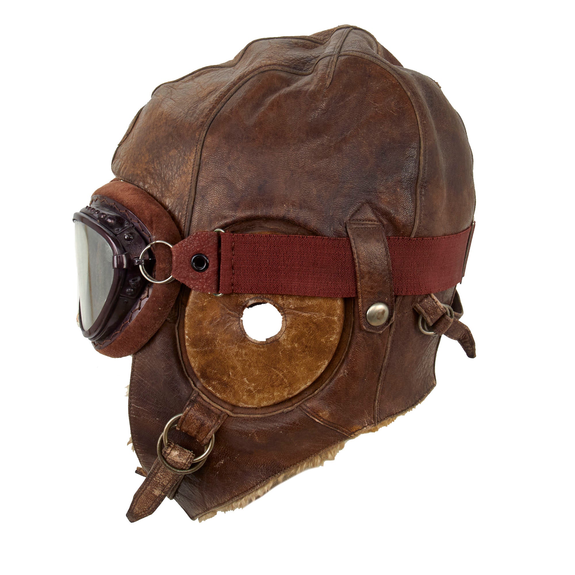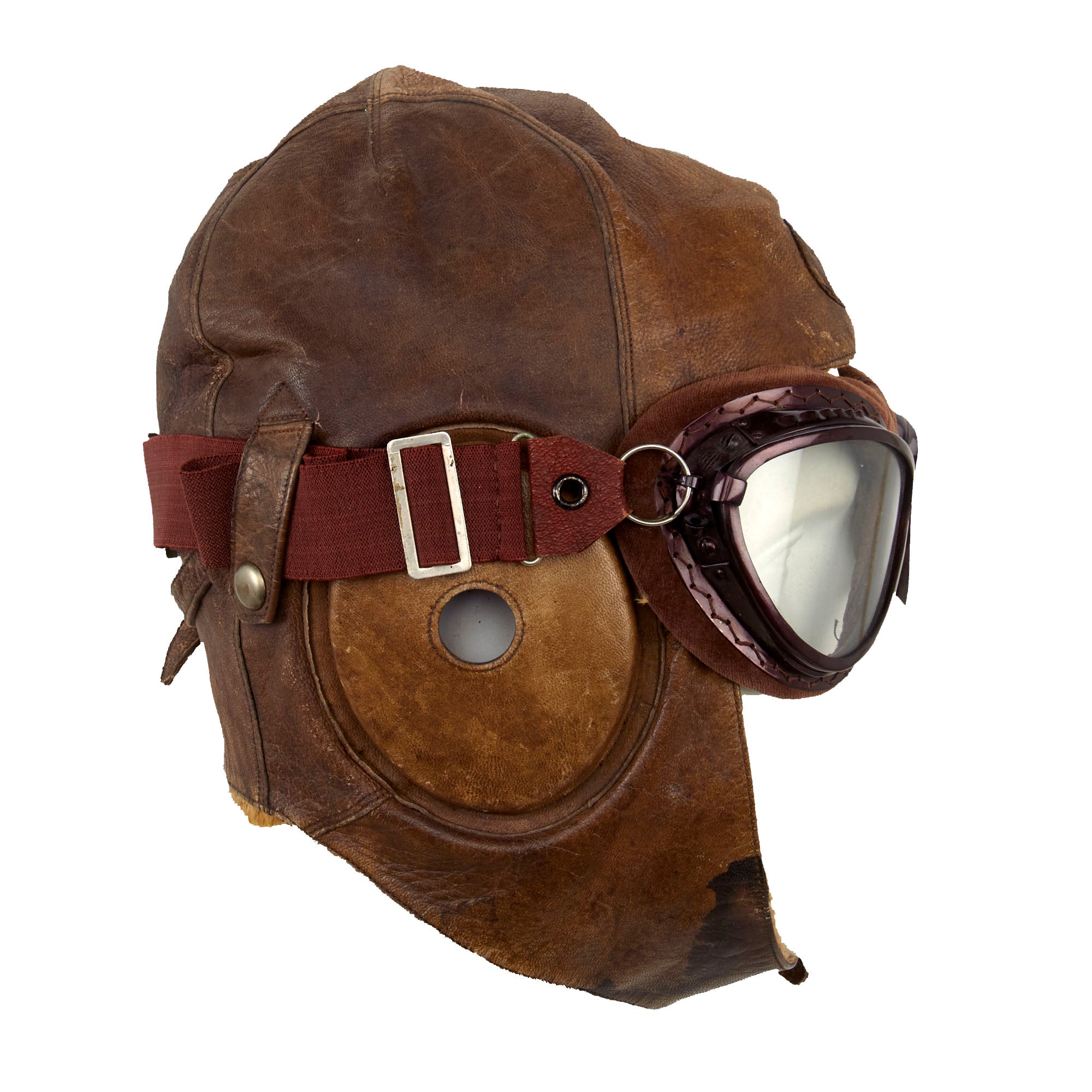 Included with the helmet are classic cat eye goggles as worn by Japanese Army Pilots during WWII. Maroon aluminum frames with brown velvet face pads. Elastic headband strap is original and complete. Clear glass lenses are excellent. Offered in overall in excellent condition.