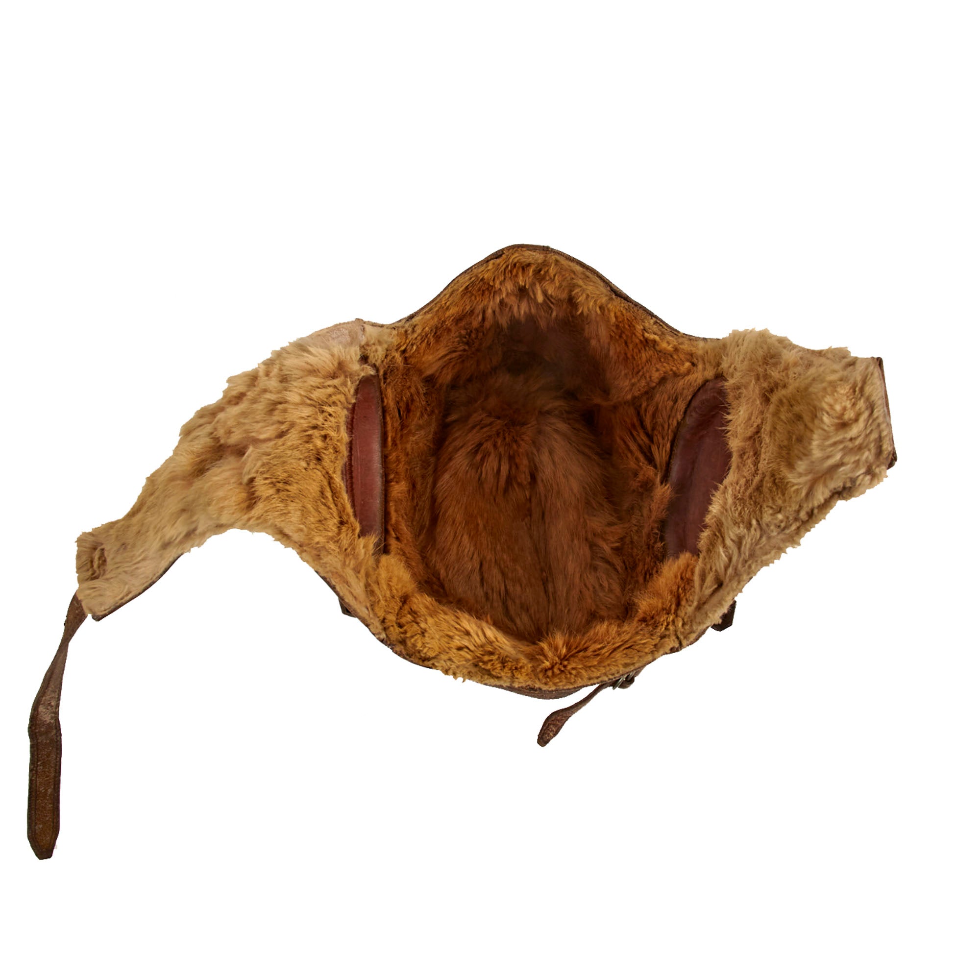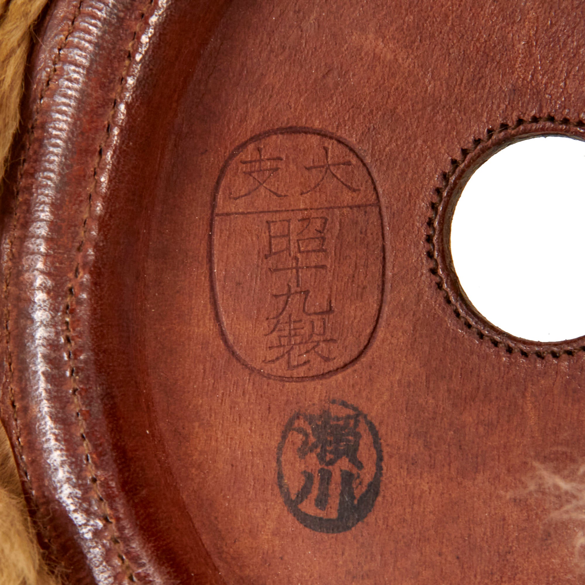 Original Items: Only One Set Available. Constructed of a rich medium brown leather, this helmet is offered in excellent condition. It is made of 8 separate pieces of leather, with a 5 pointed Japanese Army Star on the front. The interior is fur lined, the fur is soft and in wonderful condition. The rigid ear cups are complete, and made of hardened leather, each having holes in the center for mounting the communication equipment and receivers. The interior of one ear cup is marked; 昭 十 九 製 which means SHOWA 15 MANUFACTURED for production in 1940. All straps are fully functional, all the buckles and tabs work perfectly.