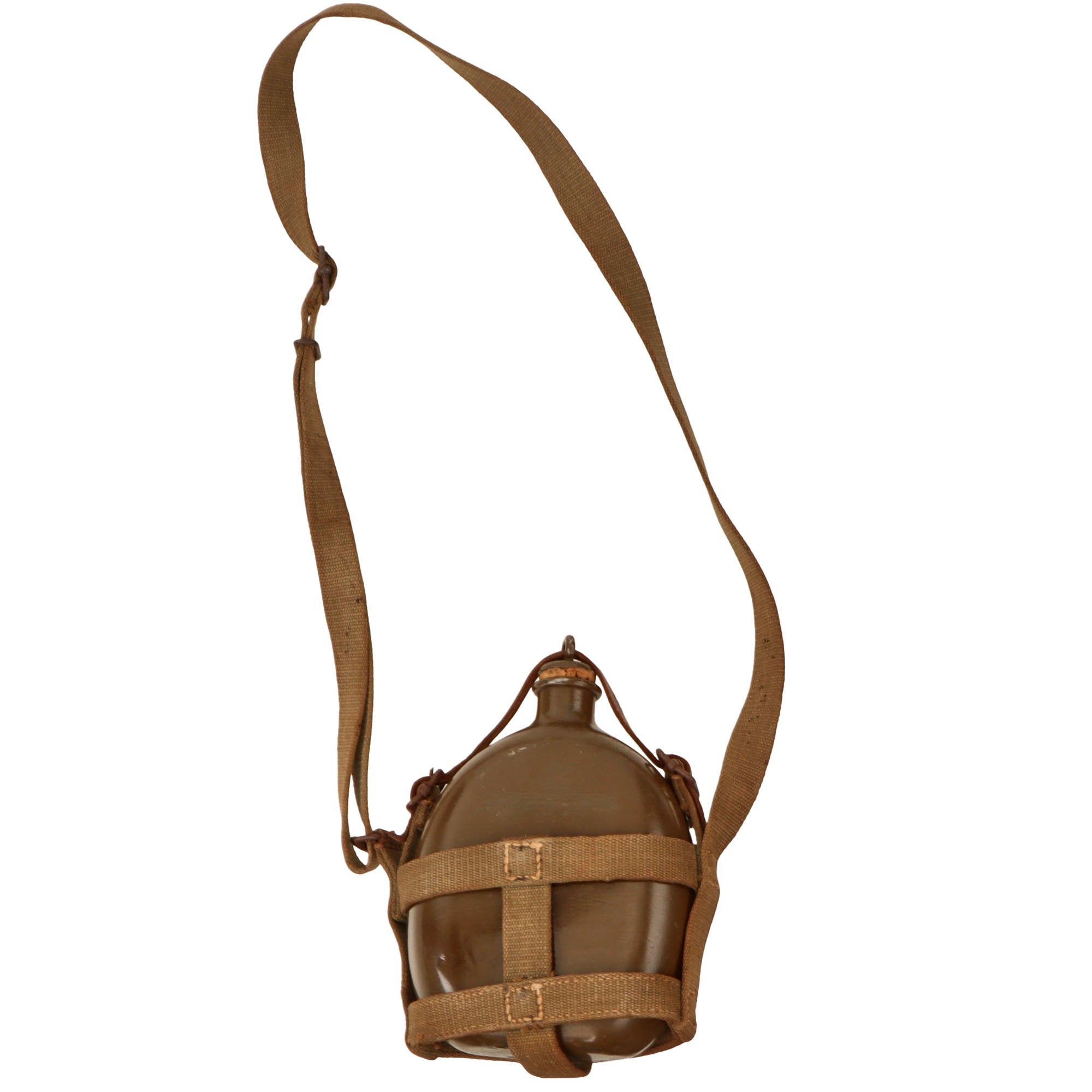 The web harness is in good condition, with the expected fading and wear from being in long service. There are some faded ink stamp markings on the fixed end of the shoulder strap, which we unfortunately cannot read. The leather strap that retains the canteen and stopper is somewhat worn and shrunken and does have some cracking present.