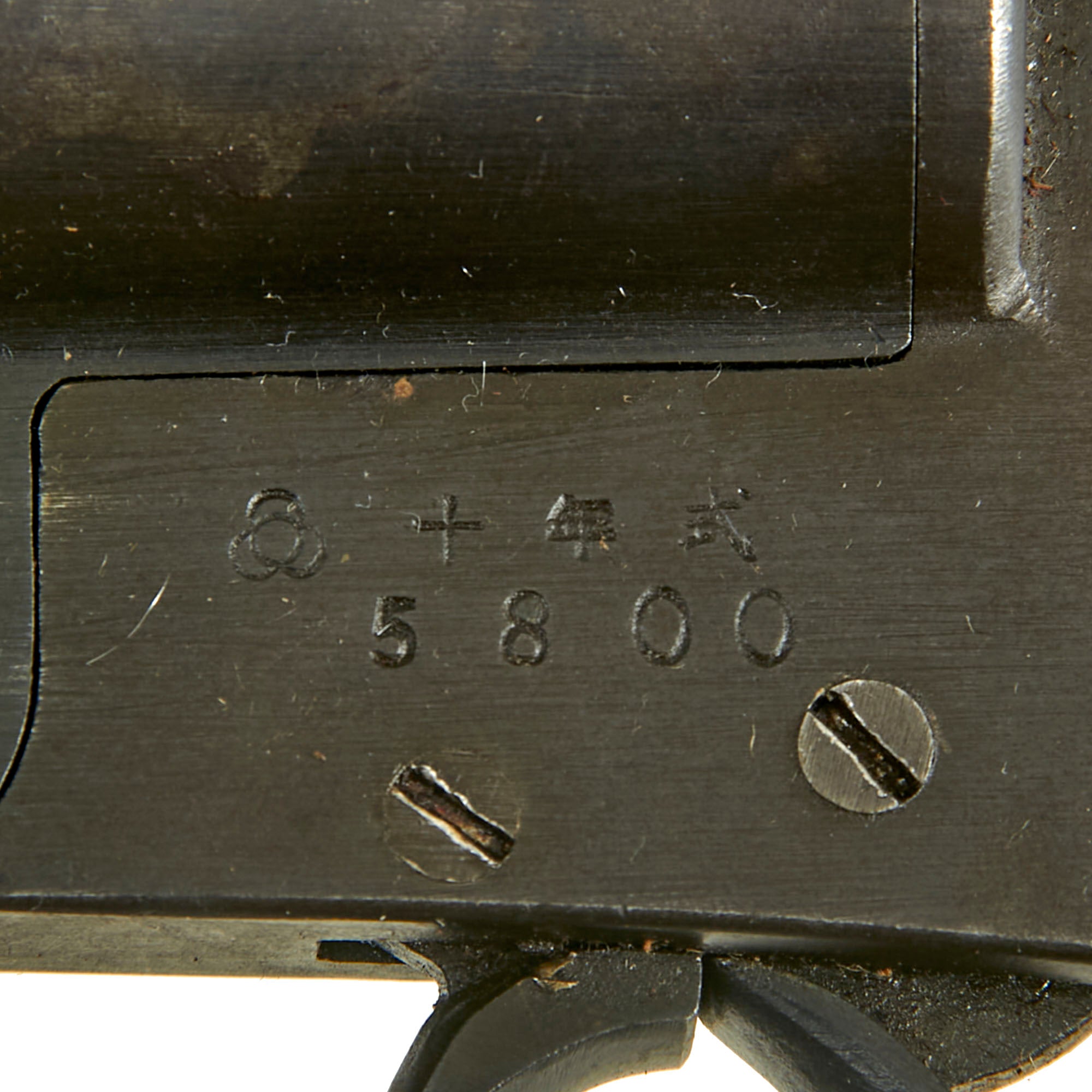 The left side is marked with the "cloverleaf" logo used by Tokyo and then Kokura Arsenals, and represents four stacked cannon balls viewed from above. After this are the Japanese characters 十 年 式 (Juu Nen Shiki), meaning Type of the Tenth Year, or Type 10. Below that is the serial number, 5800, which matches the 800 on the bottom of the barrel. Production was moved from Tokyo to Kokura Arsenal's second factory in 1935 around serial number 1400. That factory averaged about 700 pistols a year until production was moved to another part of Kokura Arsenal in 1944. That means this specimen was probably made around five years after the move to Kokura, or about 1943, give or take a year.