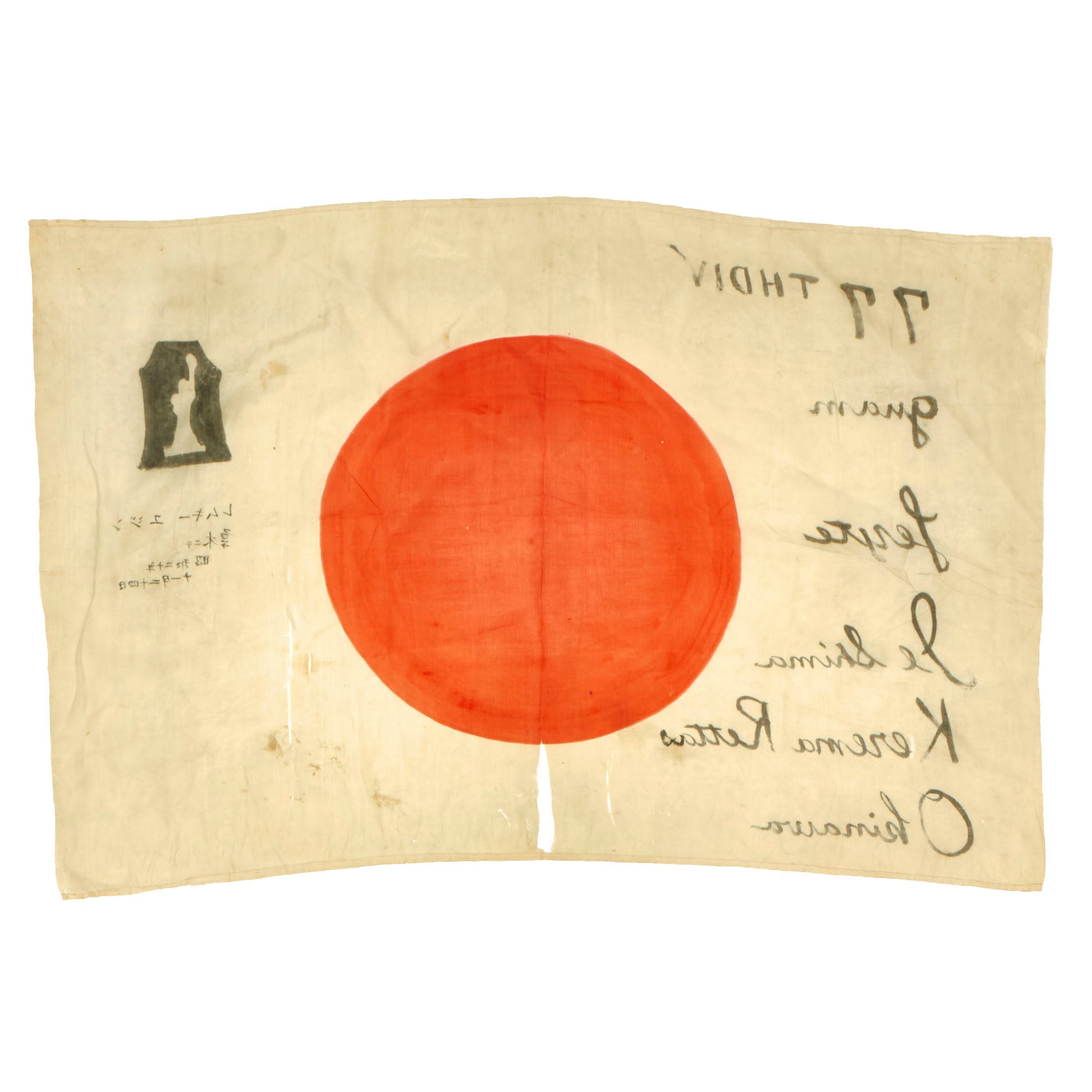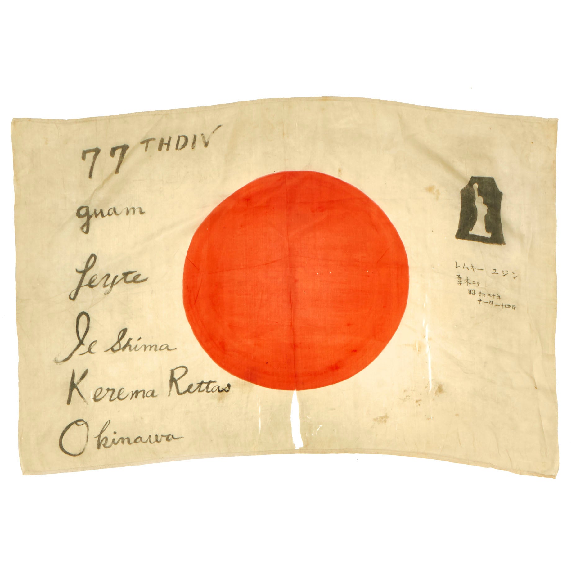 Original Item: Only One Available. This is a lovely example of a GI decorated captured Japanese “Meatball” flag. According to a piece of paper that accompanied the flag, this flag was captured by T/Sgt Eugene C. Lemke of the 307th Infantry Regiment, 77th Infantry Division.