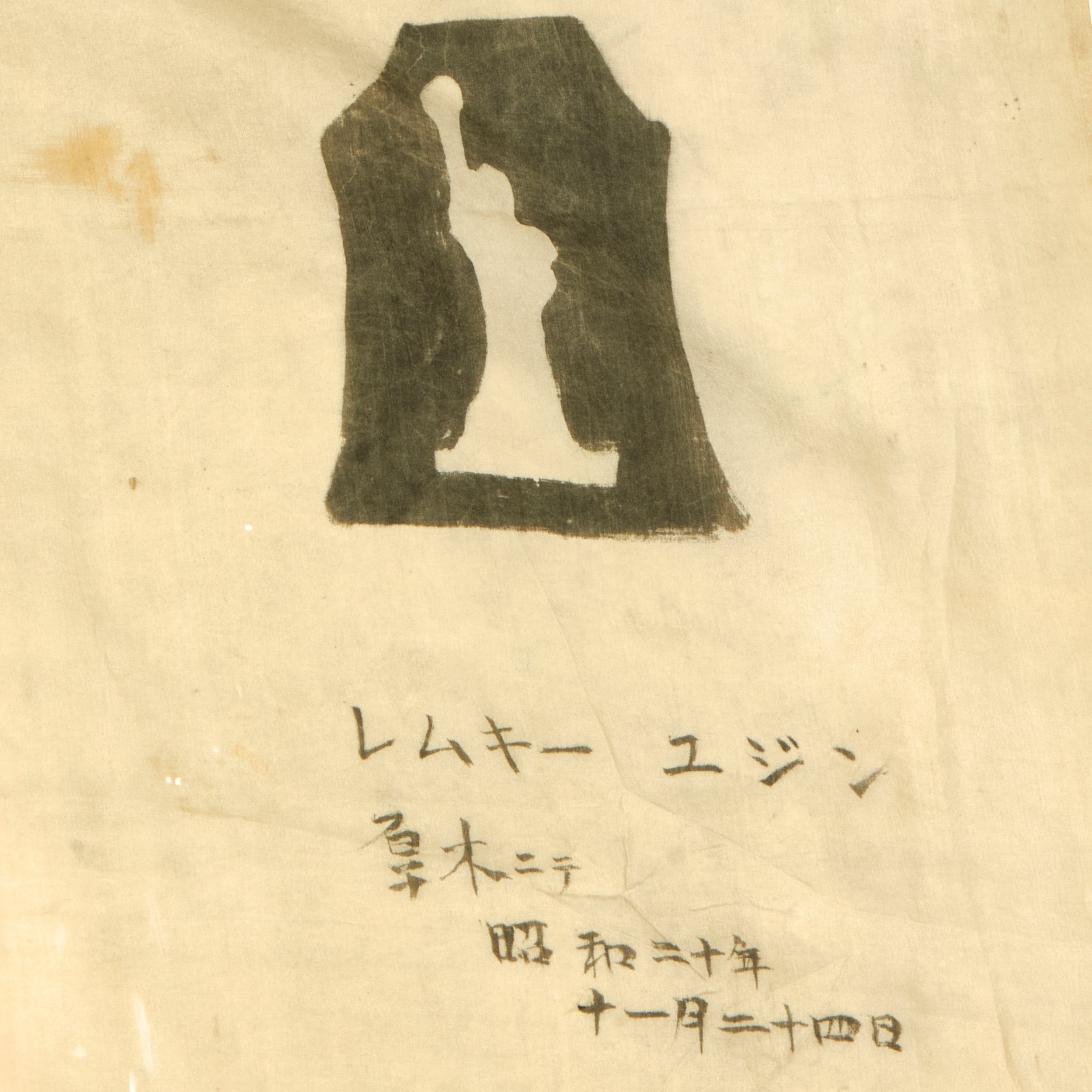 The flag is personalized with the locations for Guam, Leyte, Le Shima, Kerama Retto and Okinawa. On the right side of the flag is a silhouette of the 77th Infantry Division Statue of Liberty insignia. Beneath it is writing in Japanese, with the first line in KATAKANA, the syllabic writing used for foreign words. The characters written areレムキー ユ ジ ン, read RE-MU-KI-I YU-JI-N, or Lemke Eugene (Surnames come First in Japanese). The second line has a character we do not recognize, followed by what looks to be 木ニテ, which we were not able to translate. The last two lines are a date: 昭 和 二 十 年 十 一 月 二 十 四 日, which would be read SHOWA (current reining emperor), 20th Year of reign (1945), 11th Month, 24th day, so November 24th, 1945. This is about 2 months after the end of the War in the Pacific on September 2nd, 1945.
