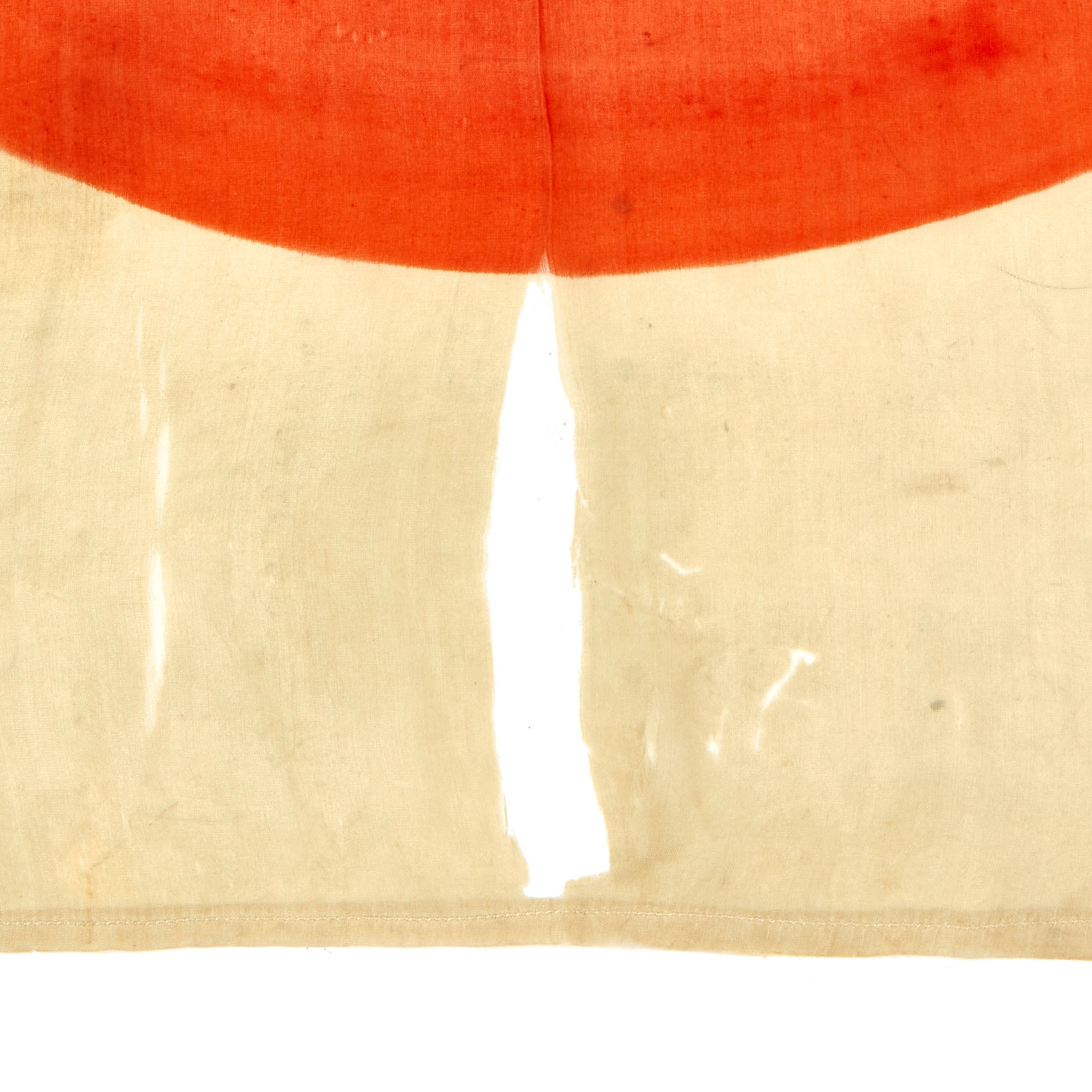 This is a lovely example of a captured WWII Japanese silk flag. The flag does show signs of wear and use with some tearing present. The flag measures approximately 24" x 36 ½” and is made of what appears to be early rayon silk or something similar, with the red "sun" dyed into the middle. Overall the flag is in good condition and is the real deal: a genuine USGI "bring back"!