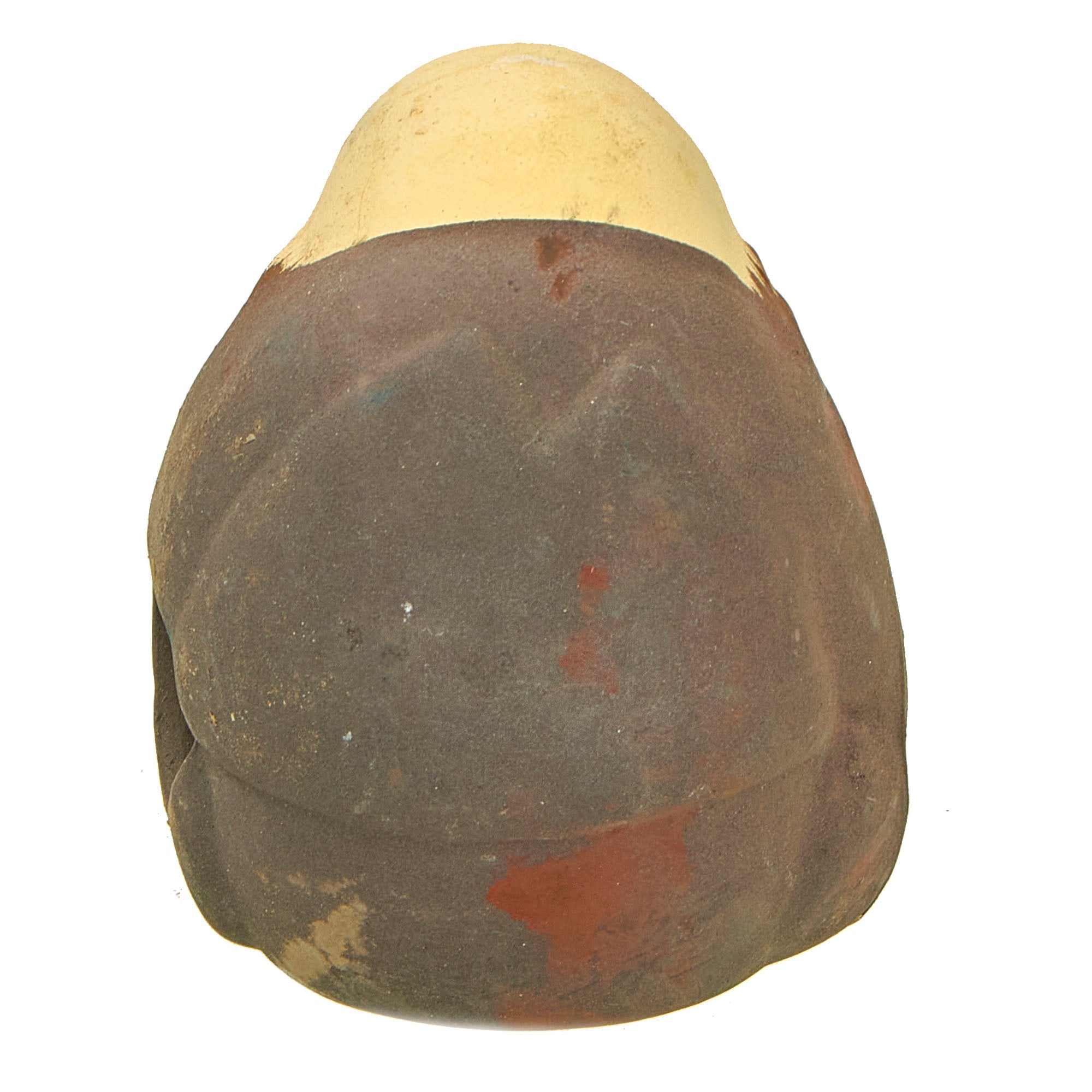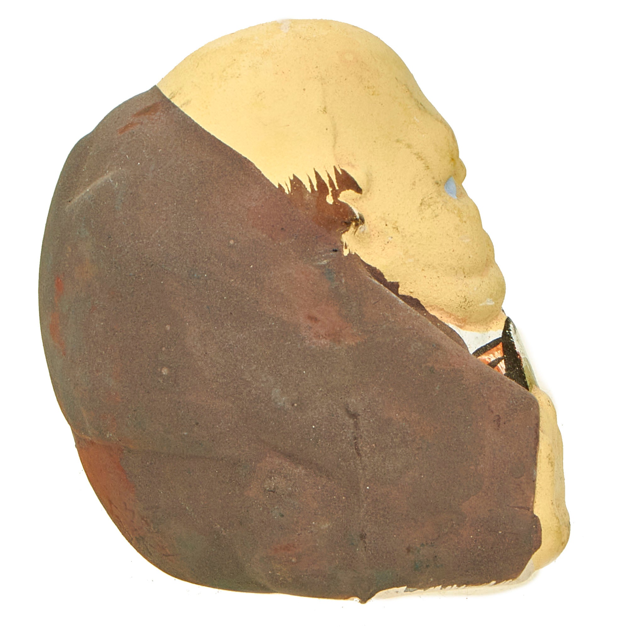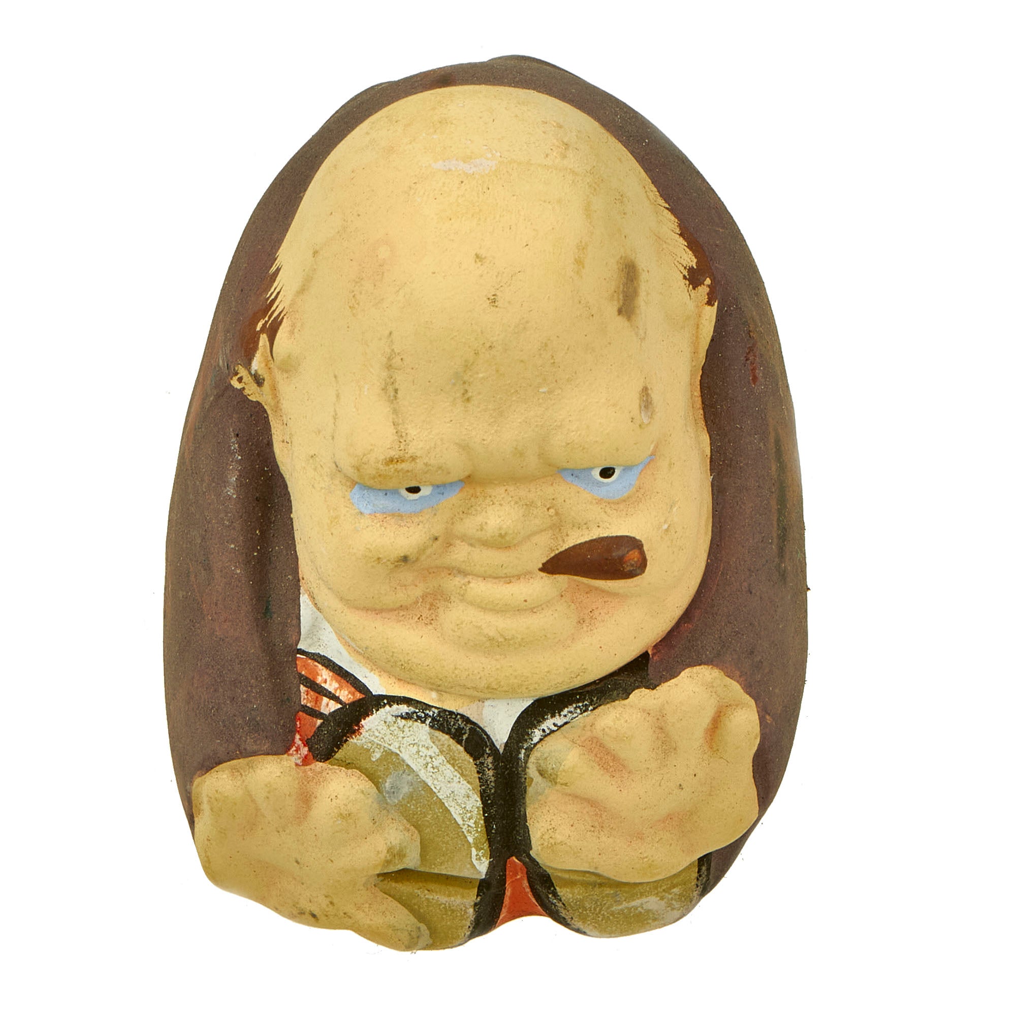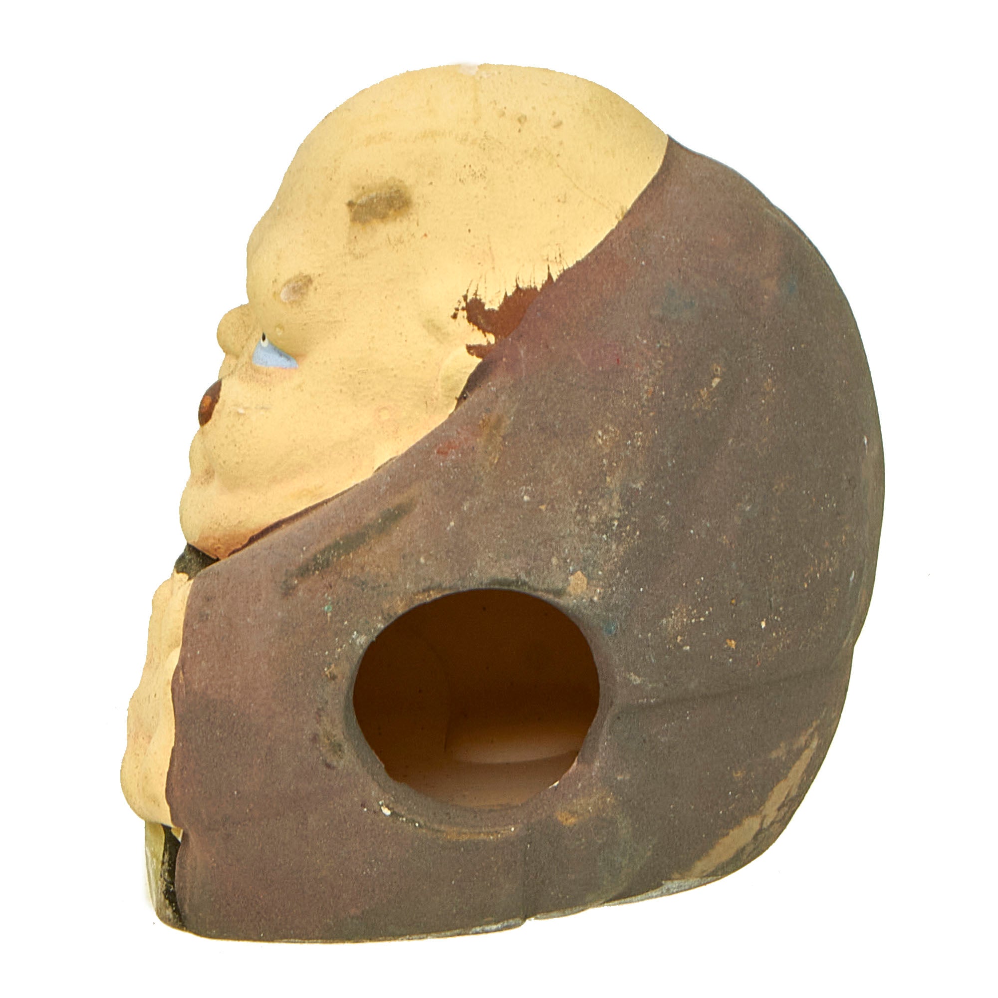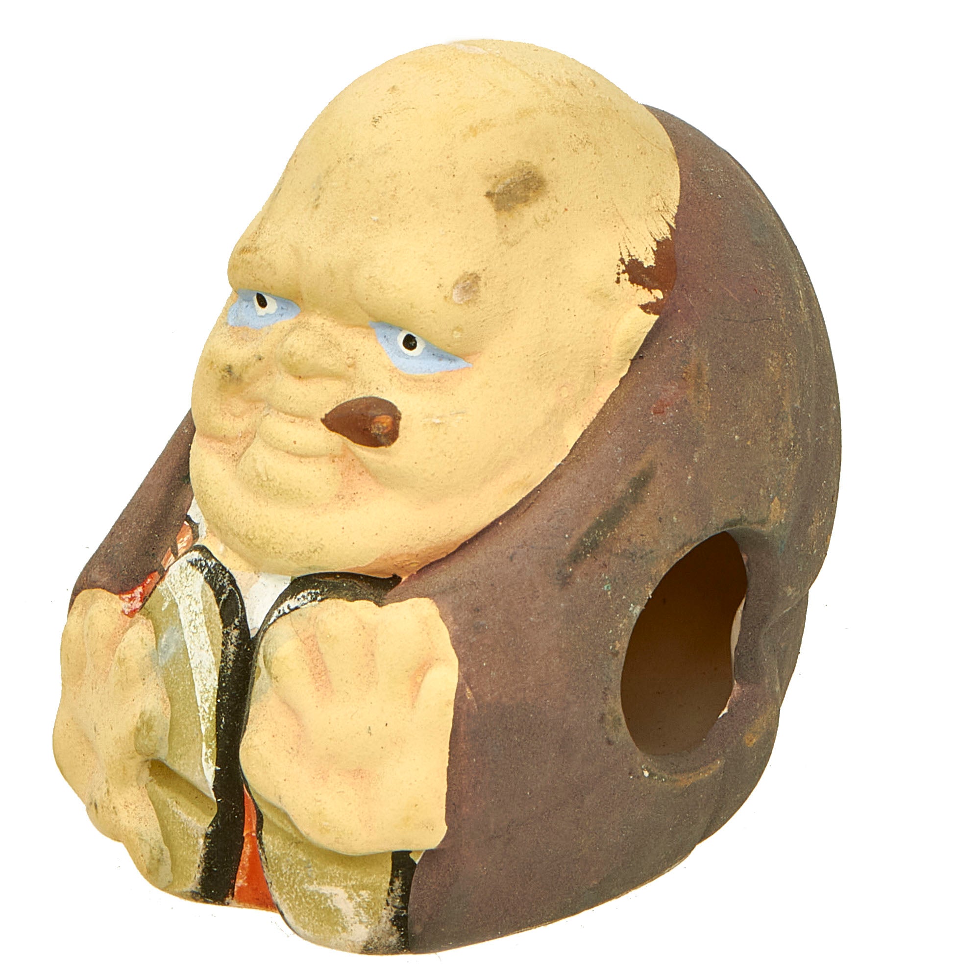 Original Item: Only One Available. This is a lovely piece of WWII Japanese Anti-British memorabilia, in the form of a small ceramic caricature of British Prime Minister Winston Churchill. Measuring 2 3/4"H x 2 1/4" x 2 1/4", this is a "match striker", and it was intended that you would strike your match on his forehead, and then dispose of the match in the hole in the left side. This example appears to be unused, but does show wear and discoloration from display and storage. The bottom of the match striker still has the original Japanese markings in blue.