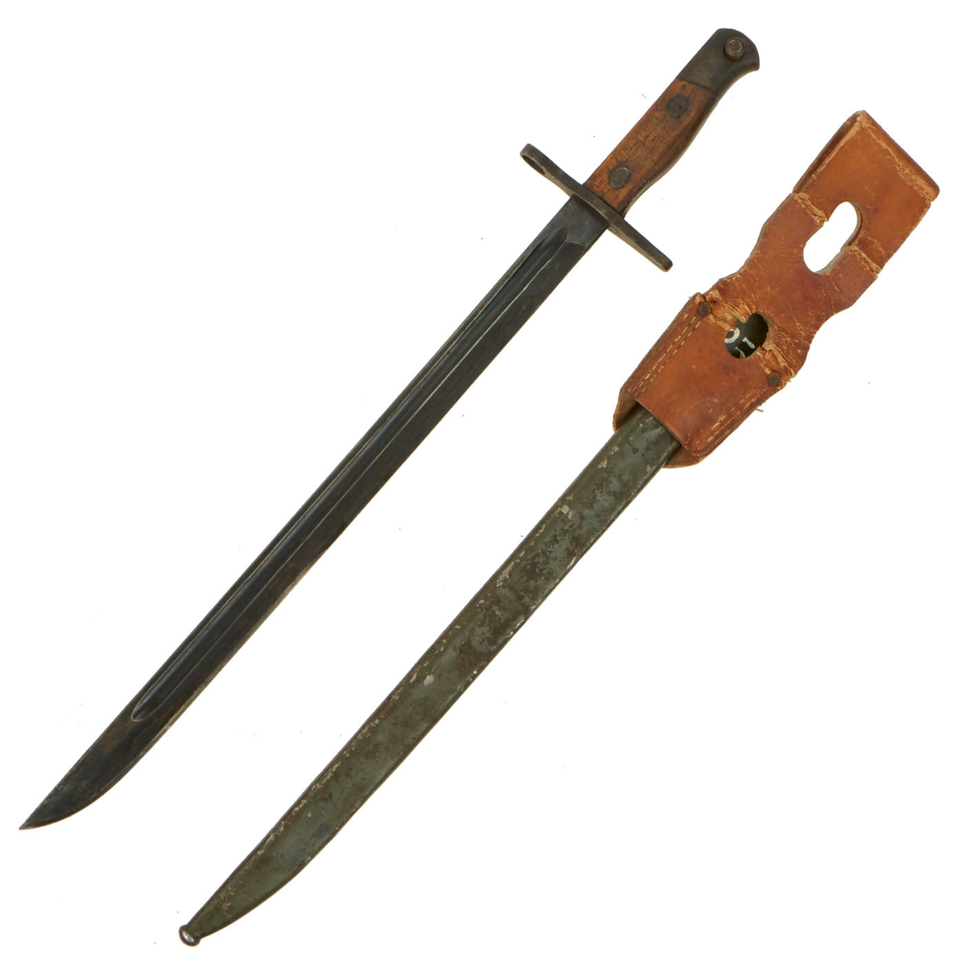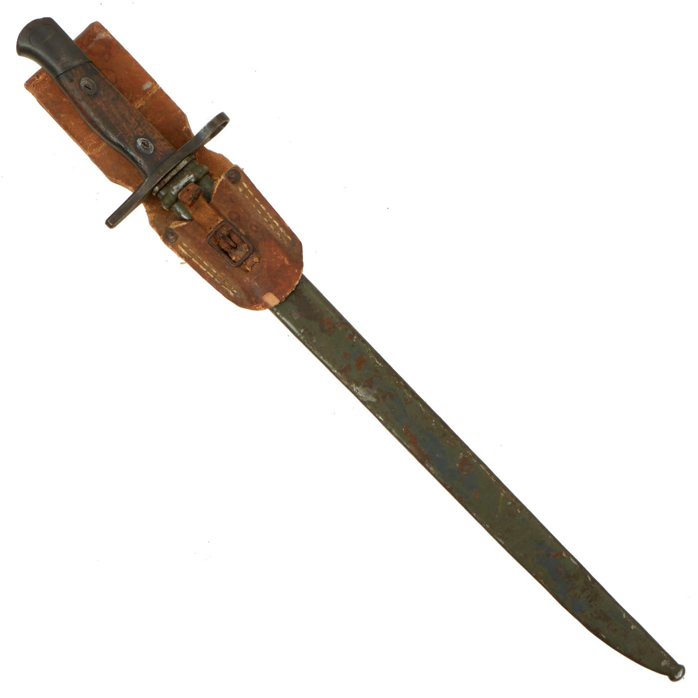 Original Item: Only One Item Available. This is a very good condition WWII issue Japanese Model 30 Arisaka rifle bayonet, manufactured by Mukden Arsenal in occupied China. It comes complete with an original steel scabbard, and an extremely rare rubberized canvas frog. This is the first example of a Mukden Arsenal bayonet that we have ever had!