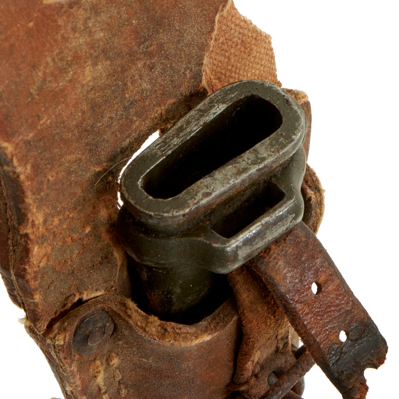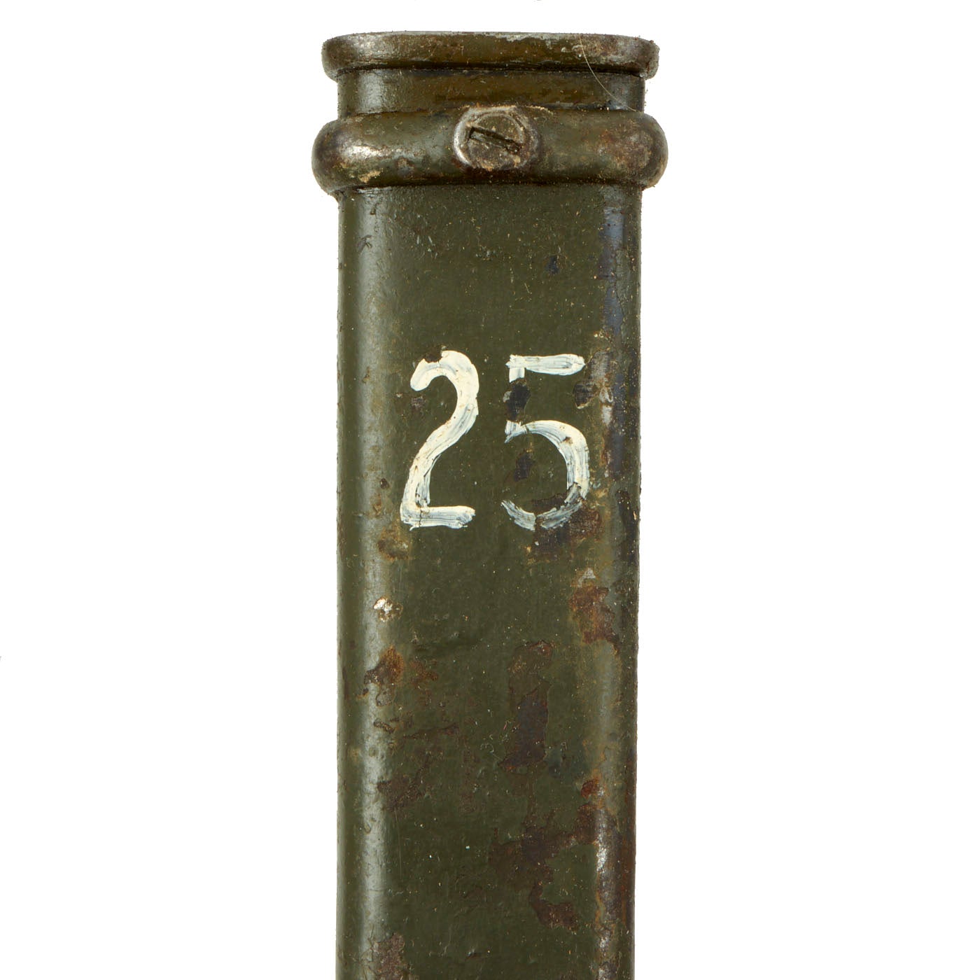 The scabbard has a very nice finish but unfortunately is chipping in some sections exposing bare metal which now has a light rusting. The rubberized frog is in fair condition, as over time the rubber degrades. It is cracked and torn in various locations and the leather strap used to secure the frog to the scabbard is torn.