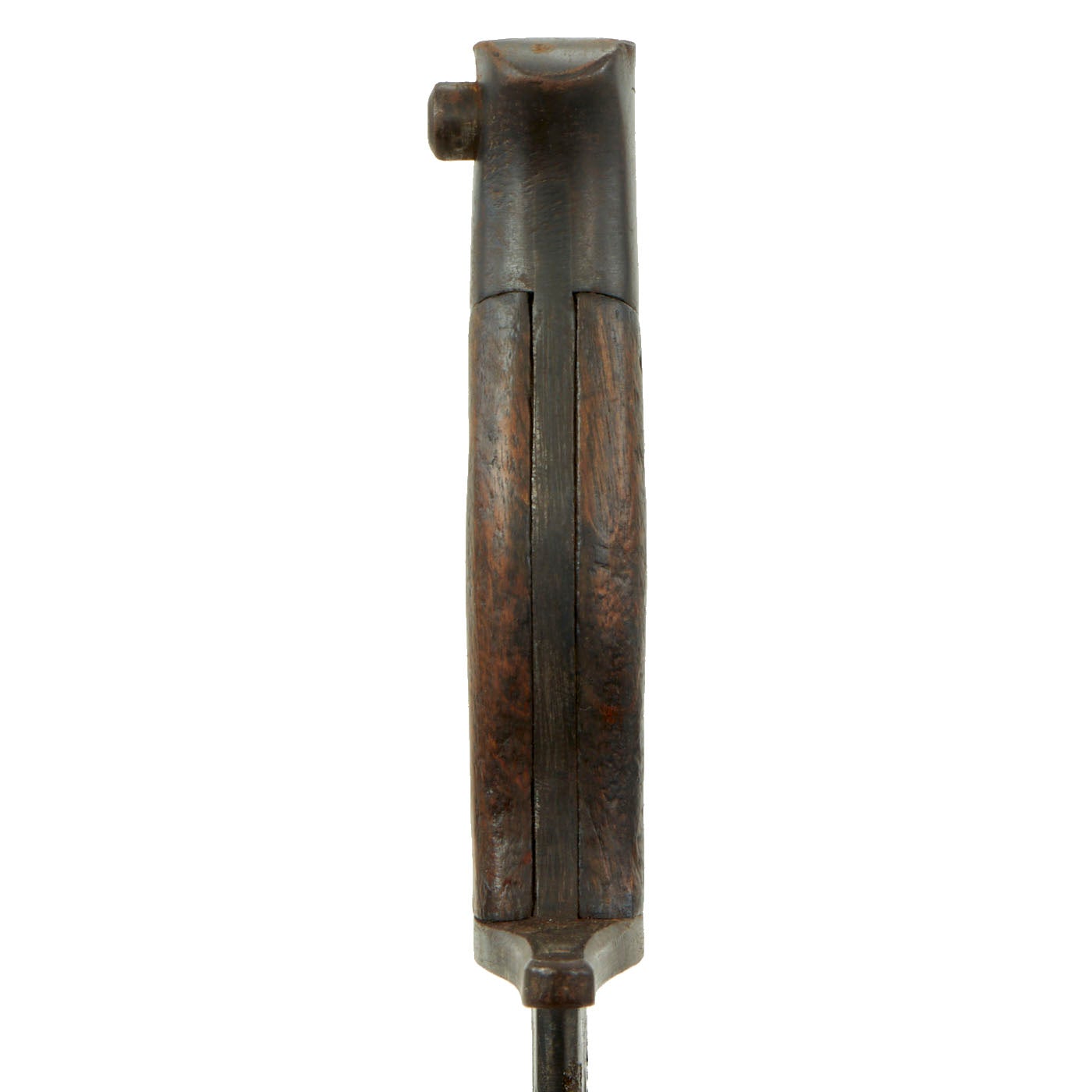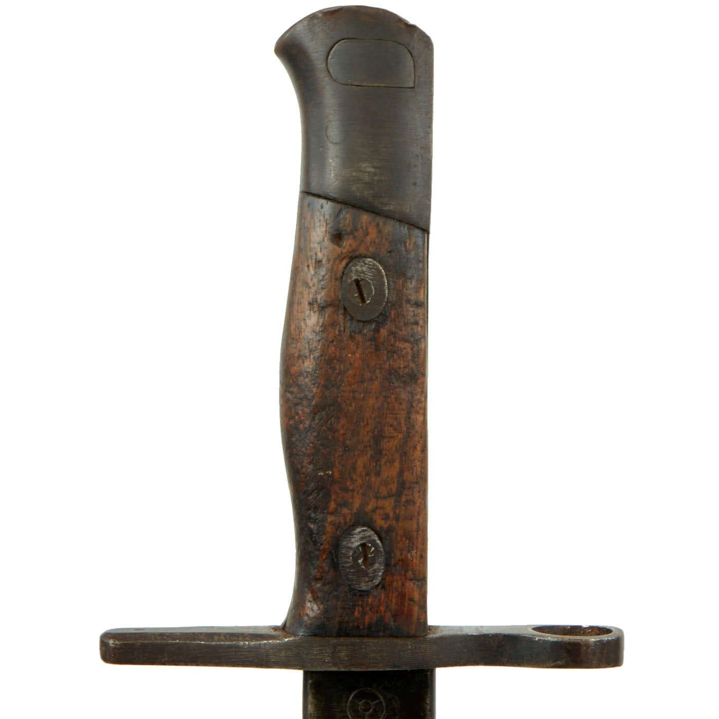 This bayonet is of the later war design, with a straight contoured crossguard and a contoured "bird's head" pommel. The screw-retained wooden grips are contoured and do not wrap around. The blade is fullered and still retains almost all of the original bluing. This configuration matches the final pattern manufactured by Mukden Arsenal.