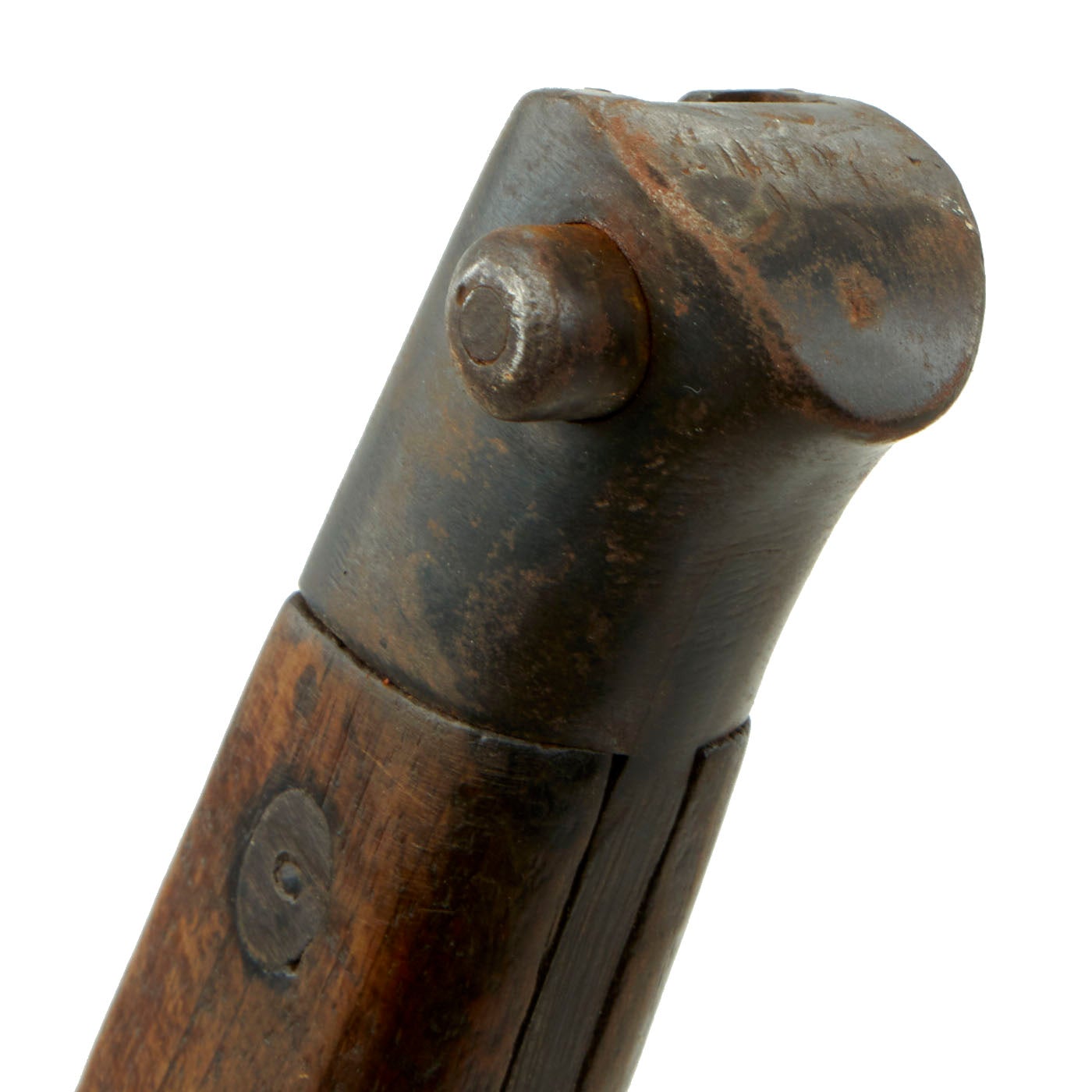 Condition of bayonet is excellent, with lots of the original finish and only light wear from storage and the scabbard. There is a bit of runner wear on the blued steel blade, which still has the original factory "blunt" edge on the first half of the blade, as is correct. The wooden grip scales are in very good condition.