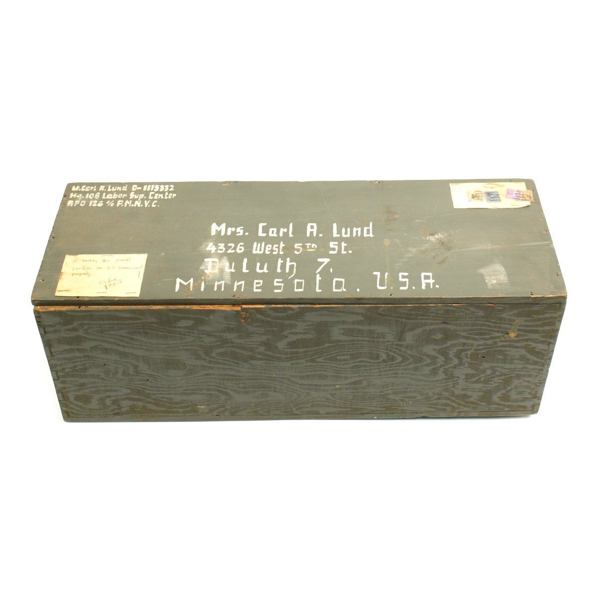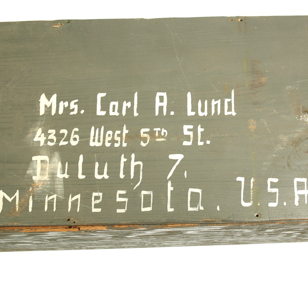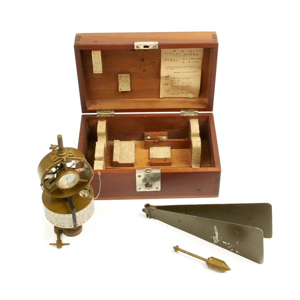 Lt. Carl A Lund 0-1115532Hq 108 Labor Sup. CenterAPO 126 c/o P.M.N.Y.CMrs. Carl A Lund4326 West 5th St.Dultuh 7Minnesota, USAThere is a label on the box that reads I certify No government property Carl Lund 1st Lt. CE. The box also bears multiple wartime postage stamps.These devises were very important for the Japanese Air Force in World War Two. A very high quality precision instrument, complete with custom case and tripod all contained in a named and dated bring back box.The Imperial Japanese Army Air Service or Imperial Japanese Army Air Force or, more literally, the Greater Japan Empire Army Air Corps, was the aviation force of the Imperial Japanese Army (IJA). Just as the IJA in general was modeled mainly on the German Army, the IJAAS initially developed along similar lines to the Imperial German Army Aviation; its primary mission was to provide tactical close air support for ground forces, as well as a limited air interdiction capability. The IJAAS also provided aerial reconnaissance to other branches of the IJA. While the IJAAS engaged in strategic bombing of cities such as Shanghai, Nanking, Canton, Chongqing, Rangoon, and Mandalay, this was not the primary mission of the IJAAS, and it lacked a heavy bomber force.