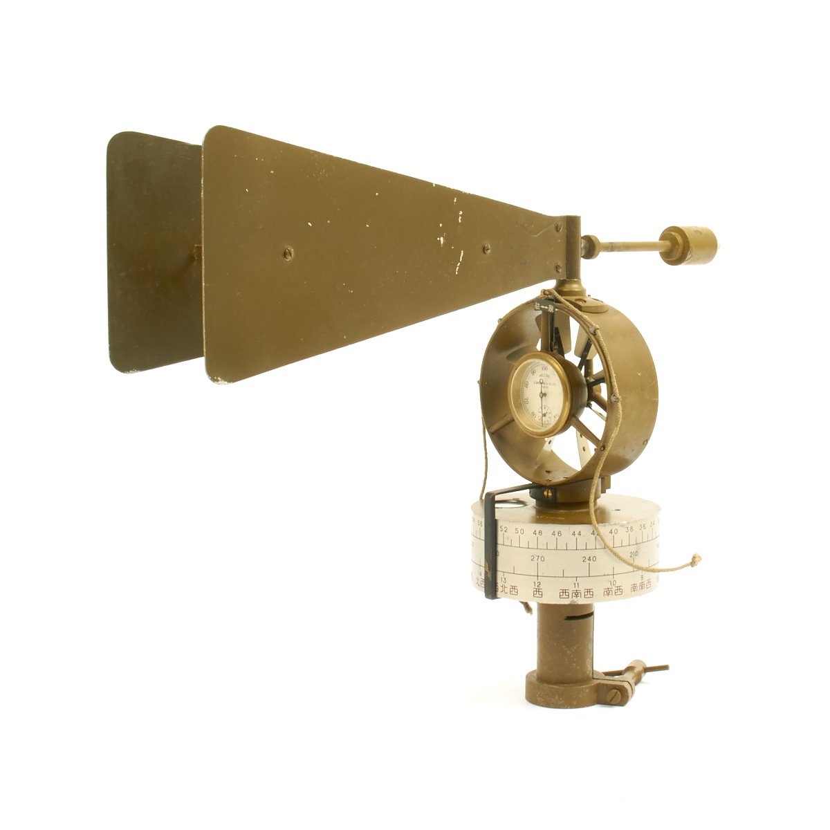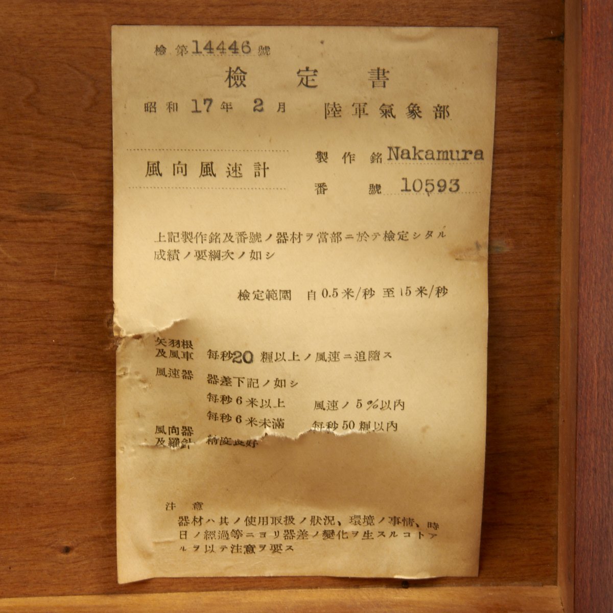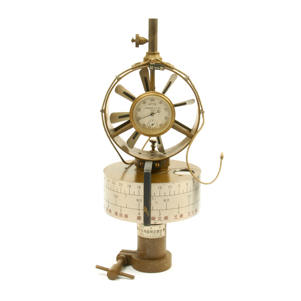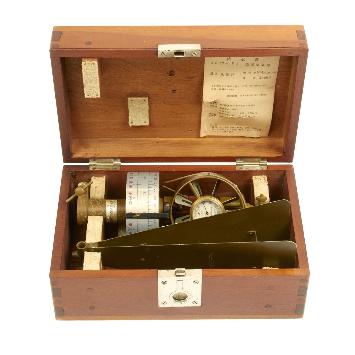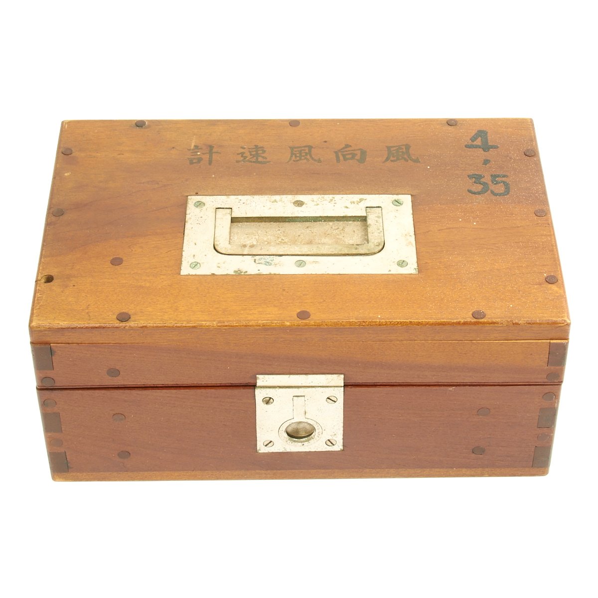 Original Item: Only One Available. A precision instrument finished in Japanese Army brown paint with a detachable wind vane neatly contained in a custom locking wooden case with data plate. As air passes through the central turbine the blades turn and registers wind speed on the dial. Dial is marked A. Nakamura & Co. LTD. Tokoyo. The instrument appears to operate perfectly.