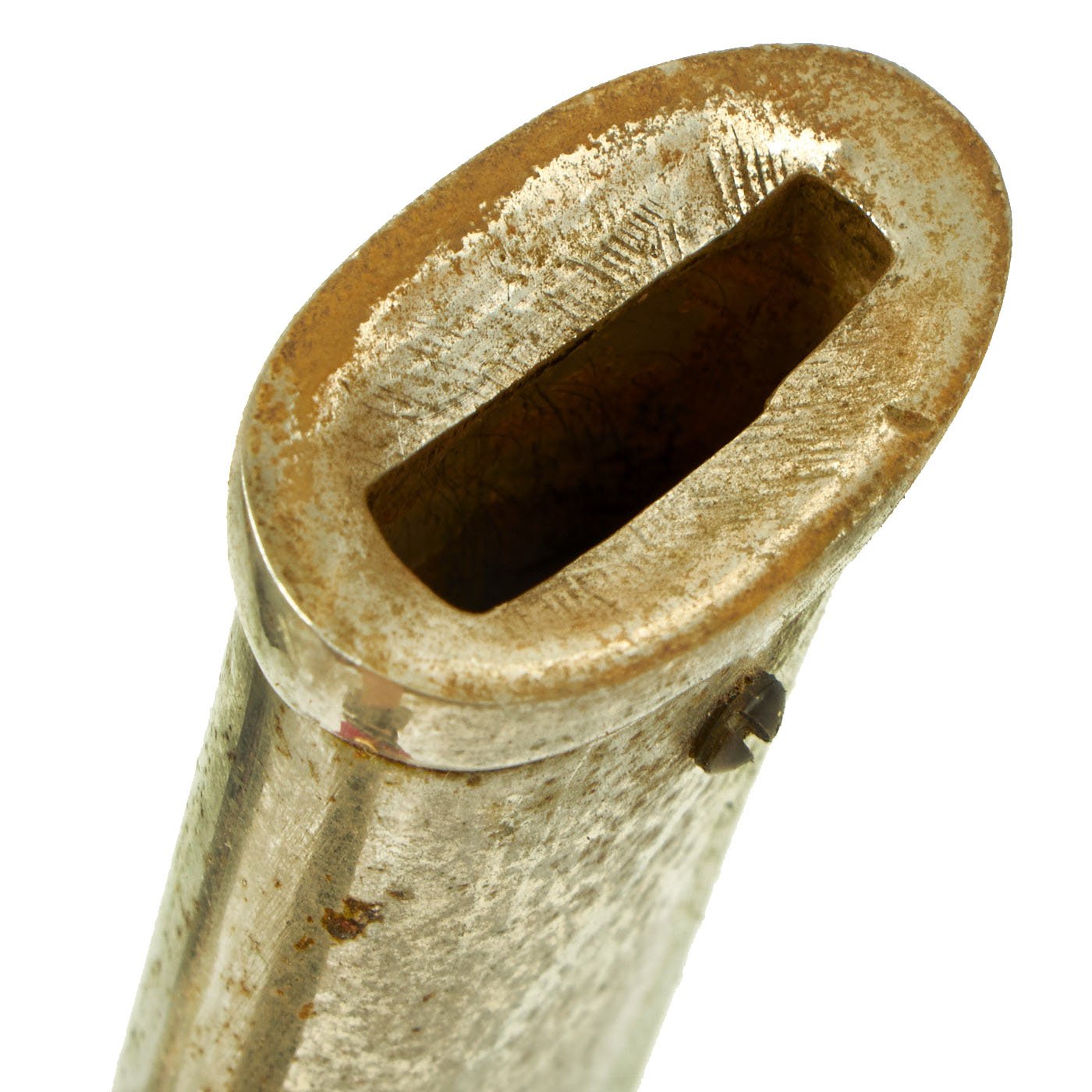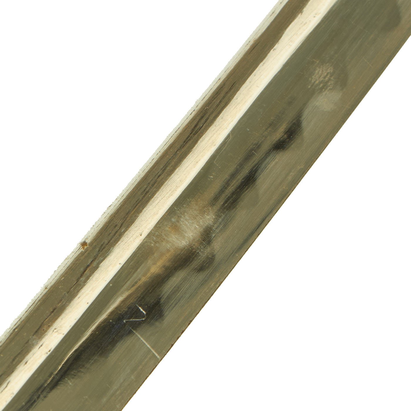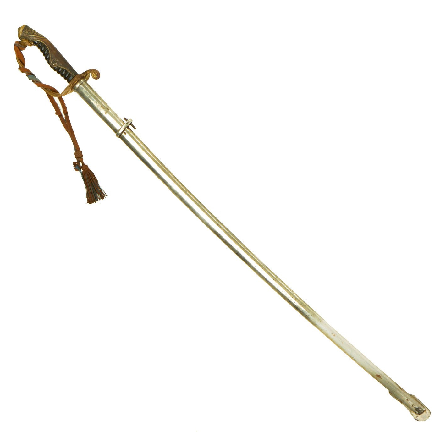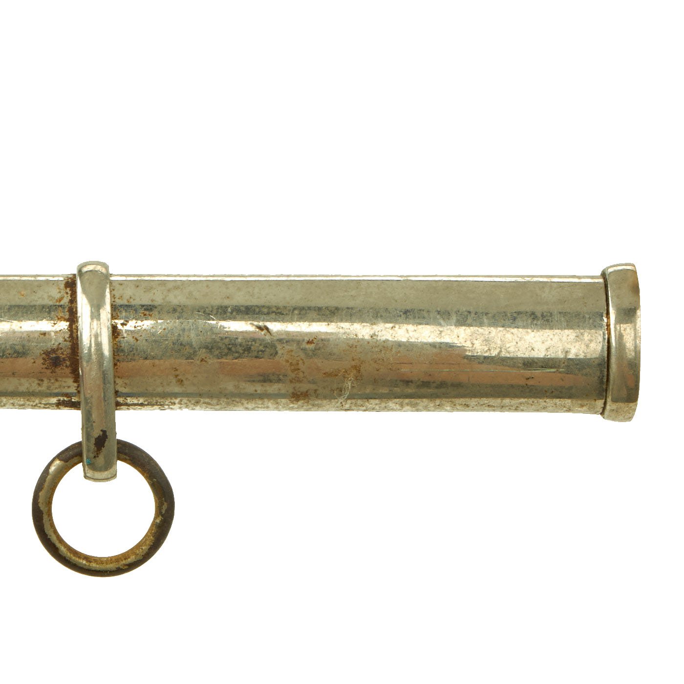The scabbard (saya) is nickel-plated steel, with the plating mostly intact. There is some wear on the drag area as well as small areas of bubbled plating, and overall it is speckled with oxidation. It is a very simple design scabbard, patterned after European swords of the 19th century. The hanging ring is still present and shows plating wear from use. The scabbard is dent free, and is really a nice patinated example.