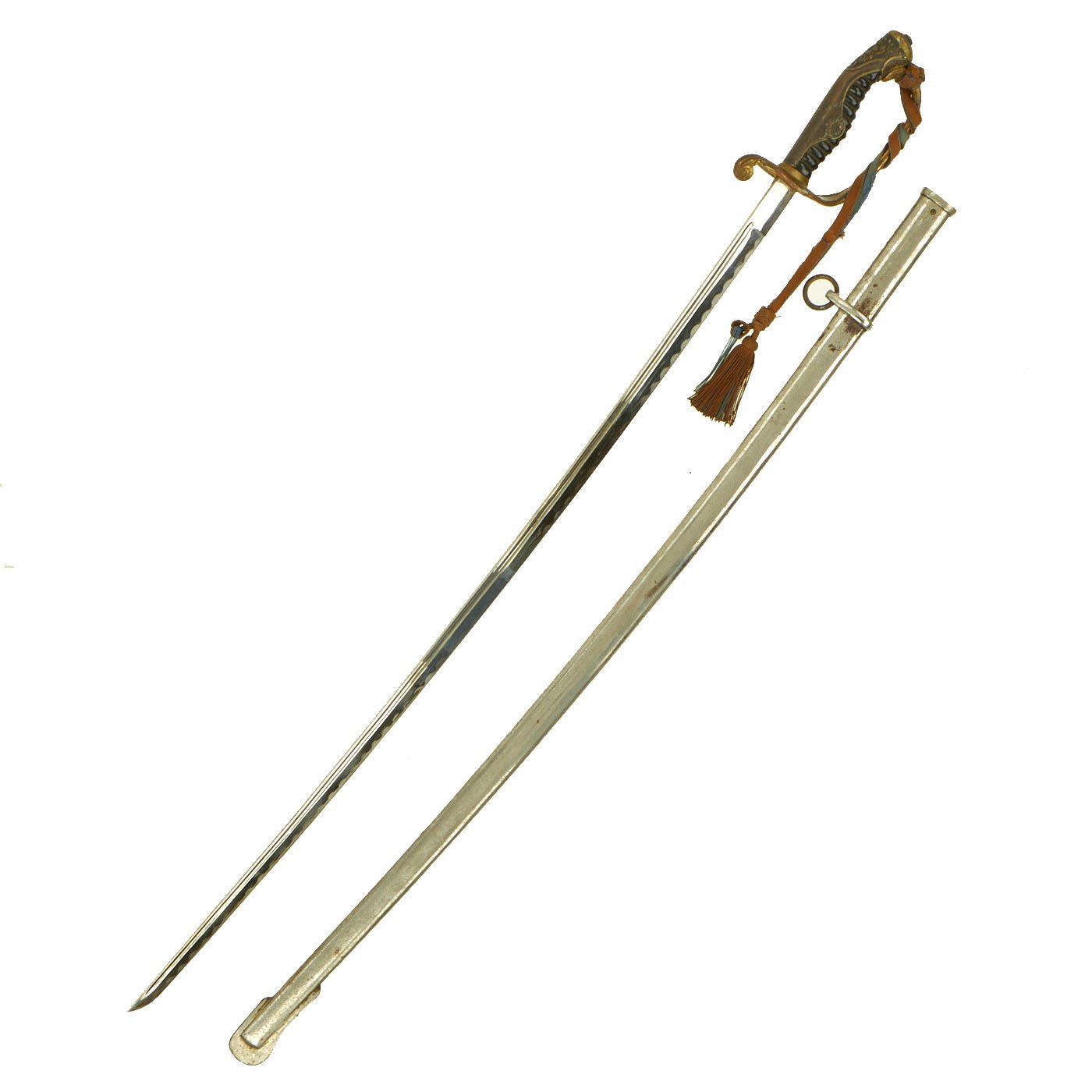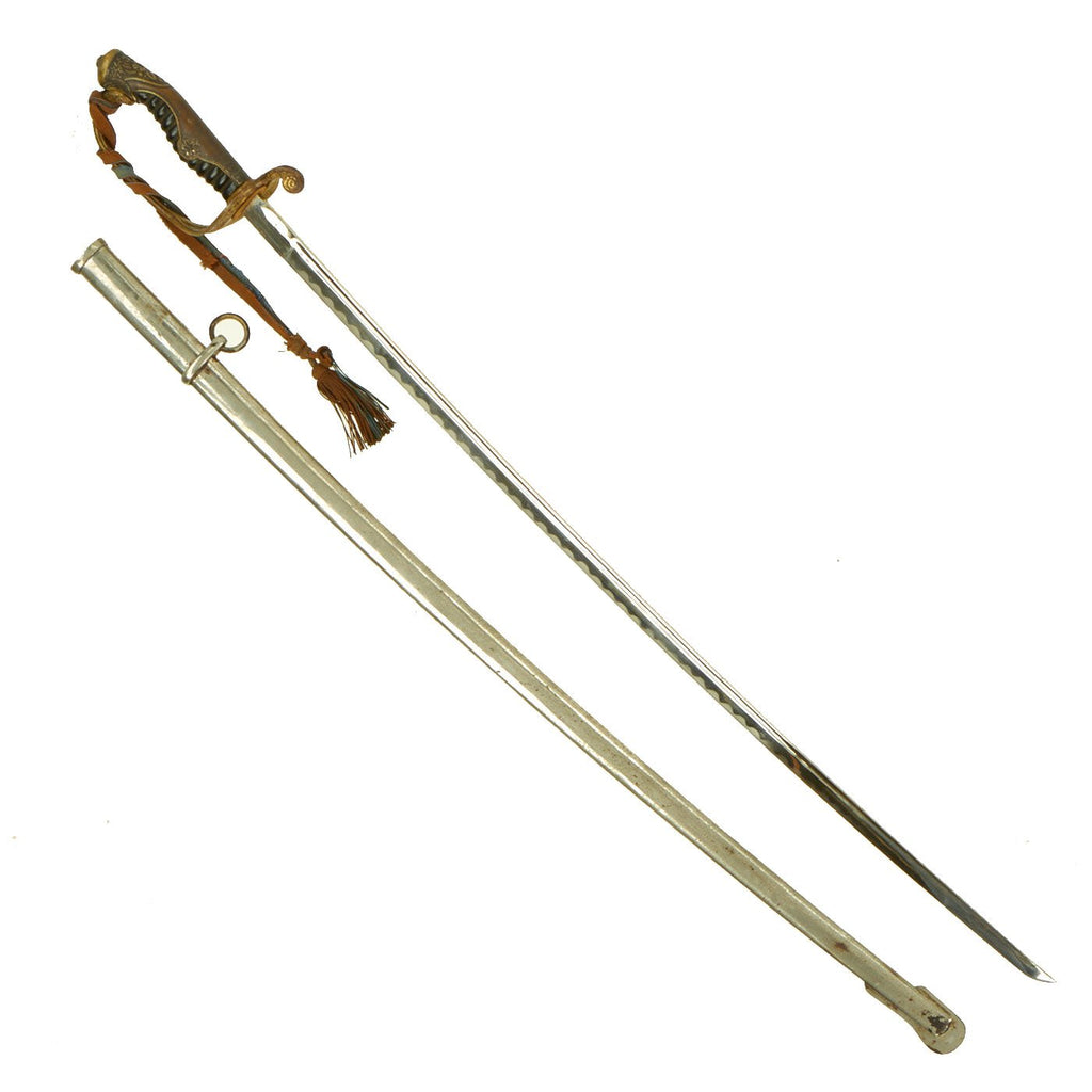 This is a great example of an Army Officer Kyu-Gunto, complete with the original nickel-plated scabbard and a rank tassel attached to the guard. This sword was produced prior to WWII or during the early war period, before the fittings were switched to aluminum, and construction simplified. The 29 inch long blade on this example is machine-made, with a fuller near the spine, and is fully nickel plated. The plating is still in very good condition, with just a bit of scuffing, and has a lovely simulated hamon (temper line) etched into the blade near the edge. Overall length of the sword is 34 inches.
