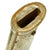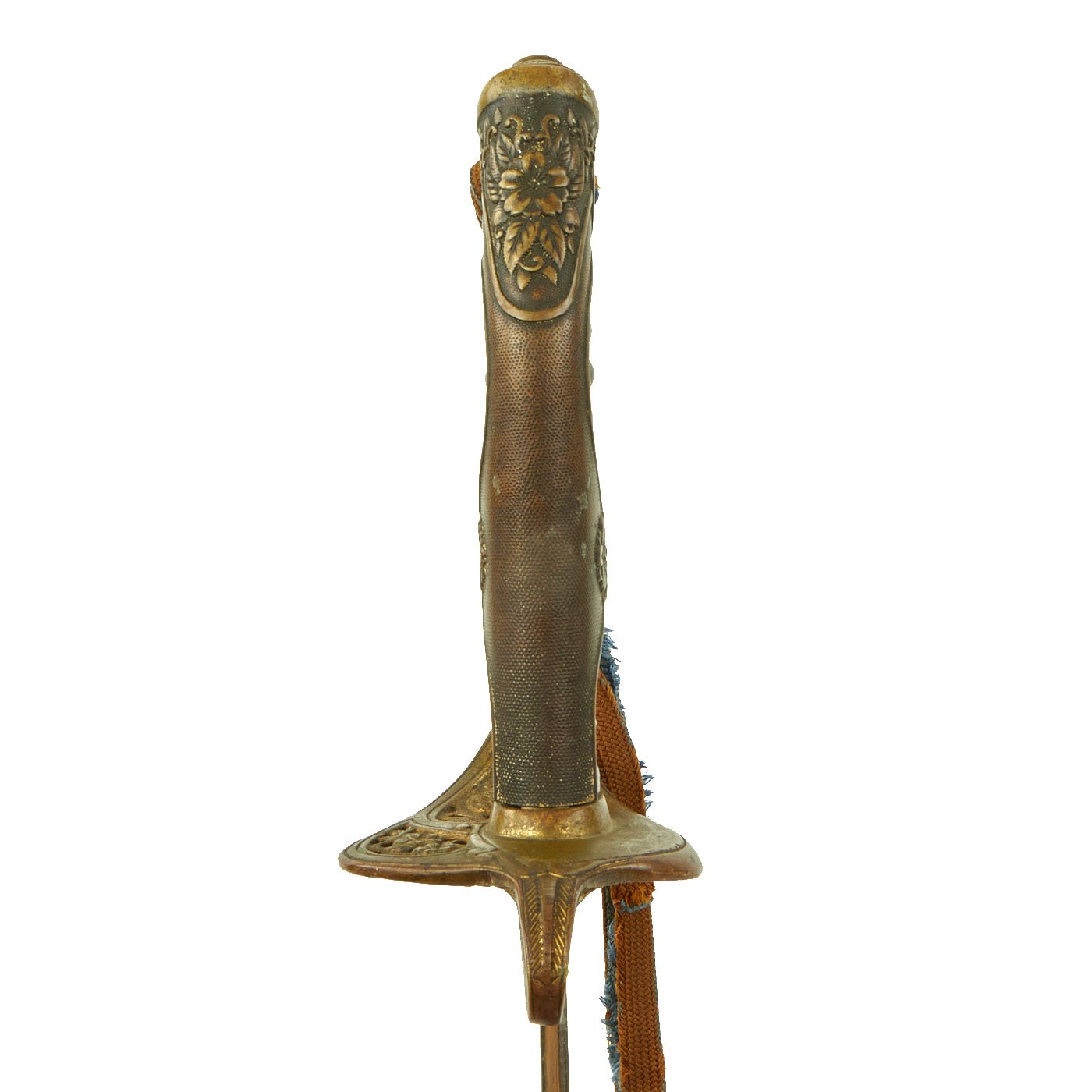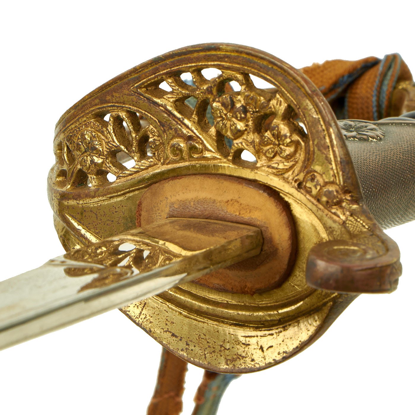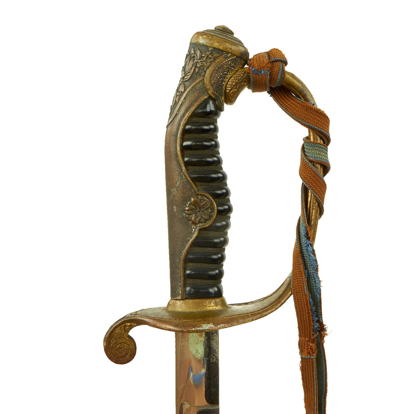 The hilt is an ornate cast brass example, with lovely cherry blossom and other floral motifs on the back strap. The metal originally fully plated and gilt, however it now has much of this worn away, with the rest faded to a lovely patina. It has the standard 10-petal Cherry Blossom emblem jutting out from the back strap on both sides, indicating Imperial Japanese Army use. It has the standard European-style "D" guard, as well as a very nice black celluloid covered grip, with the original brass wire binding fully intact. The original leather blade buffer is intact, though the hilt is somewhat loose on the tang.