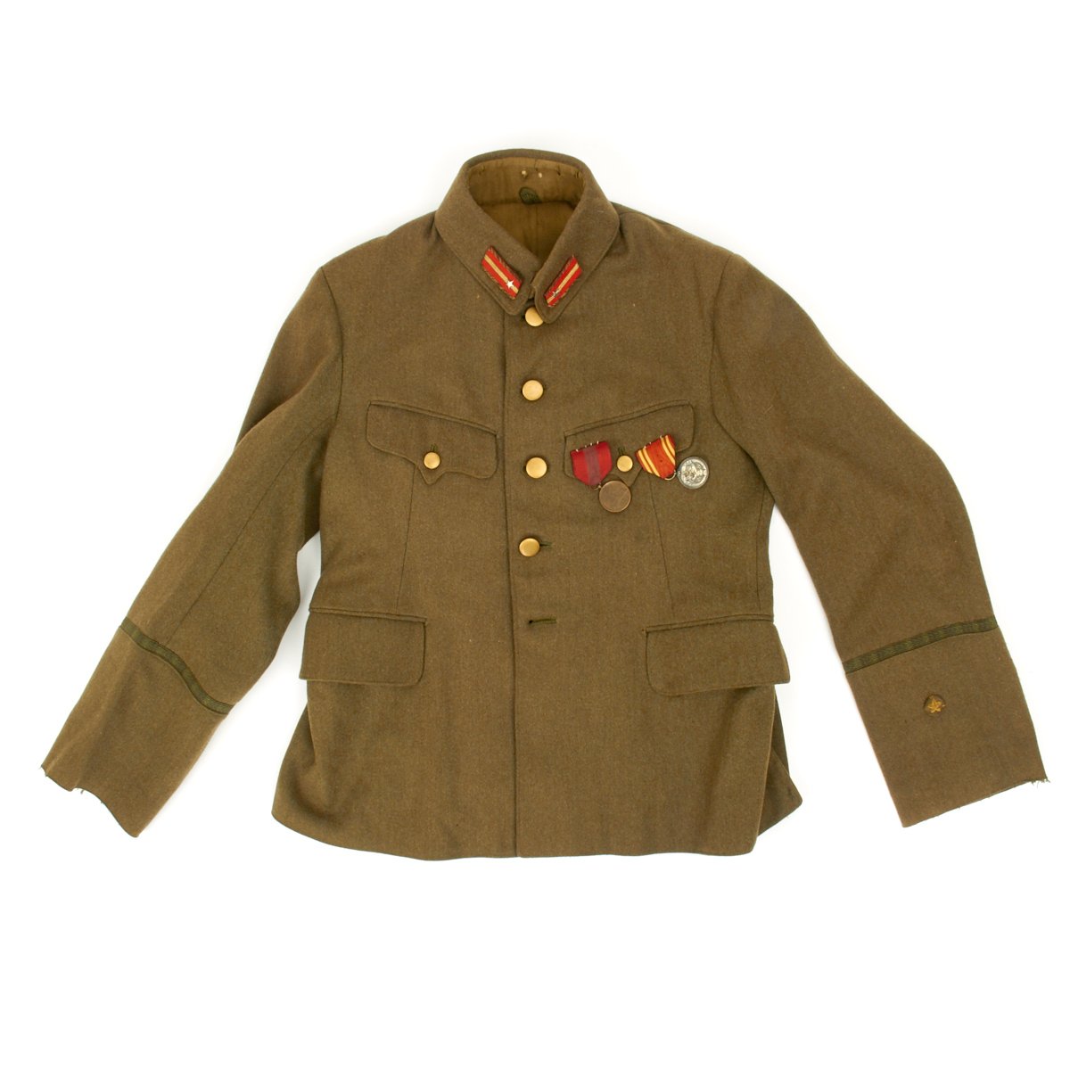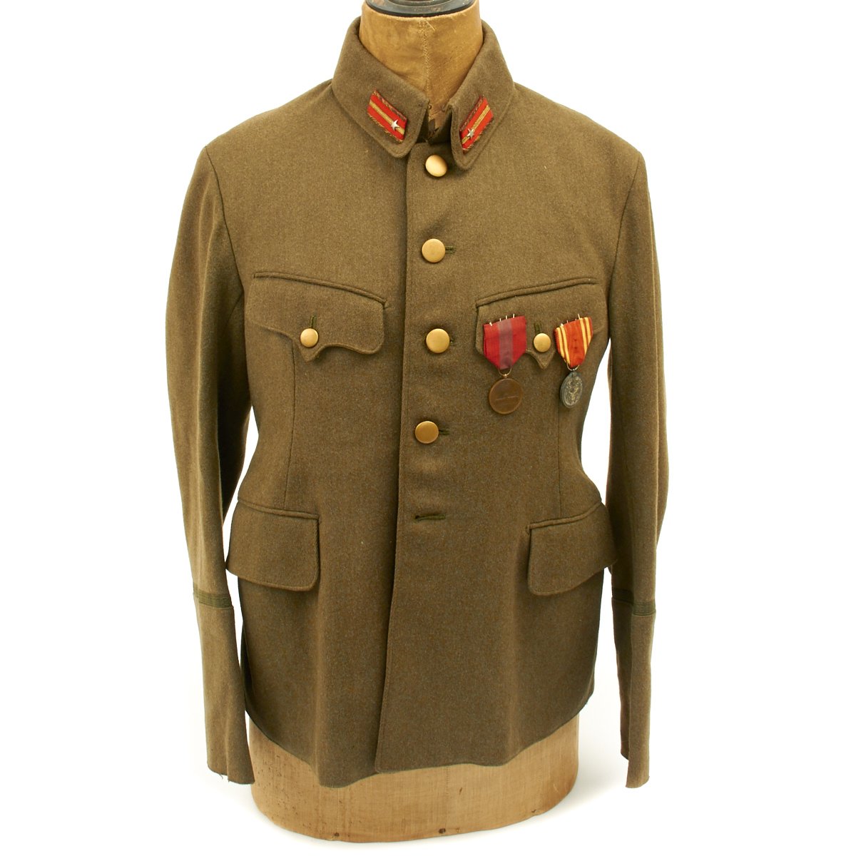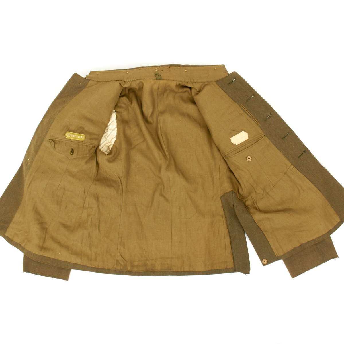 Original Item: Only One Available. This is a rare original WW2 Japanese Army Tailor Made Officer Uniform for a for a Second Lieutenant. The uniform is in excellent condition. The Tunic is of high quality construction, tight weave wool shell with soft cotton lining with brass buttons. Features Second Lieutenant collar tabs with a silver star. On the right breast there are two medals stitched in place. Original silk tailor label is stitched to the inner lining next to inner pocket on the front right. Size is approximately a 38" chest.