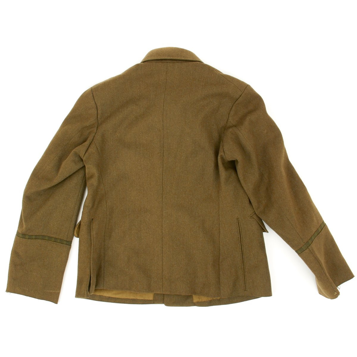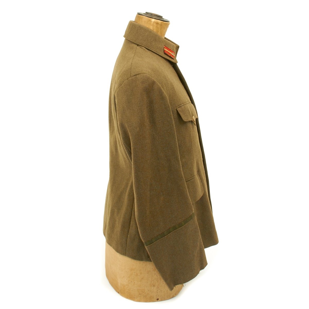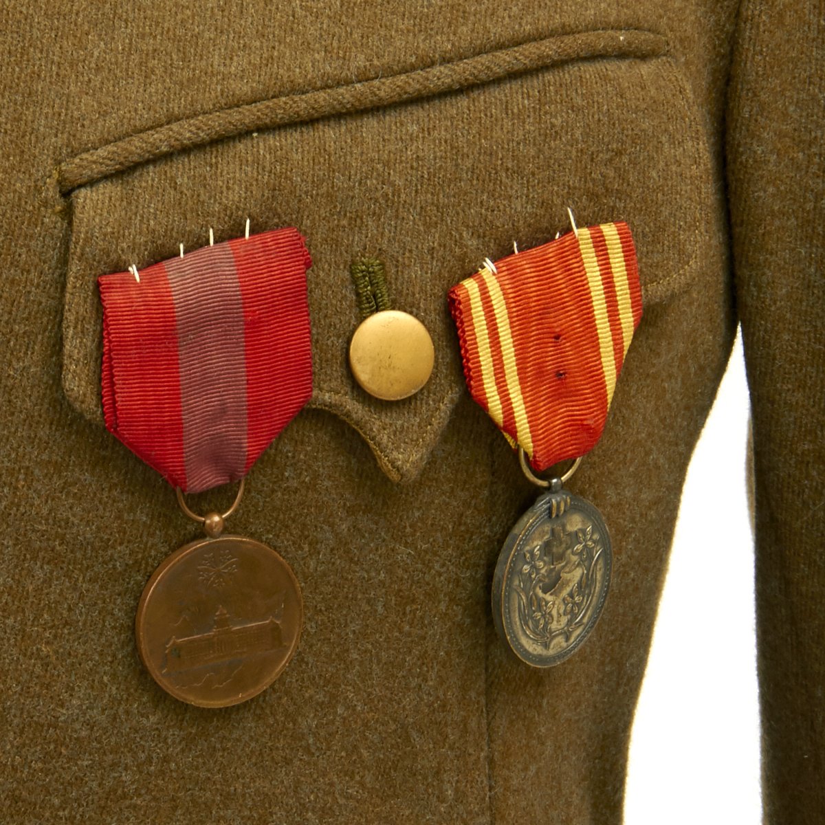 Original Item: Only One Available. This is a rare original WW2 Japanese Army Tailor Made Officer Uniform for a for a Second Lieutenant. The uniform is in excellent condition. The Tunic is of high quality construction, tight weave wool shell with soft cotton lining with brass buttons. Features Second Lieutenant collar tabs with a silver star. On the right breast there are two medals stitched in place. Original silk tailor label is stitched to the inner lining next to inner pocket on the front right. Size is approximately a 38" chest.