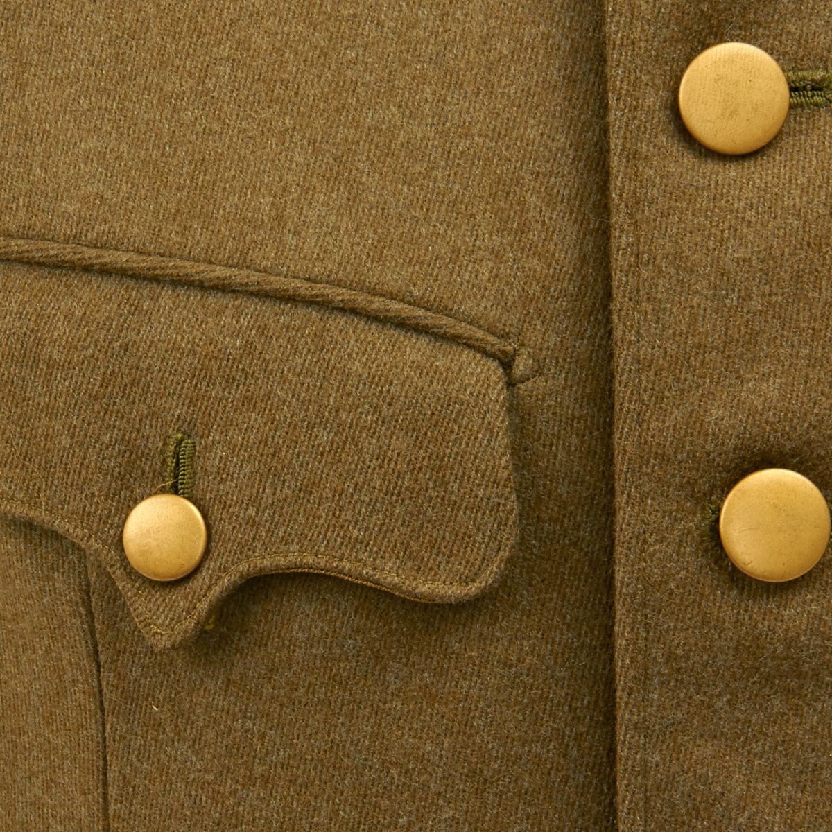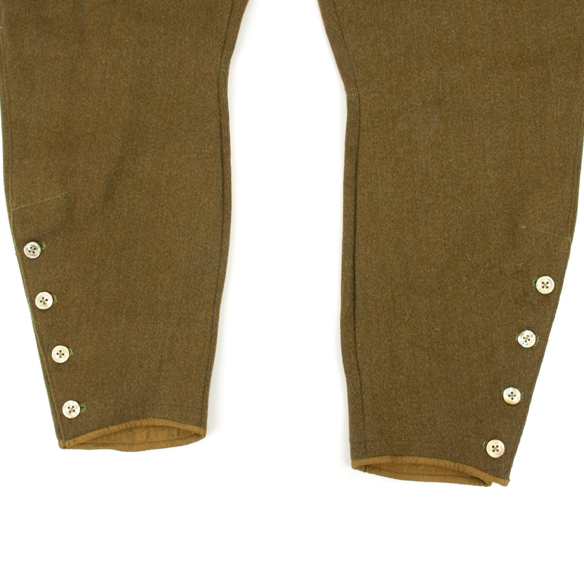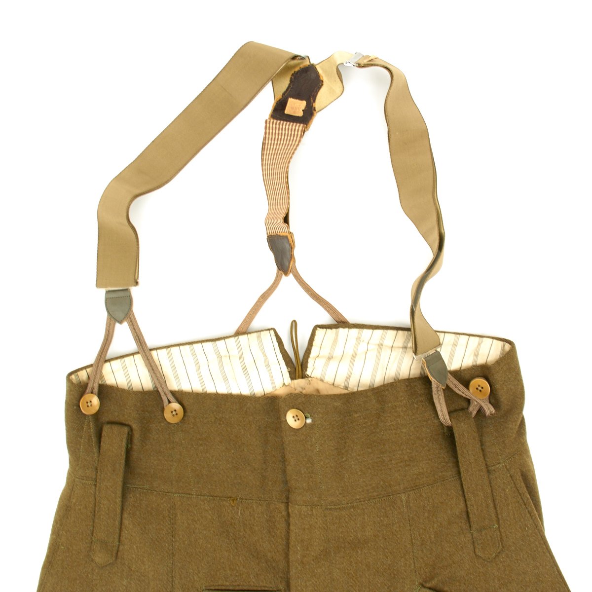 Jodhpurs style trousers are also very high quality, having a green tight woven wool shell, in classic lines. Features original suspenders and mother of pearl lower leg buttons.