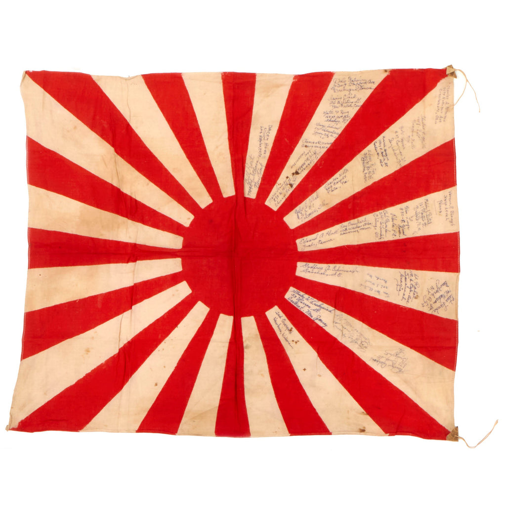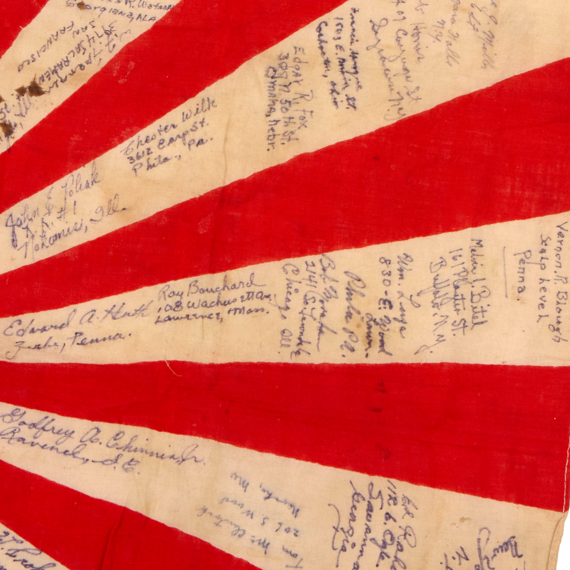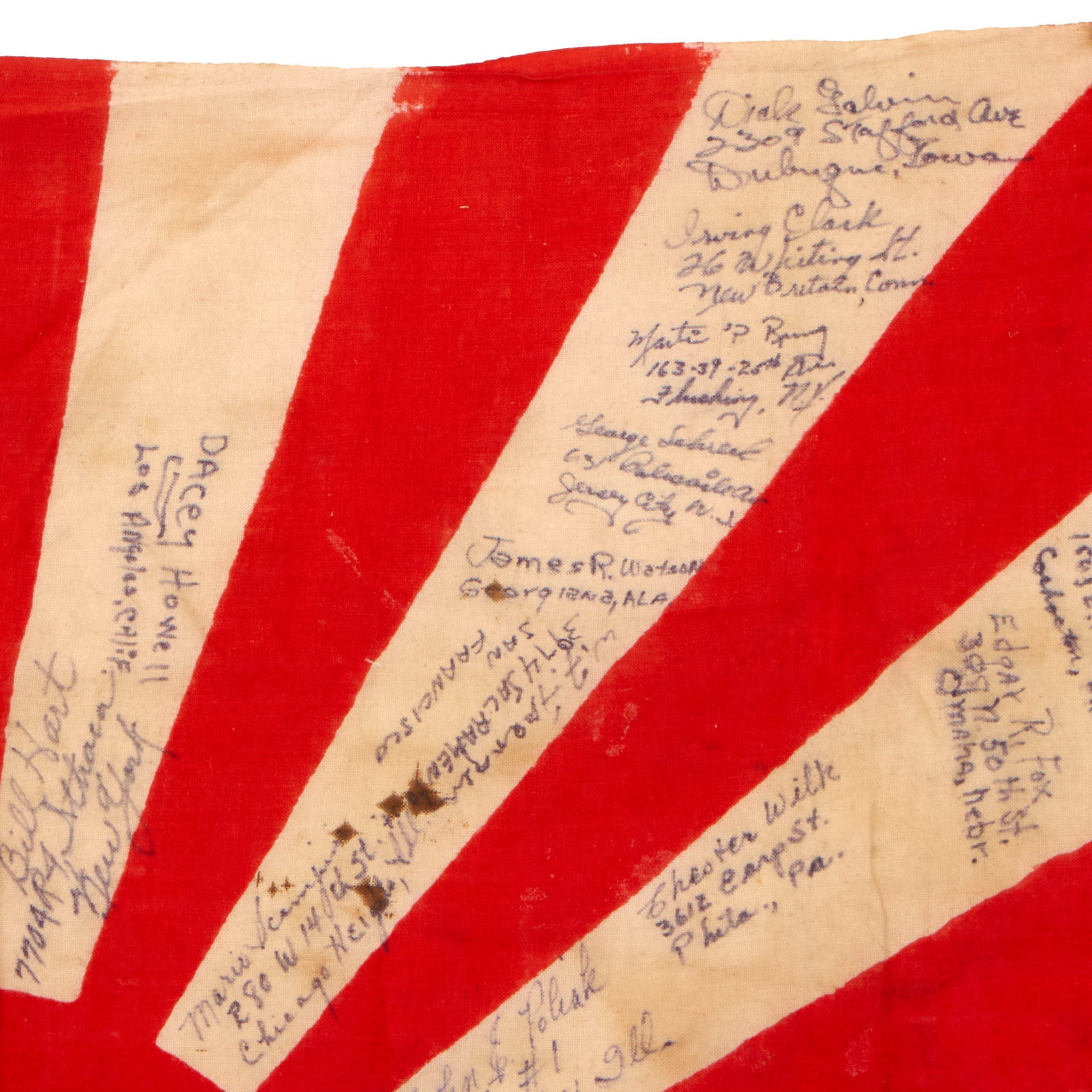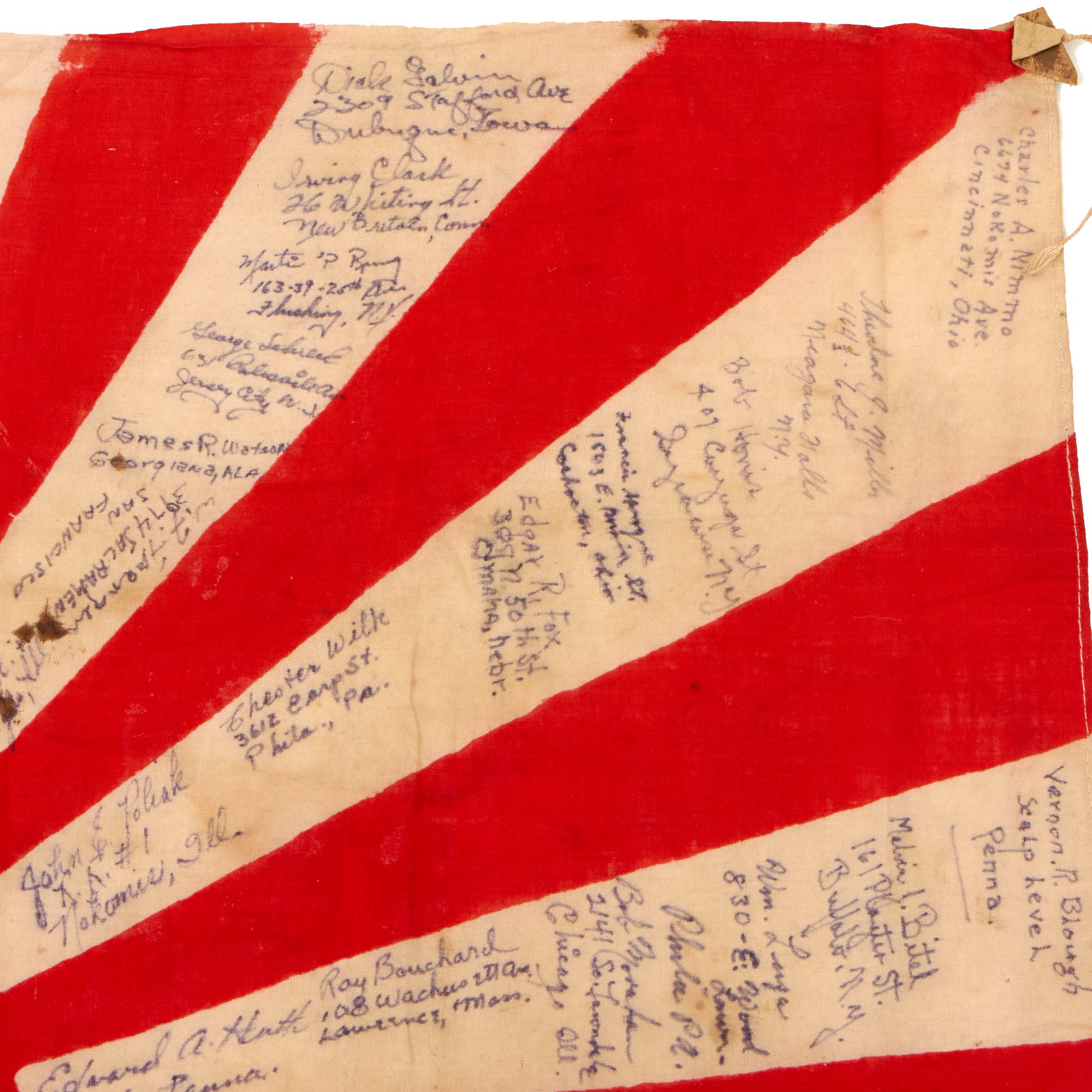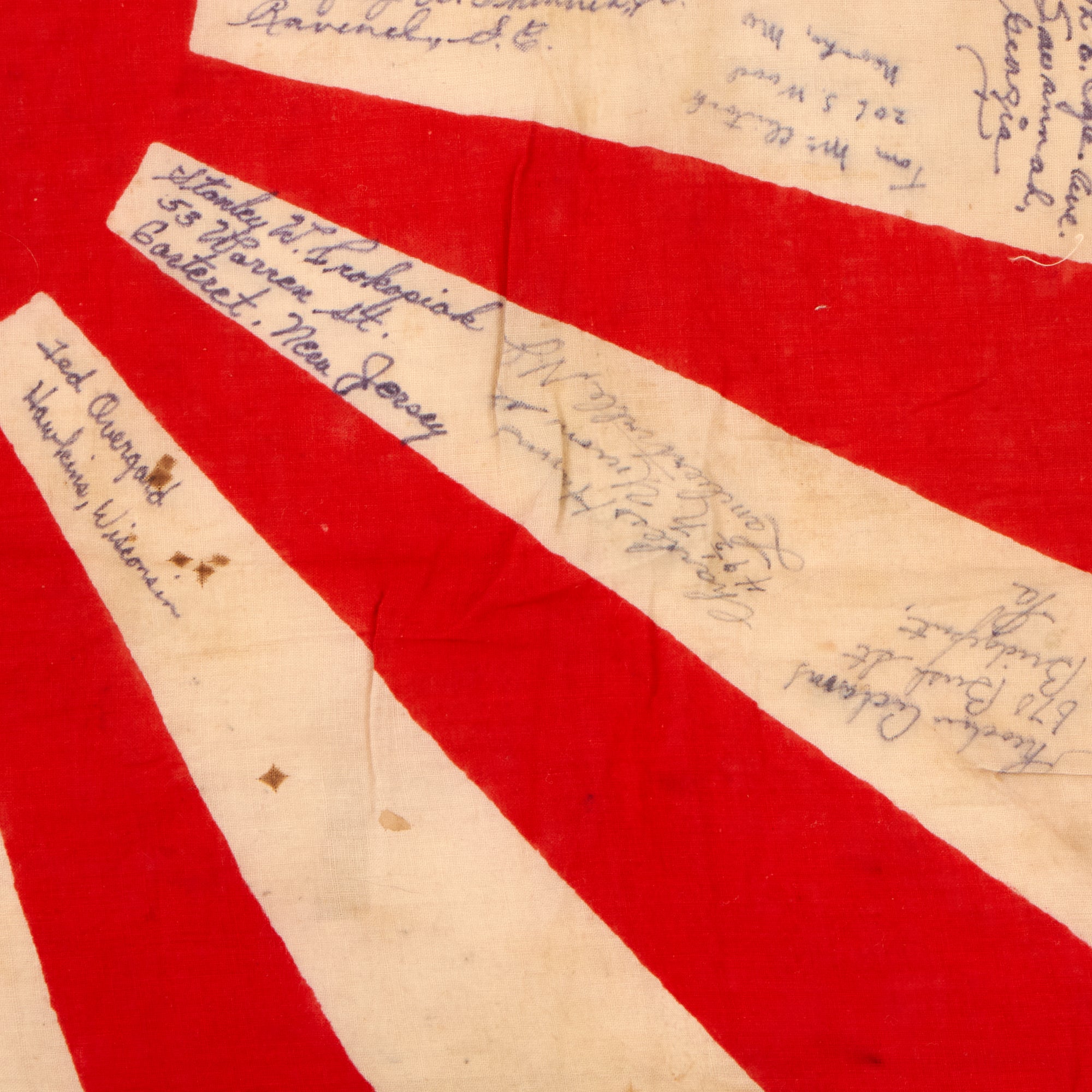 Original Item: Only One Available. This is an incredible Iwo Jima captured Imperial Japanese Rising Sun Flag. The flag itself was signed by 30 members of the 5th Marine Division, 8 of which we have positively confirmed as being present for the infamous Battle for Iwo Jima. The marines who signed also noted which cities they were from, making this an incredible research opportunity.