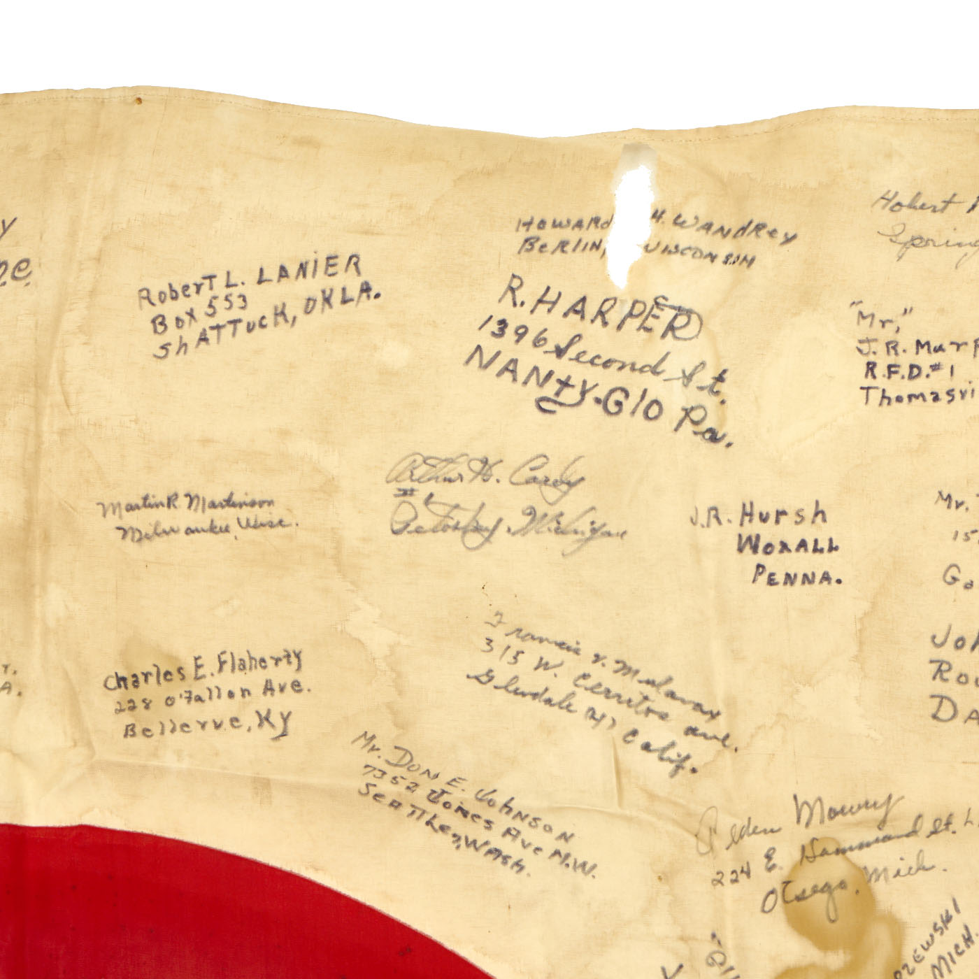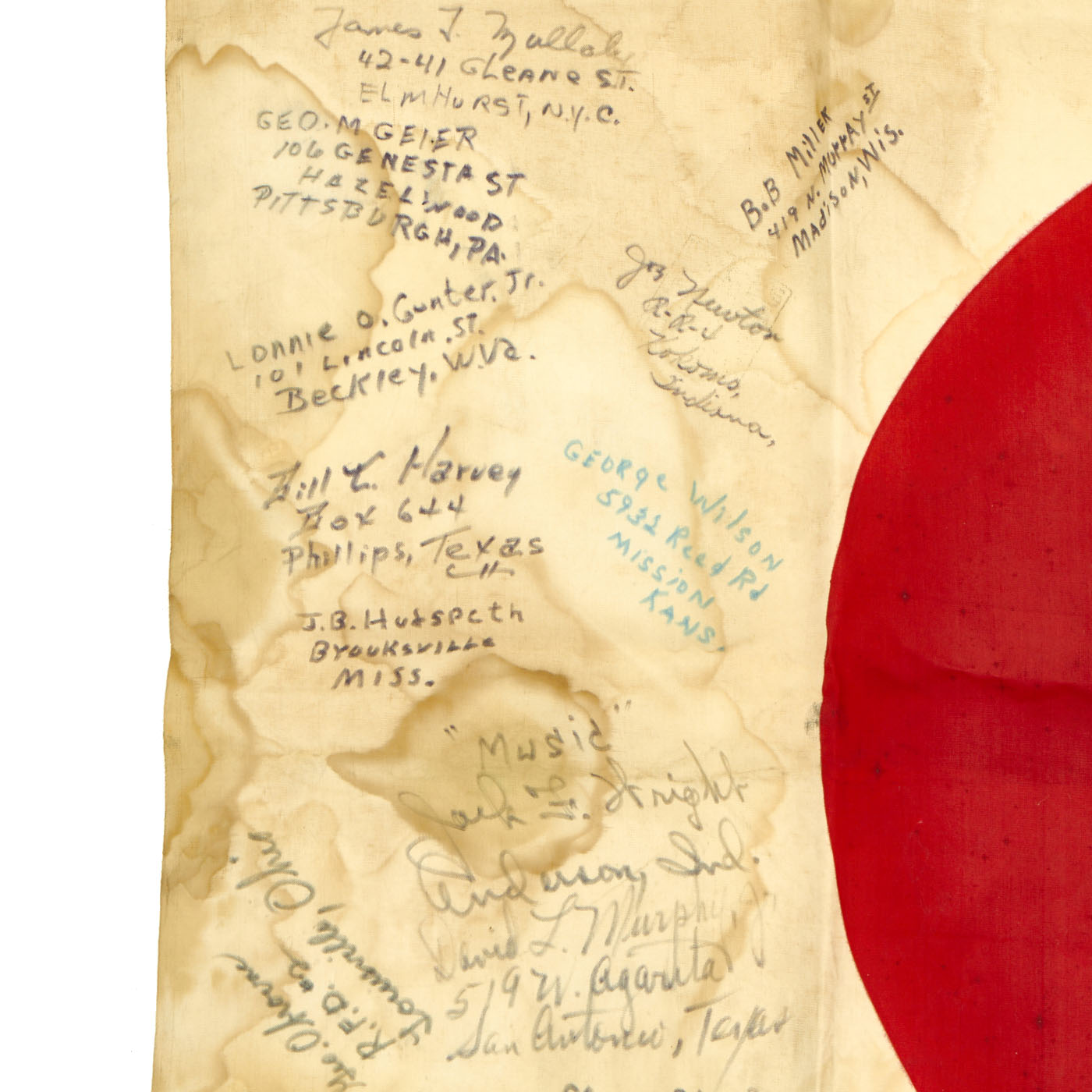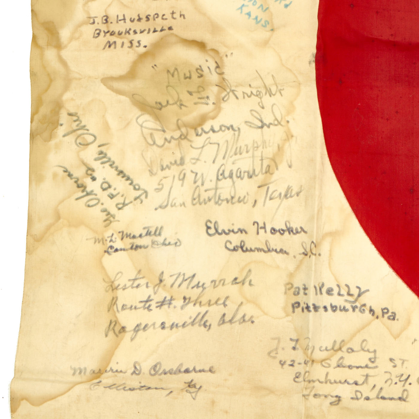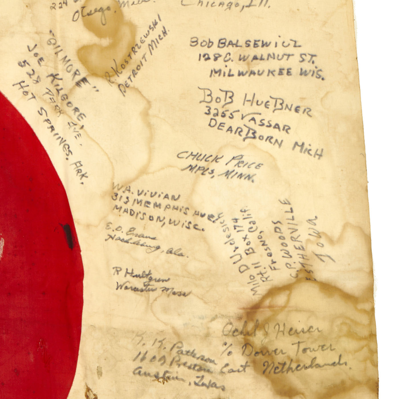 The flag is worn, tattered and stained but the decoration of the names of these brave heroes of Iwo Jima rekindle the beauty of the item. There are dozens of names written on the flag with their hometowns written beneath. We searched a few of the names and they were seen as serving with the 5th Marine Division during the same time as the legendary battle for Iwo Jima.