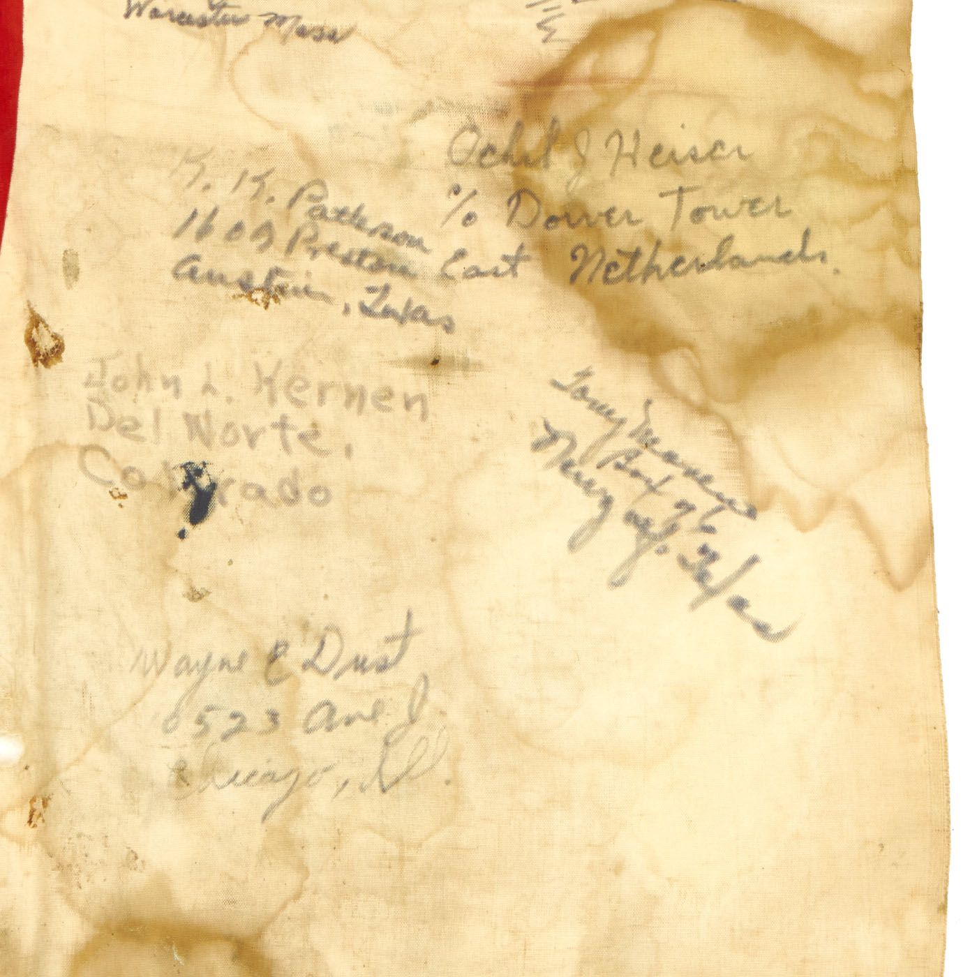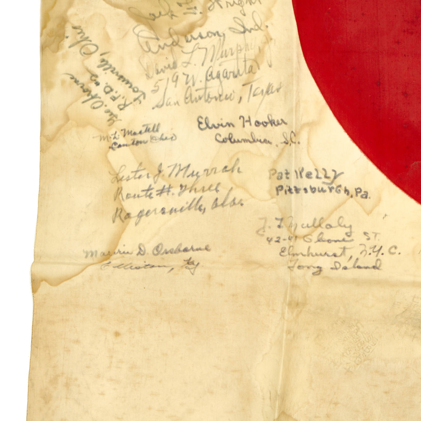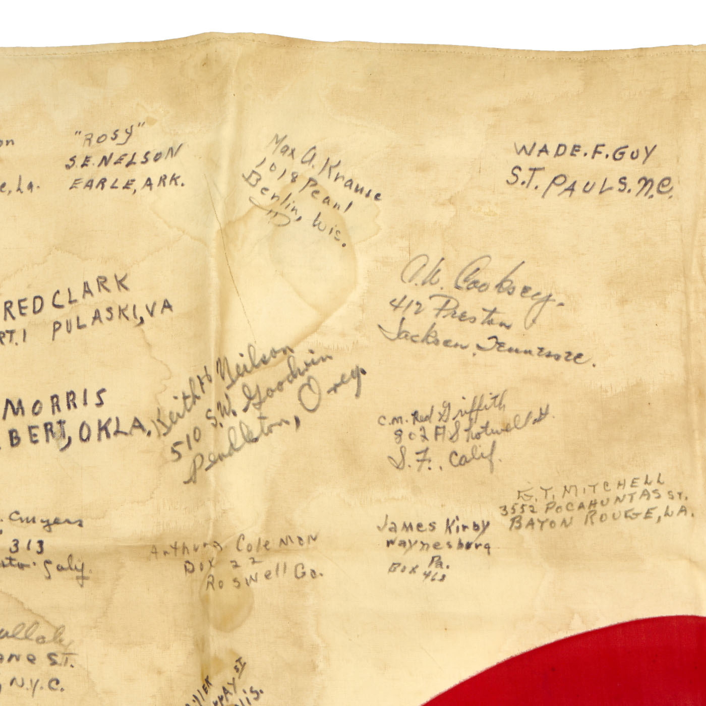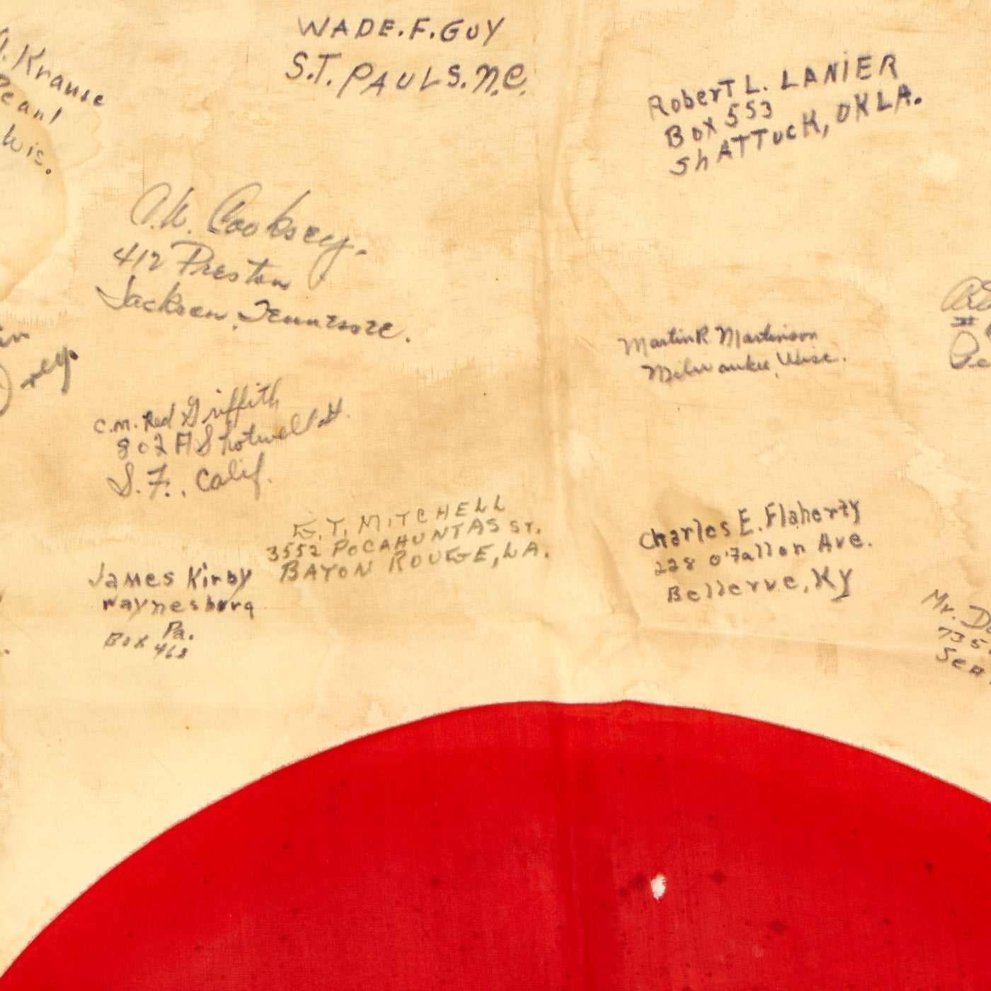 The flag is worn, tattered and stained but the decoration of the names of these brave heroes of Iwo Jima rekindle the beauty of the item. There are dozens of names written on the flag with their hometowns written beneath. We searched a few of the names and they were seen as serving with the 5th Marine Division during the same time as the legendary battle for Iwo Jima.