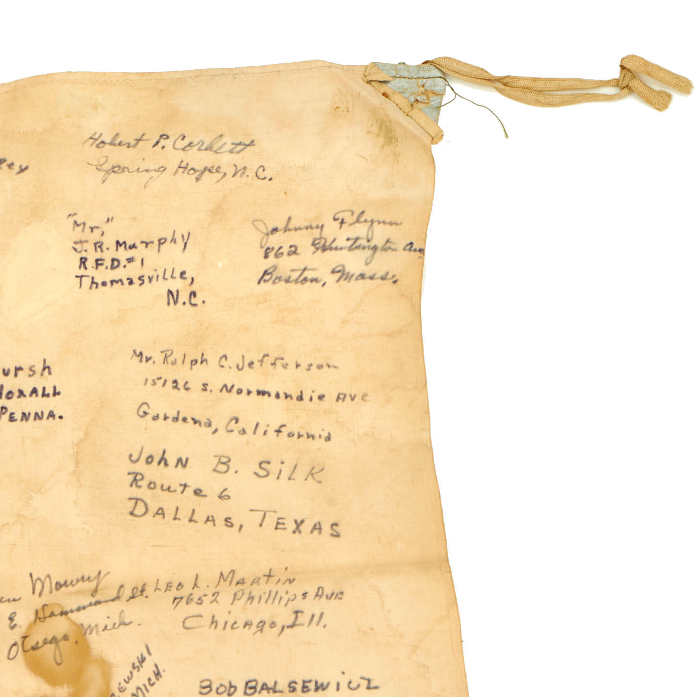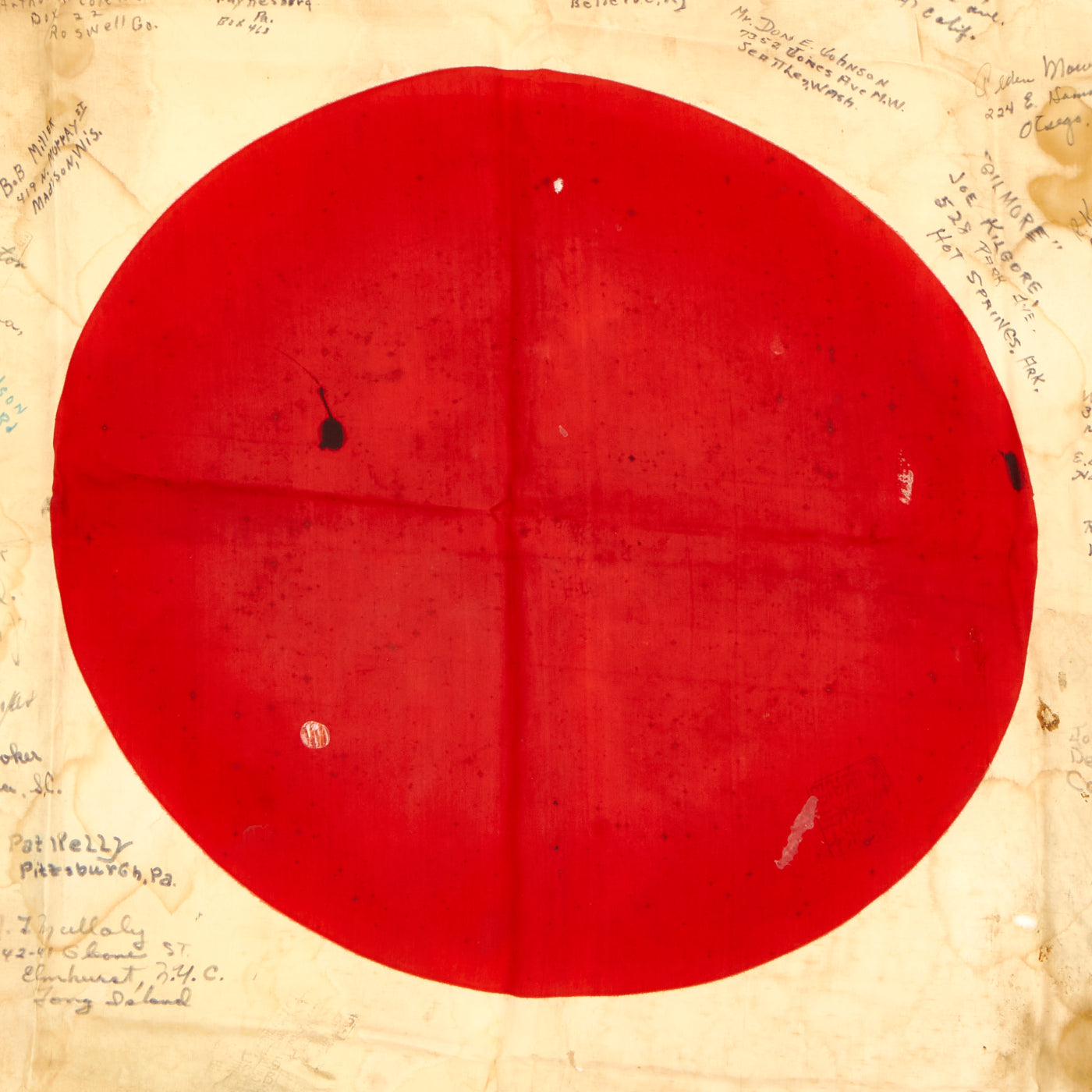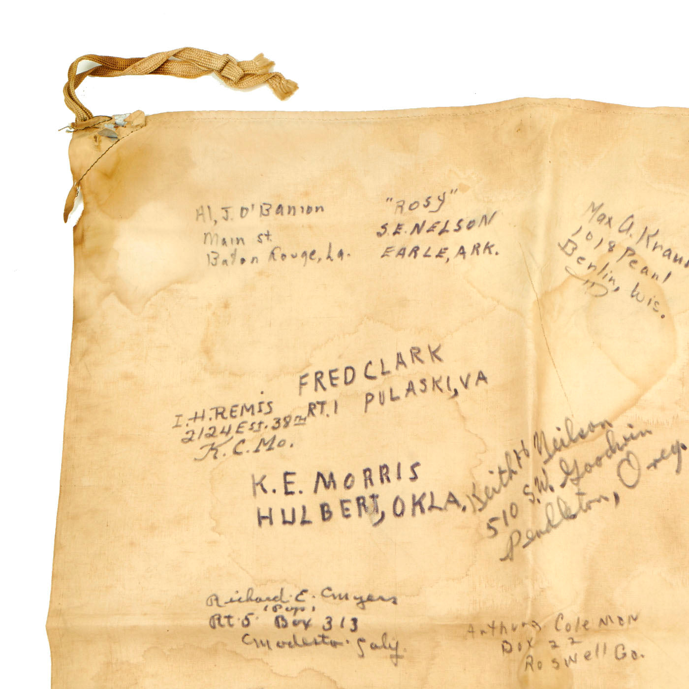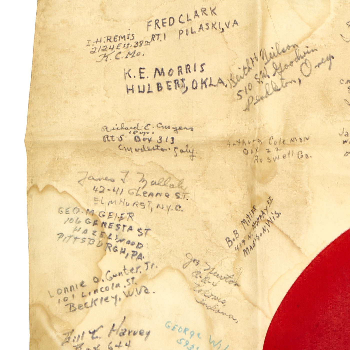 The flag is worn, tattered and stained but the decoration of the names of these brave heroes of Iwo Jima rekindle the beauty of the item. There are dozens of names written on the flag with their hometowns written beneath. We searched a few of the names and they were seen as serving with the 5th Marine Division during the same time as the legendary battle for Iwo Jima.