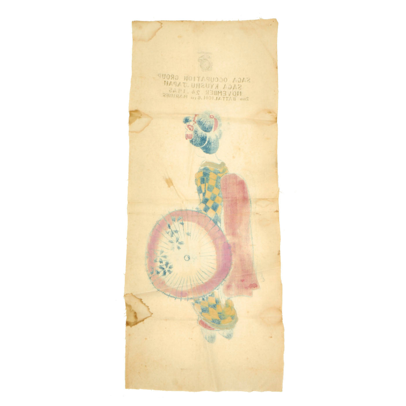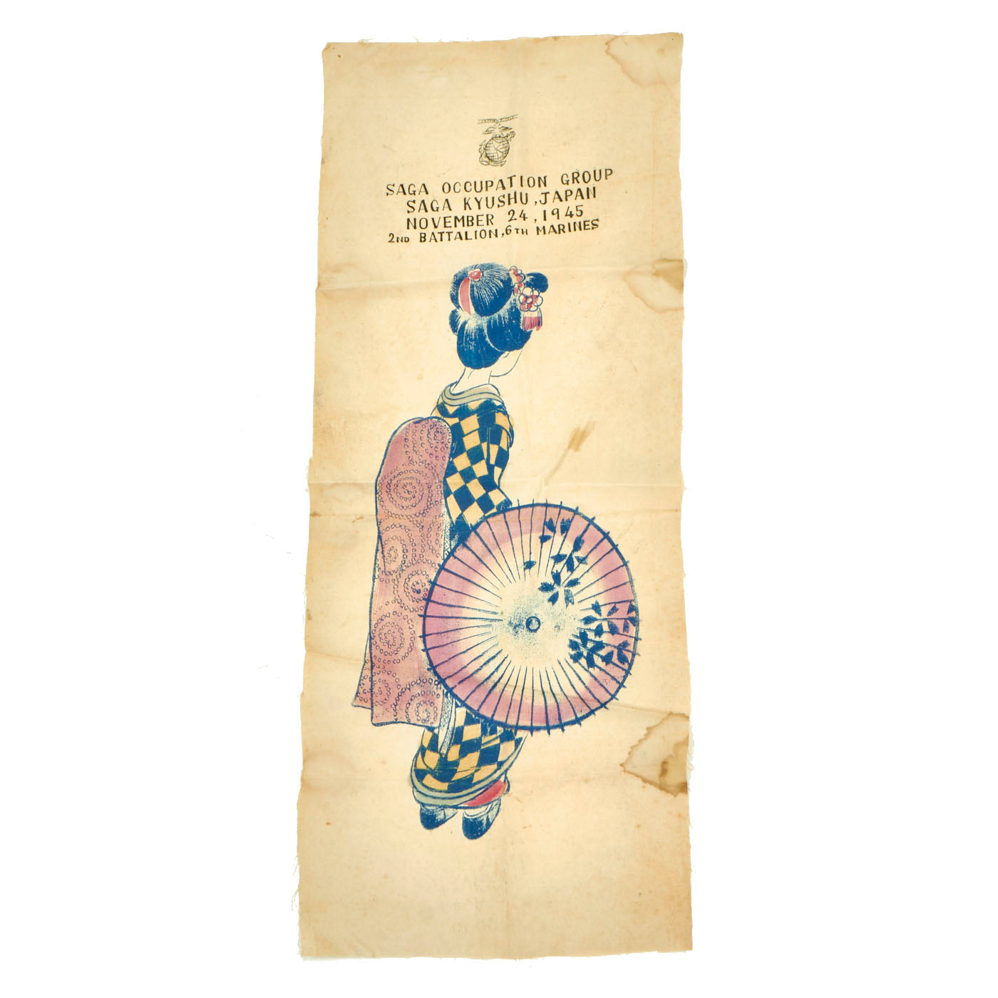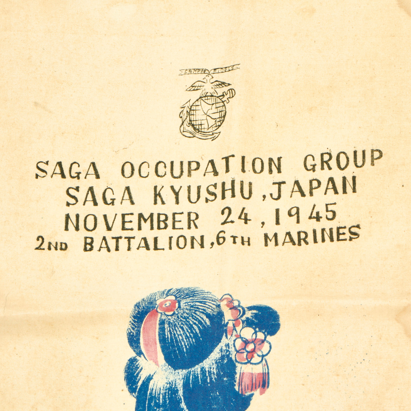 Included with this legendary flag is a 6th Marines signed “Geisha” banner from the occupation of Japan. The banner measures 30”L x 12”W.